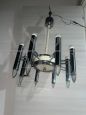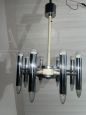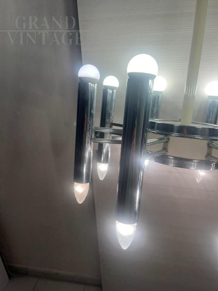 Beautiful chandelier by Gaetano Sciolari with 16 lights in metal partly chromed and partly cream lacquered, in magnificent space age style, Italian mid-century modern design, with a height of 90 cm, and a diameter of 50 cm.