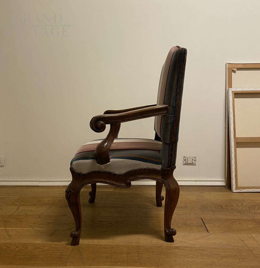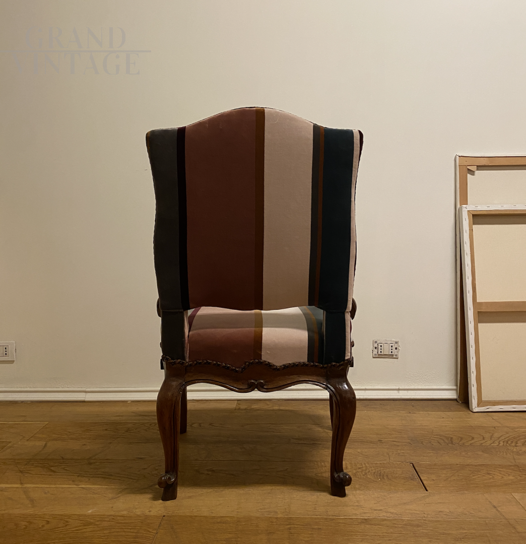 Antique 17th century baroque armchair in walnut with floral carvings, upholstered in modern velvet with colored stripes. In perfect condition, recently restored both in the wooden part and in the padding and covering.
