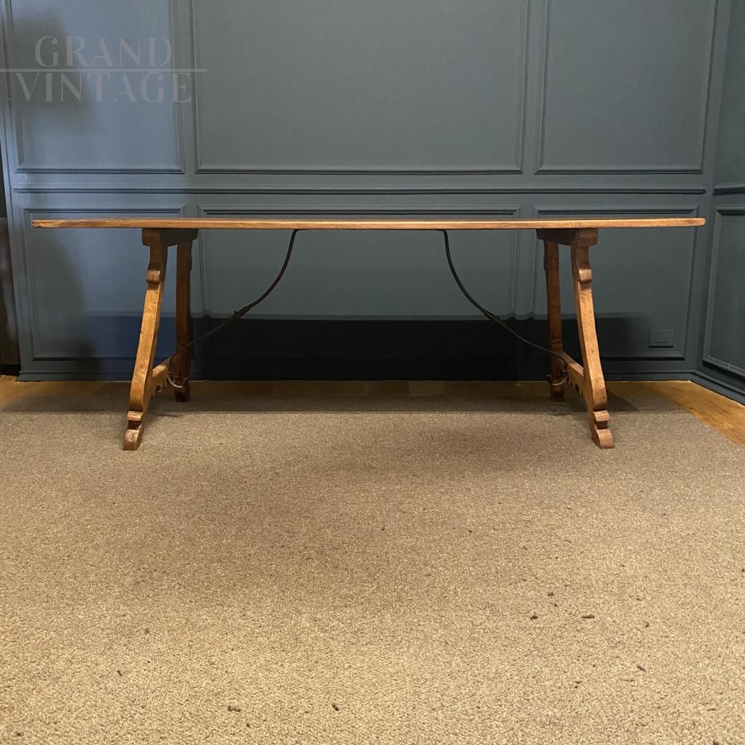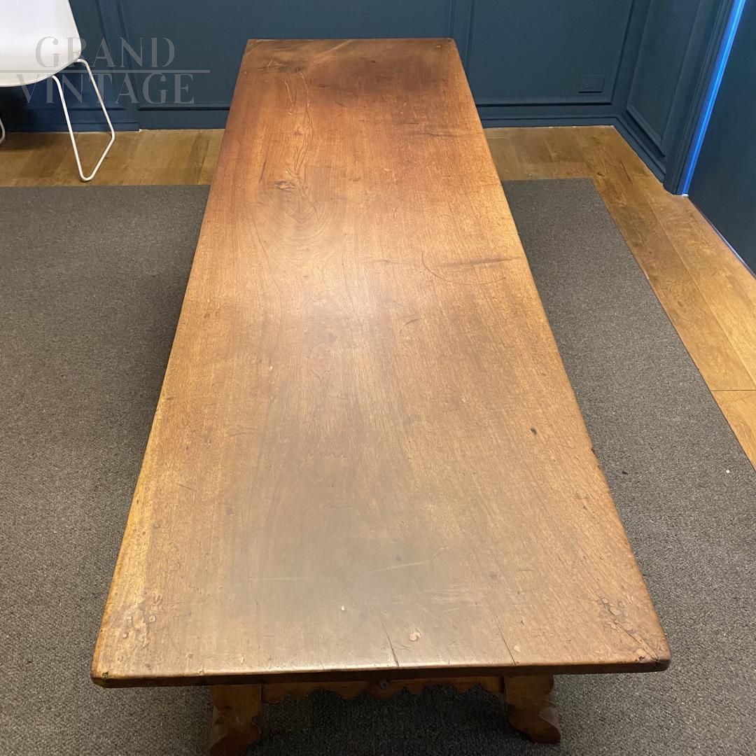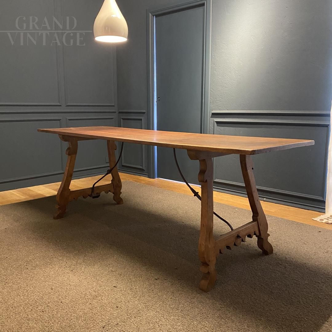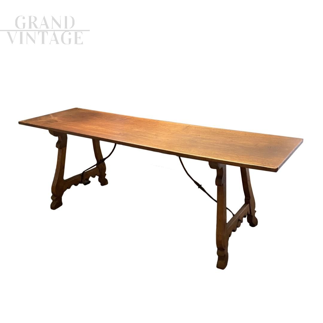 17th century Lombard refectory table in walnut. The top is made from a single walnut board and has a beautiful patina. The lyre legs have an elegant shape and are supported and bound to the top by a wrought iron support which is also original to the piece. Recently restored by an expert restorer.