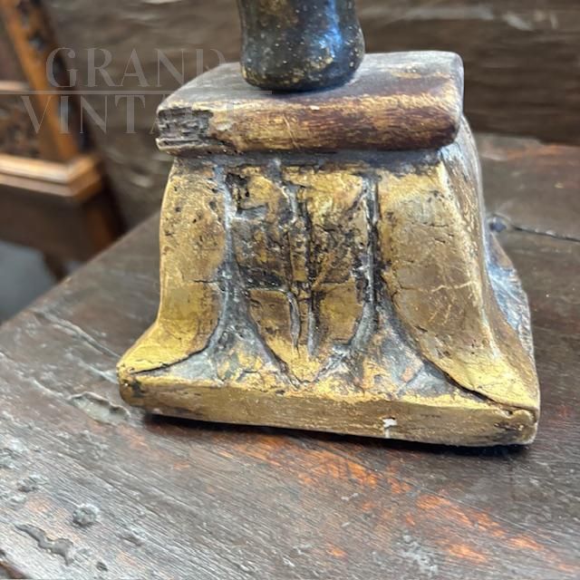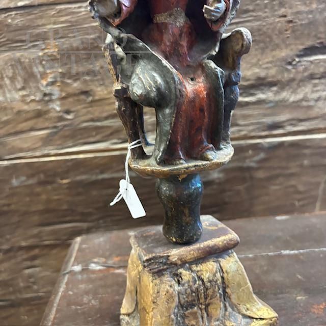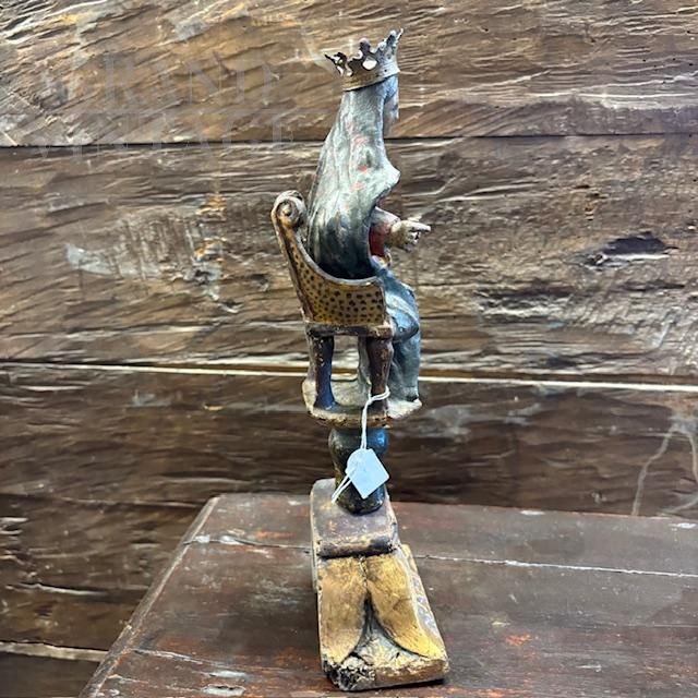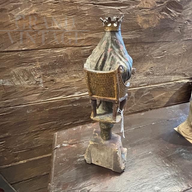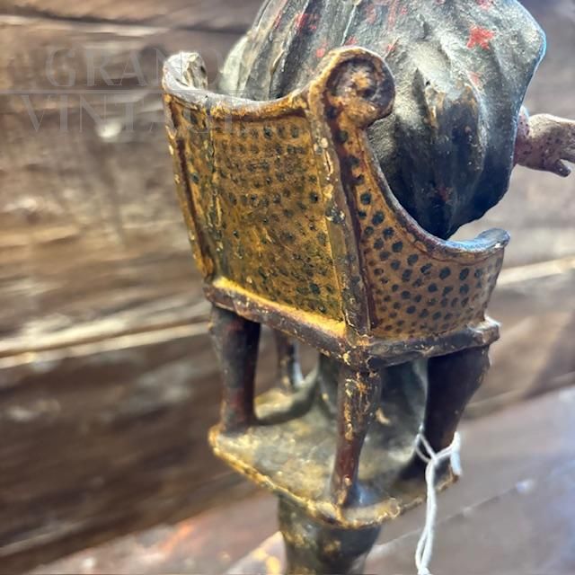 An antique and rare polychrome wooden sculpture depicting a queen or Madonna on a throne, made in the 16th century. It was probably the end of a staff. Very beautiful, 35 cm tall including the gilded base, in good condition, with natural signs of age.