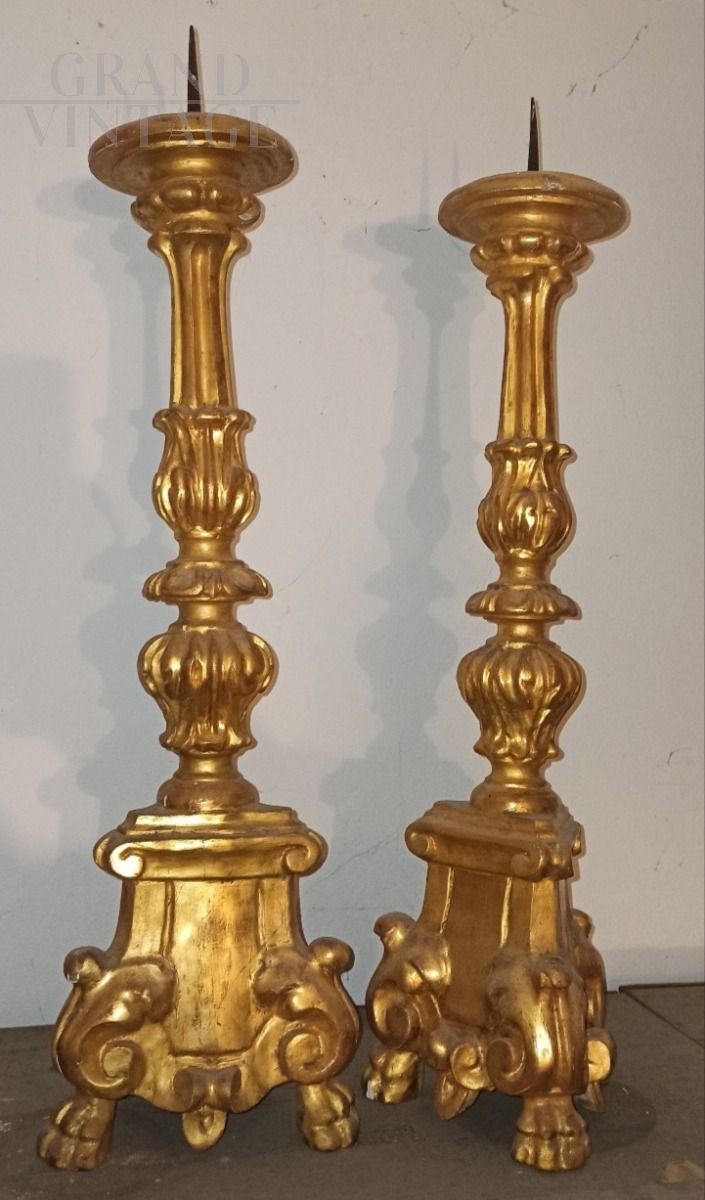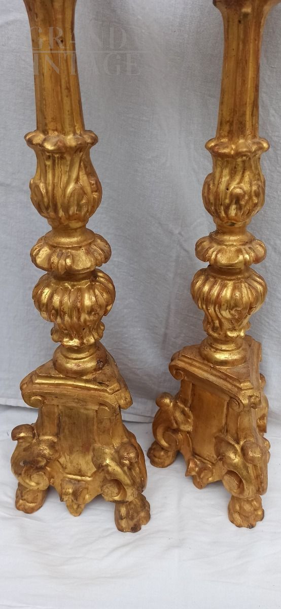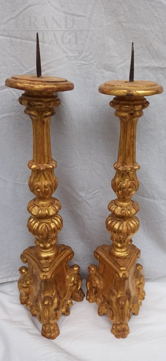 Pair of antique eighteenth-century candlesticks, rare in type as they are centerpieces, carved on all three sides, and are also entirely gilded with gold leaf on all sides.
