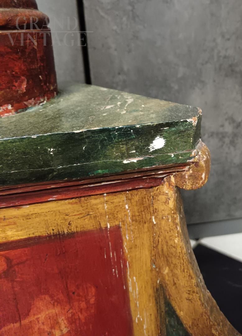 A magnificent 18th-century Italian-made floor-standing candlestick from an ancient Roman nobleman's home. Finely decorated and electrically powered, the wax drips from the old candles are still visible in some places. A few years ago, a craftsman had the "fan" sail made as a lampshade. A wonderful piece!! Made of wood with a plaster overlay and then painted. It shows natural signs of age.