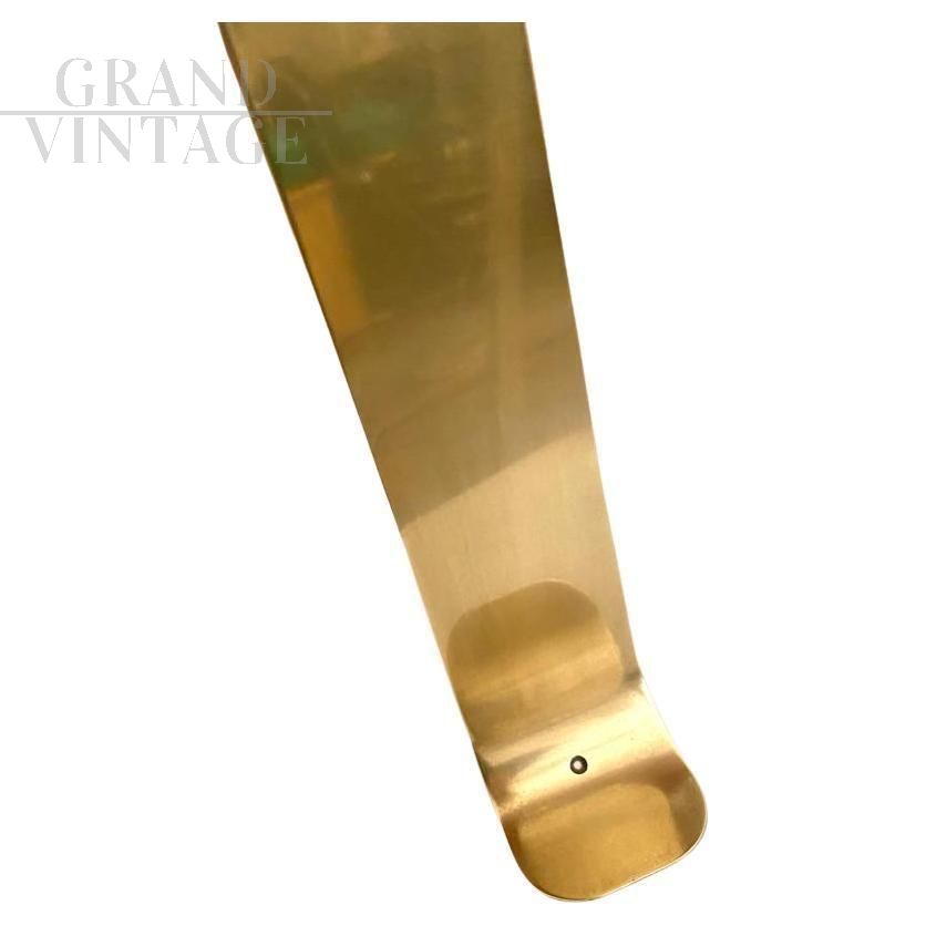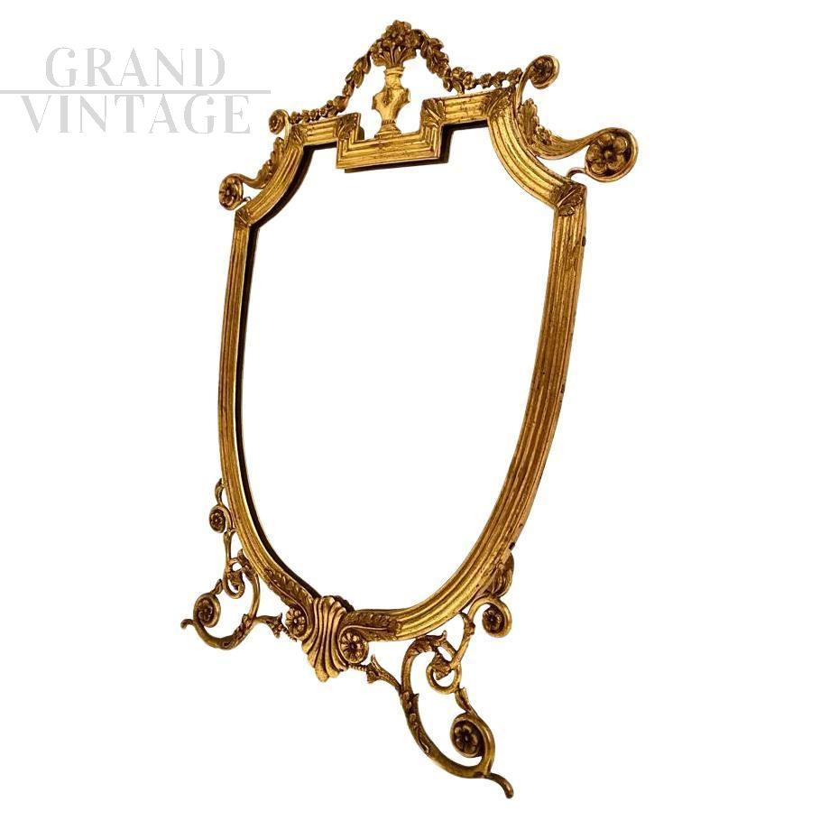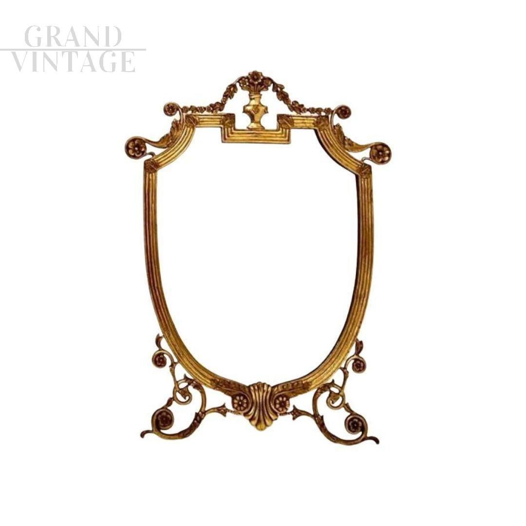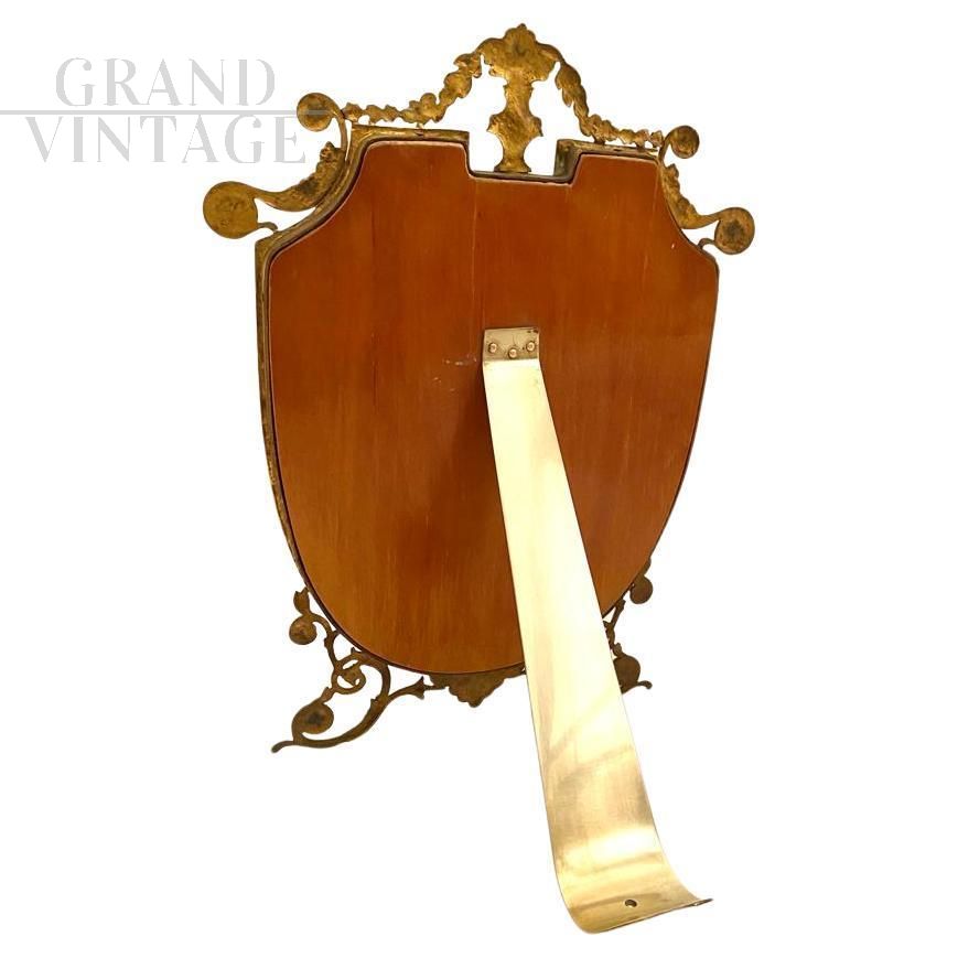 Rare Art Deco brass table mirror, made in Italy in the 1920s, with original glass, rear side of the mirror in wood veneer with beech wood. Brass holder on the back with hole to fix the mirror to the wall if necessary. In excellent condition, with few signs of aging.