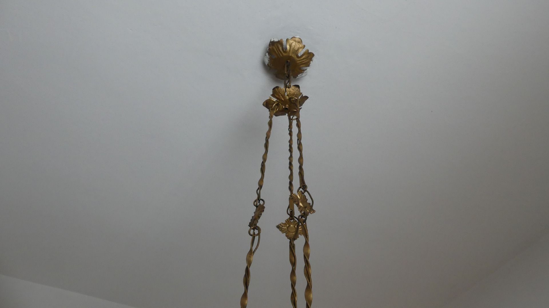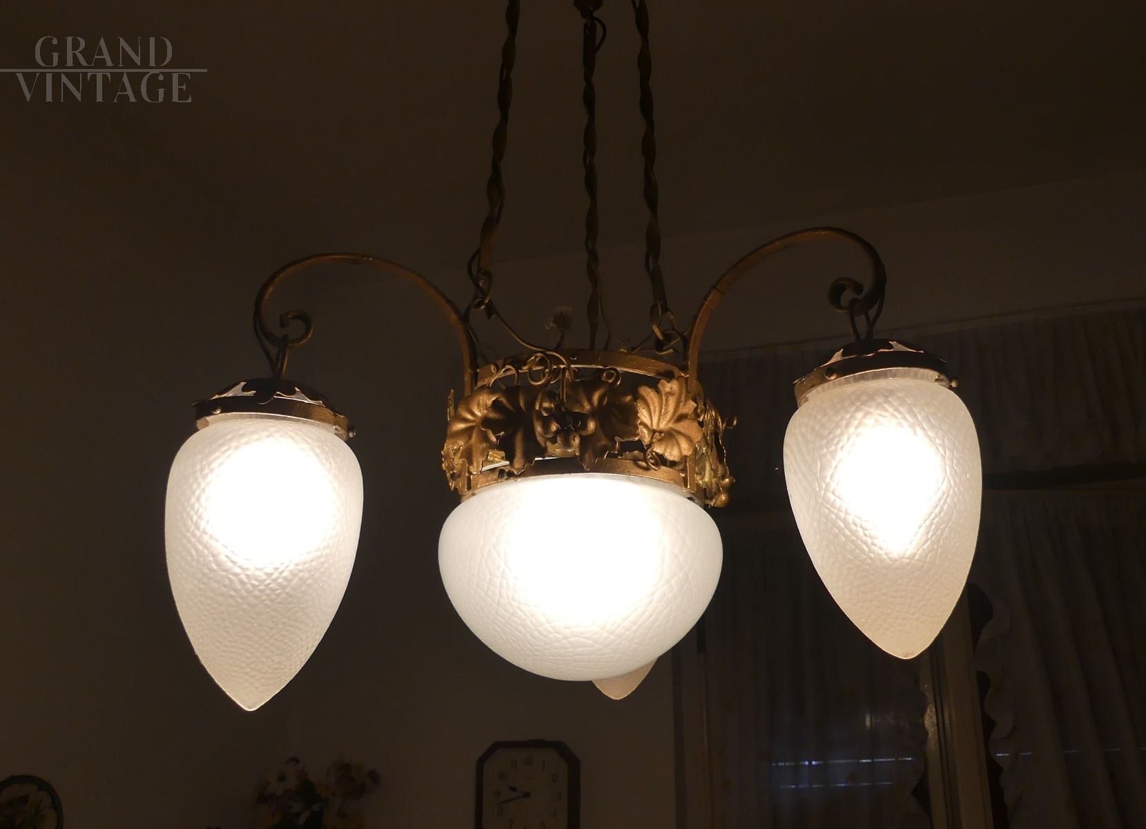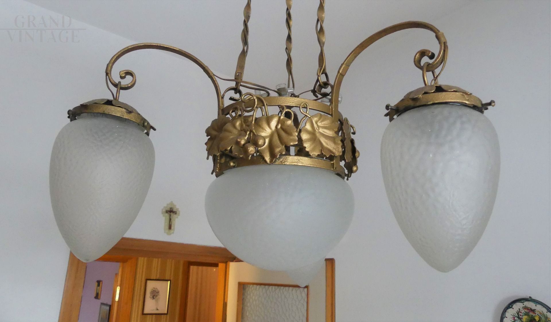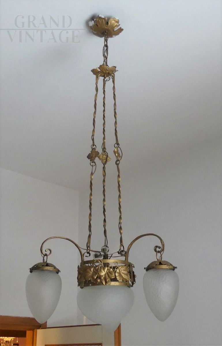 Beautiful Art Déco chandelier in wrought iron, 1920s, lacquered in golden color, recently restored, with three side lights around a central light, for a total of 4 lights. Shades in frosted and slightly knurled glass. In excellent condition.