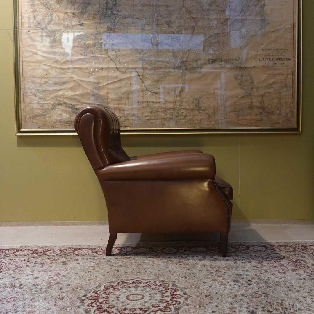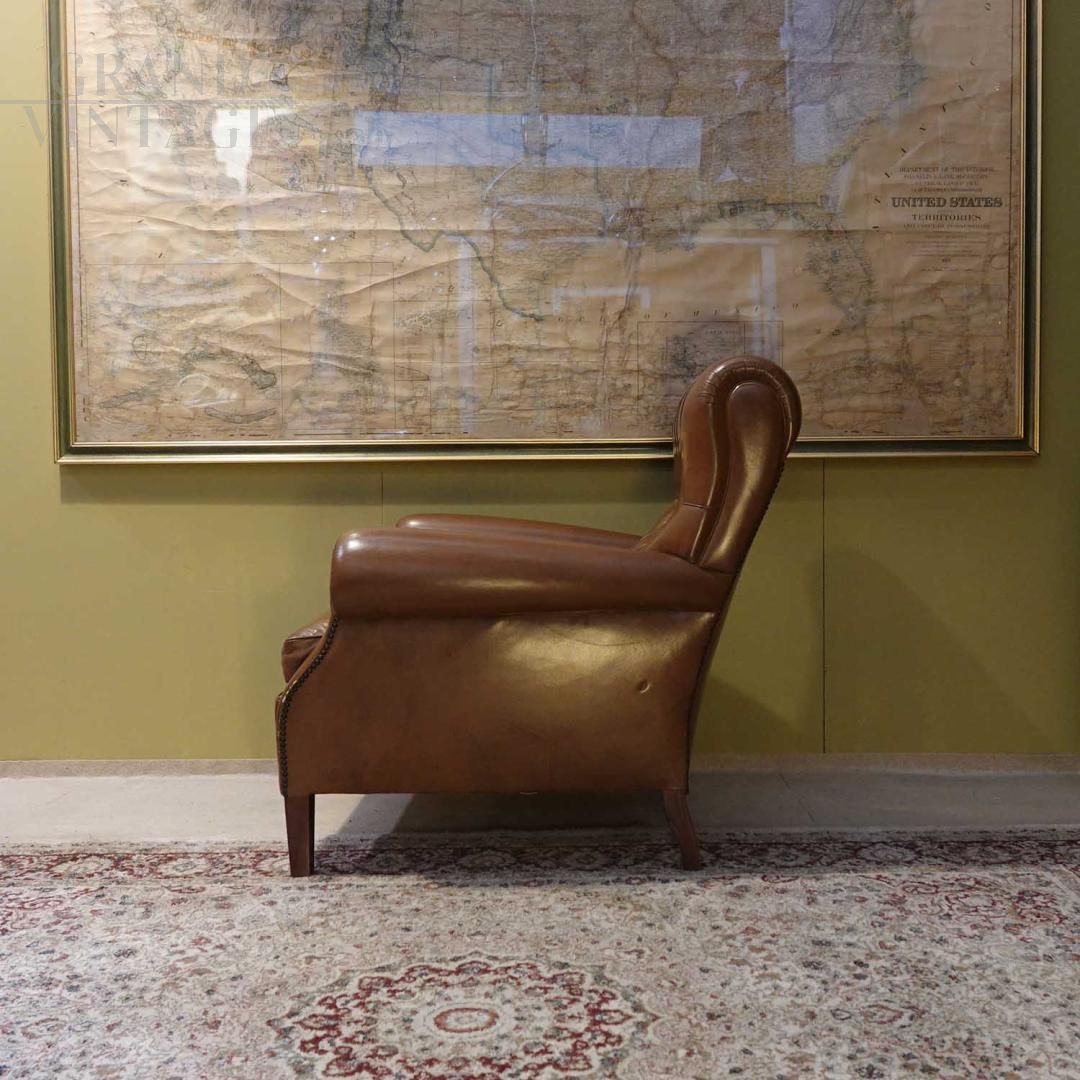Authentic 1920s brown leather armchair, with a worn patina that tells stories of times gone by. The sturdy lines and compact design make it a piece full of charm, perfect for Art Deco or industrial environments or for those who want a piece of furniture with a strong historical personality.