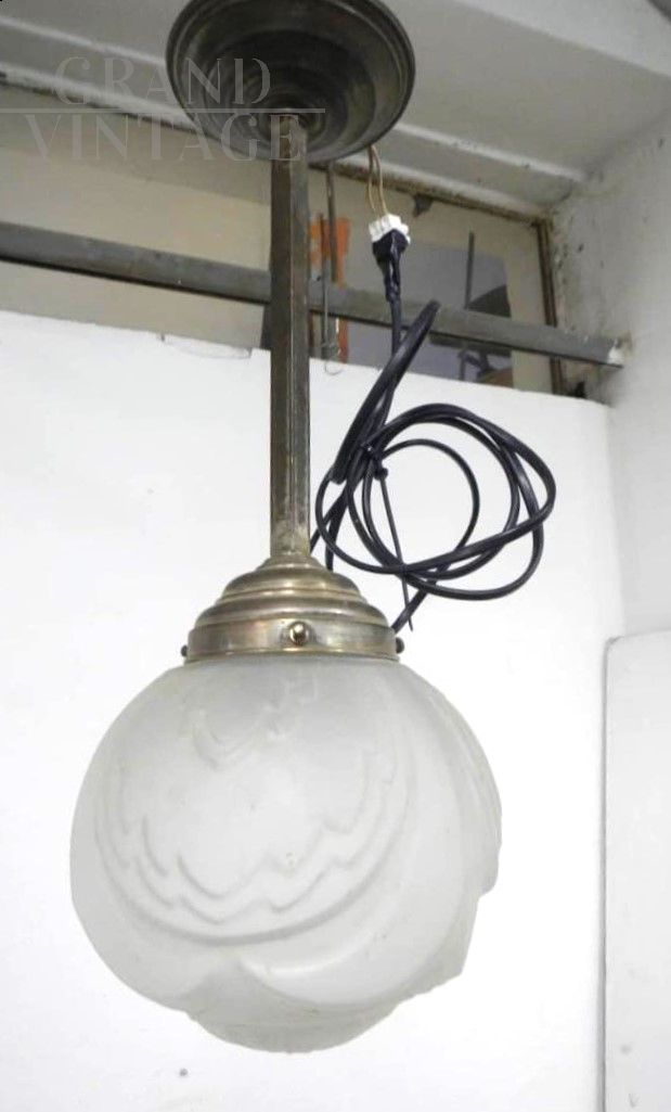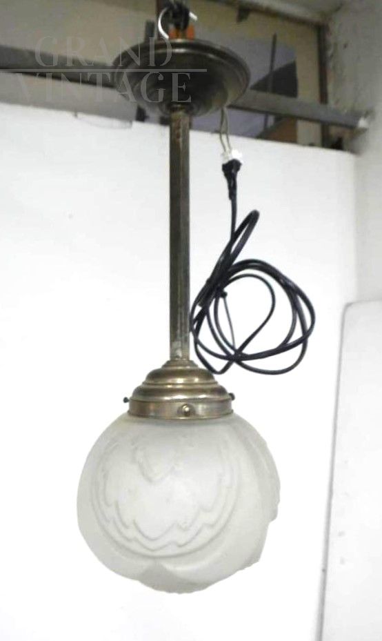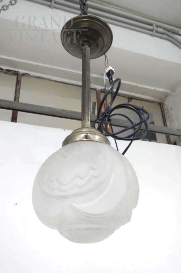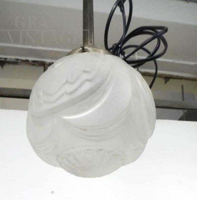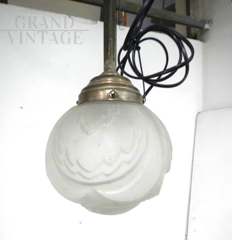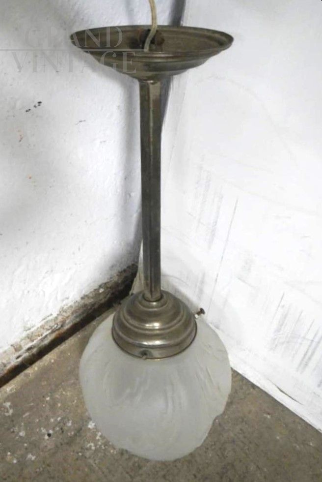 1920s art nouveau pendant light in opal glass with bud decoration and aluminum structure, working, in good condition with E14 bulb attachment.