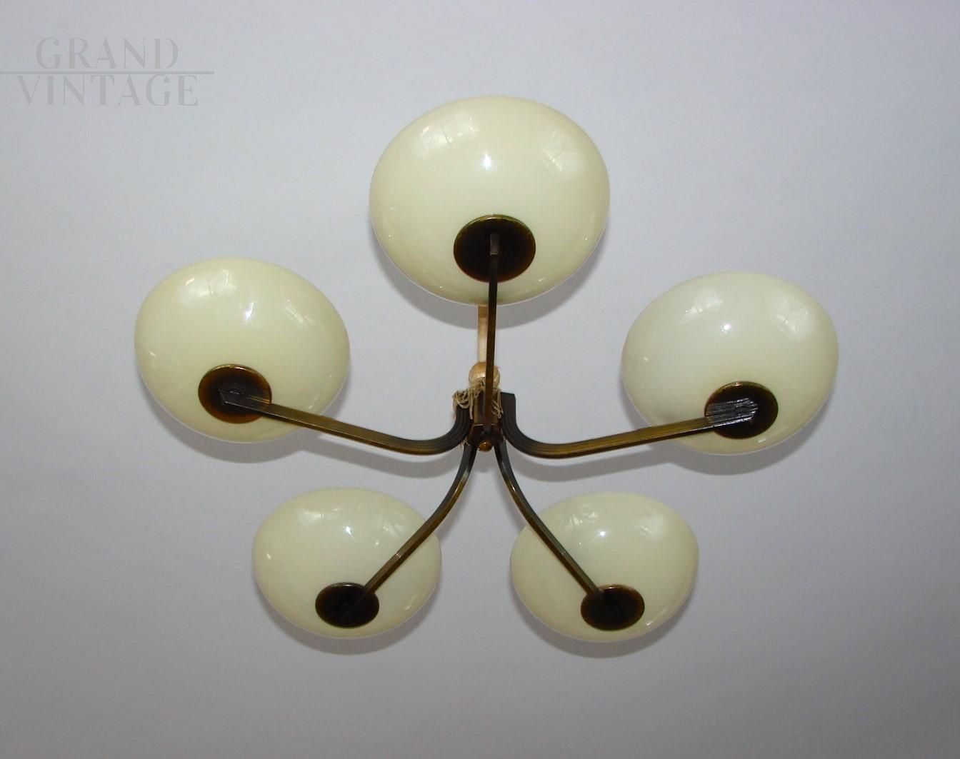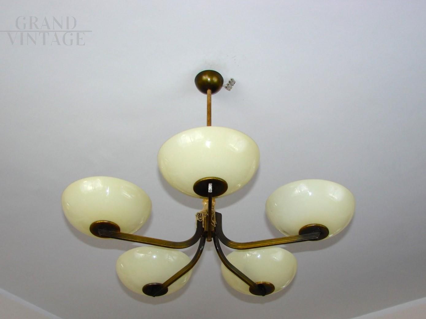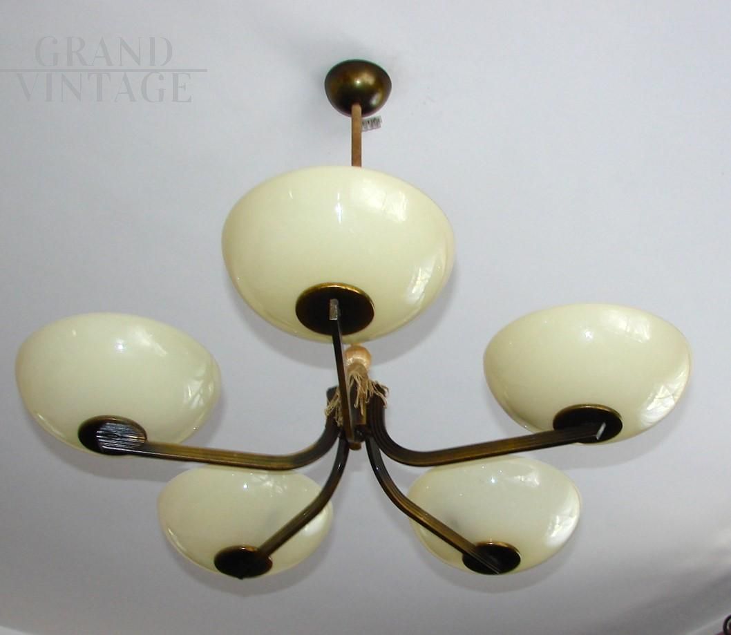1930s Polish art deco chandelier in brass with 5 lights with glass bowl shades, preserved in good original condition, working with 5 E27 type bulbs.