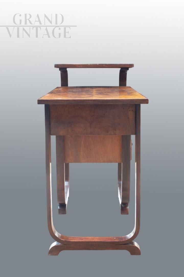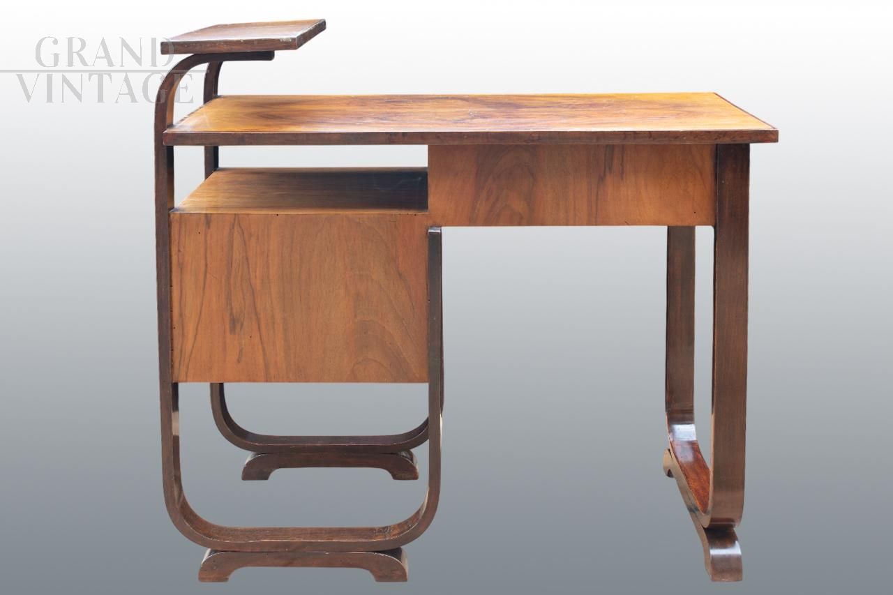 Art Deco desk from the 1930s veneered in walnut with a raised top, the handles are ebonized and the legs have a beautiful curved shape. Totally restored, the desk has missing keys.