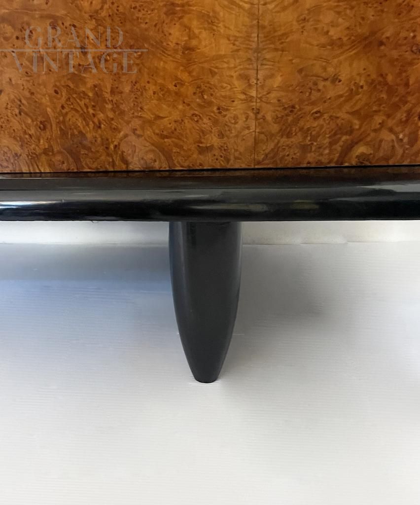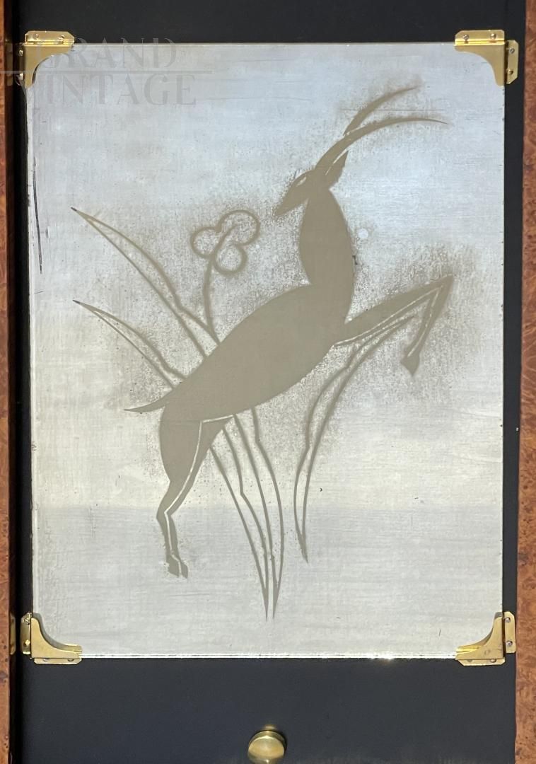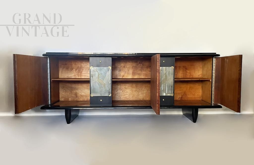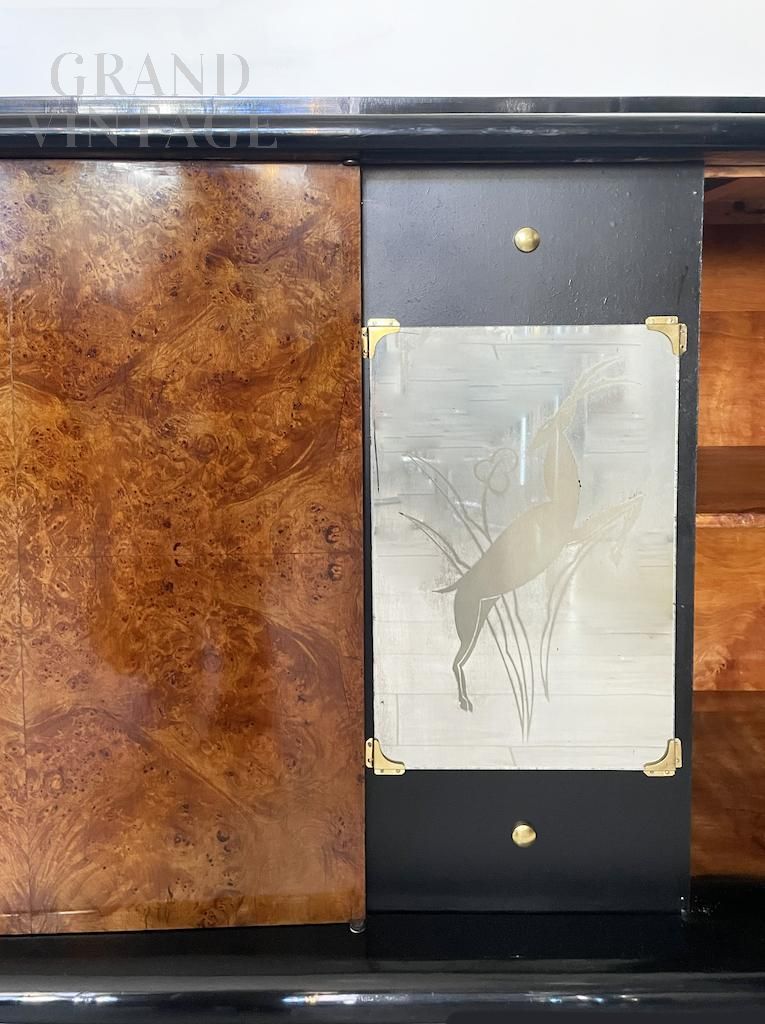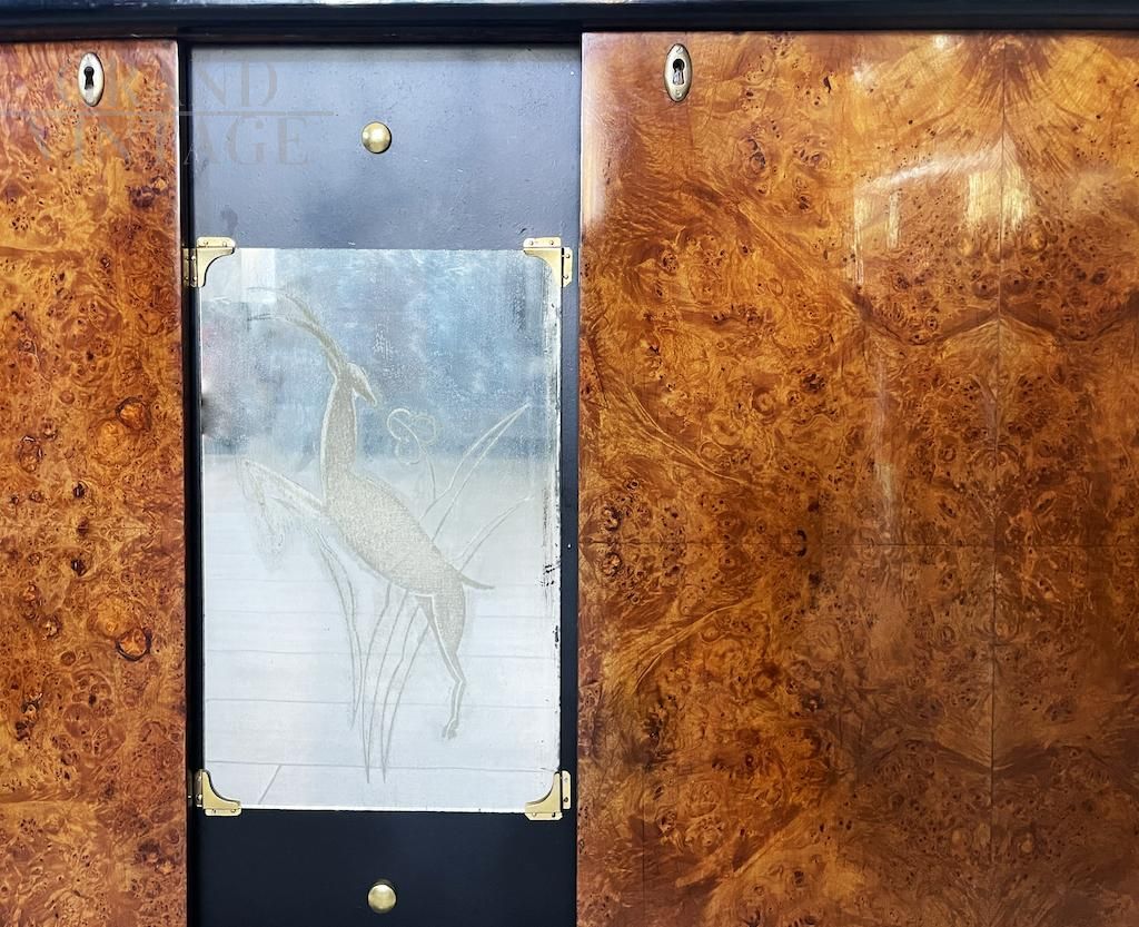 Particular sideboard in Italian Art Deco style from the 1930s with black lacquered rosewood structure characterized by three front doors in elm briar with original glass screen-printed with natural elements and animals. Inside there are two wooden shelves, the top is in black lacquered rosewood.