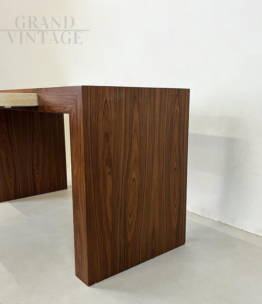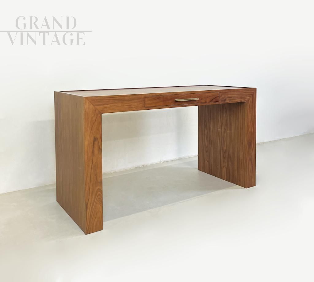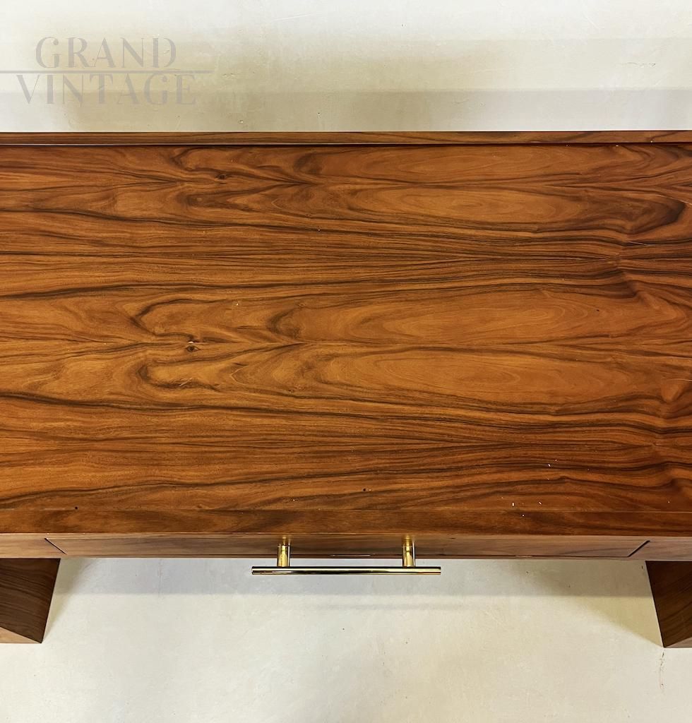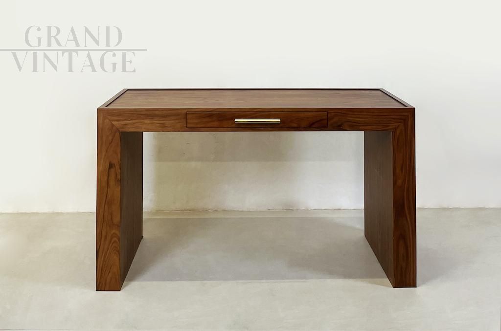 Special contemporary desk or console in Art Deco style from the 1930s made of walnut wood with beautiful grain, equipped with a central drawer with a brass handle. This is a new creation in style.