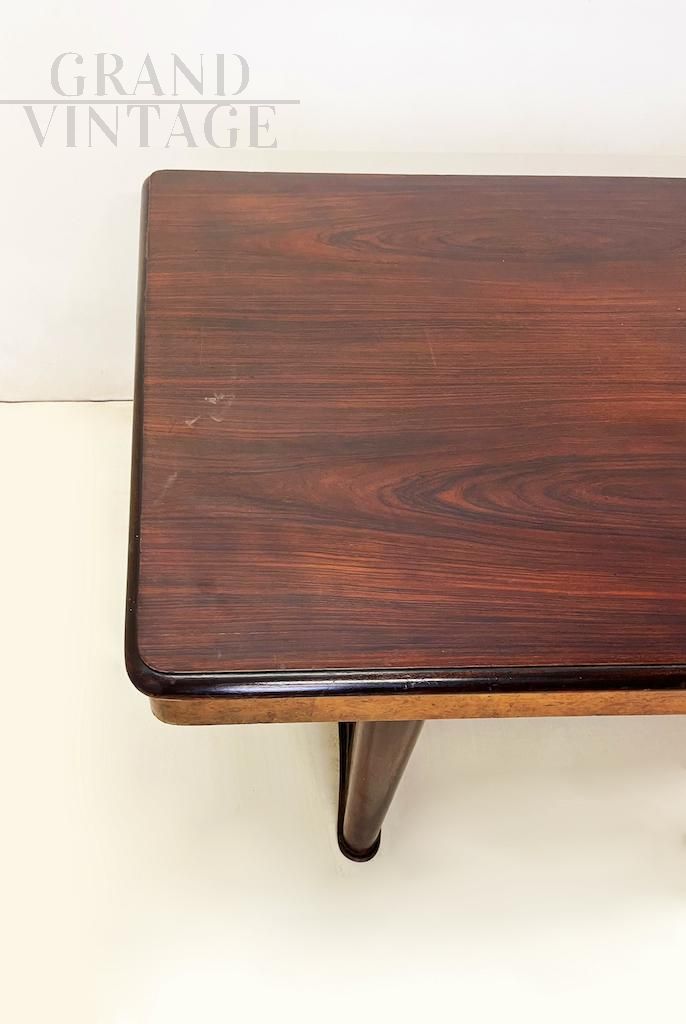Elegant Italian Art Deco table entirely made of rosewood and maple with brass details.