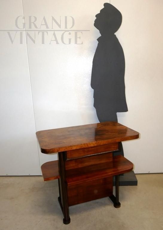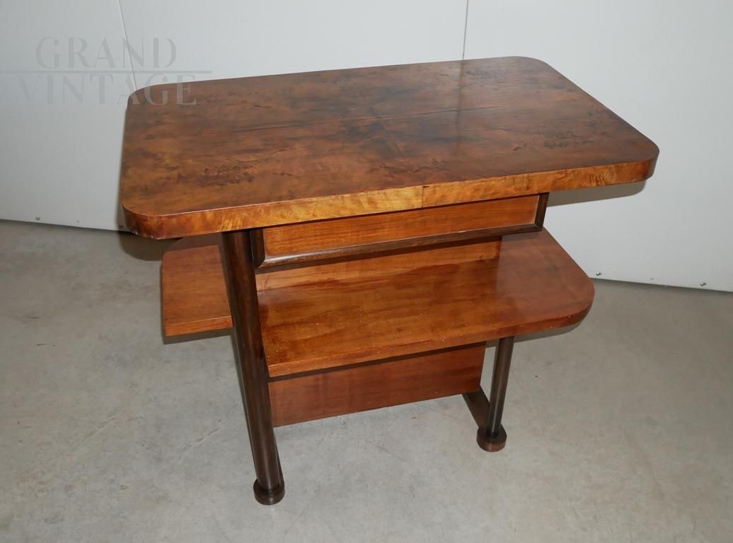 Antique Italian coffee table from the 1930s in Mussolini's Empire style, made of walnut veneer with a flamed top with rounded corners, rounded shelves on both long sides, a central drawer, and darker columns on the sides. The cabinet is finished on all sides and is suitable for placing in the center of a room.