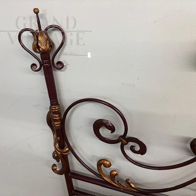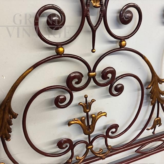 Elegant 1930s double bed headboard in purple lacquered wrought iron with gold details.