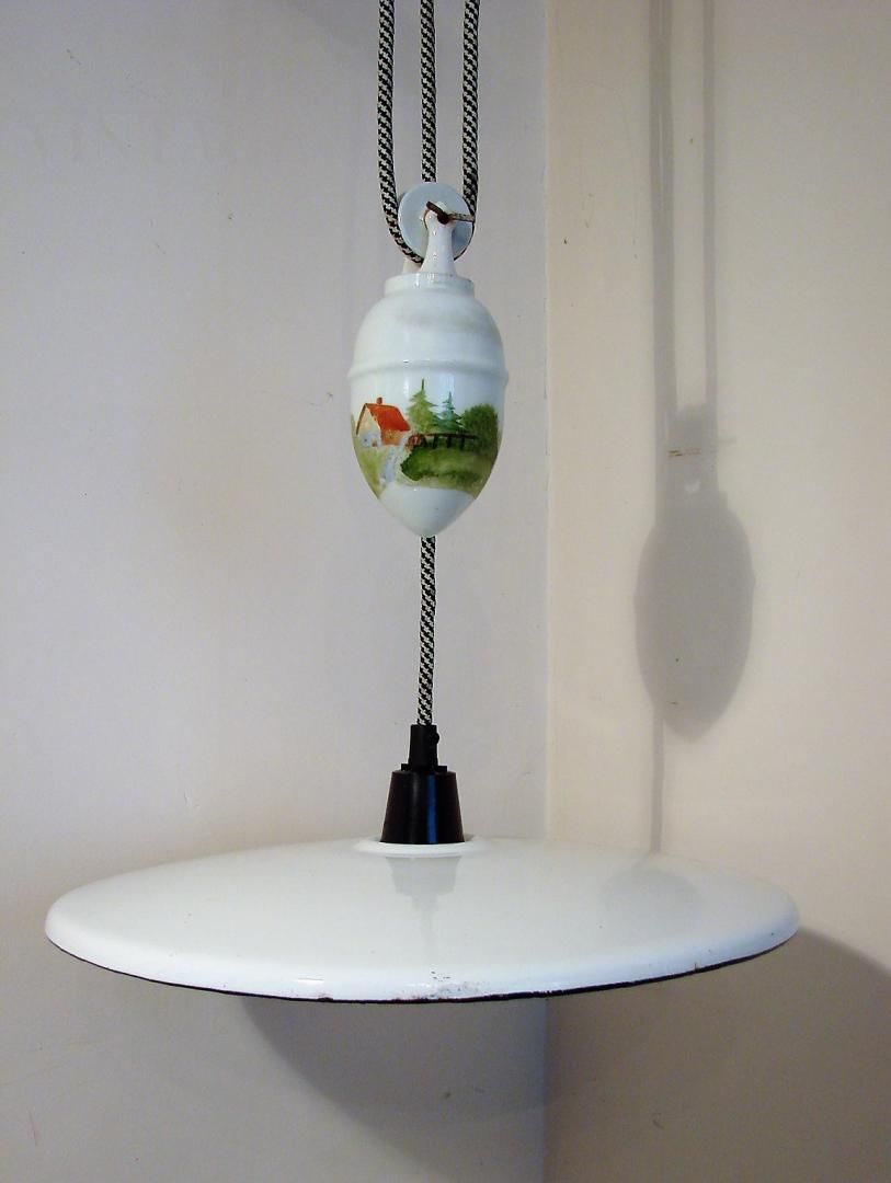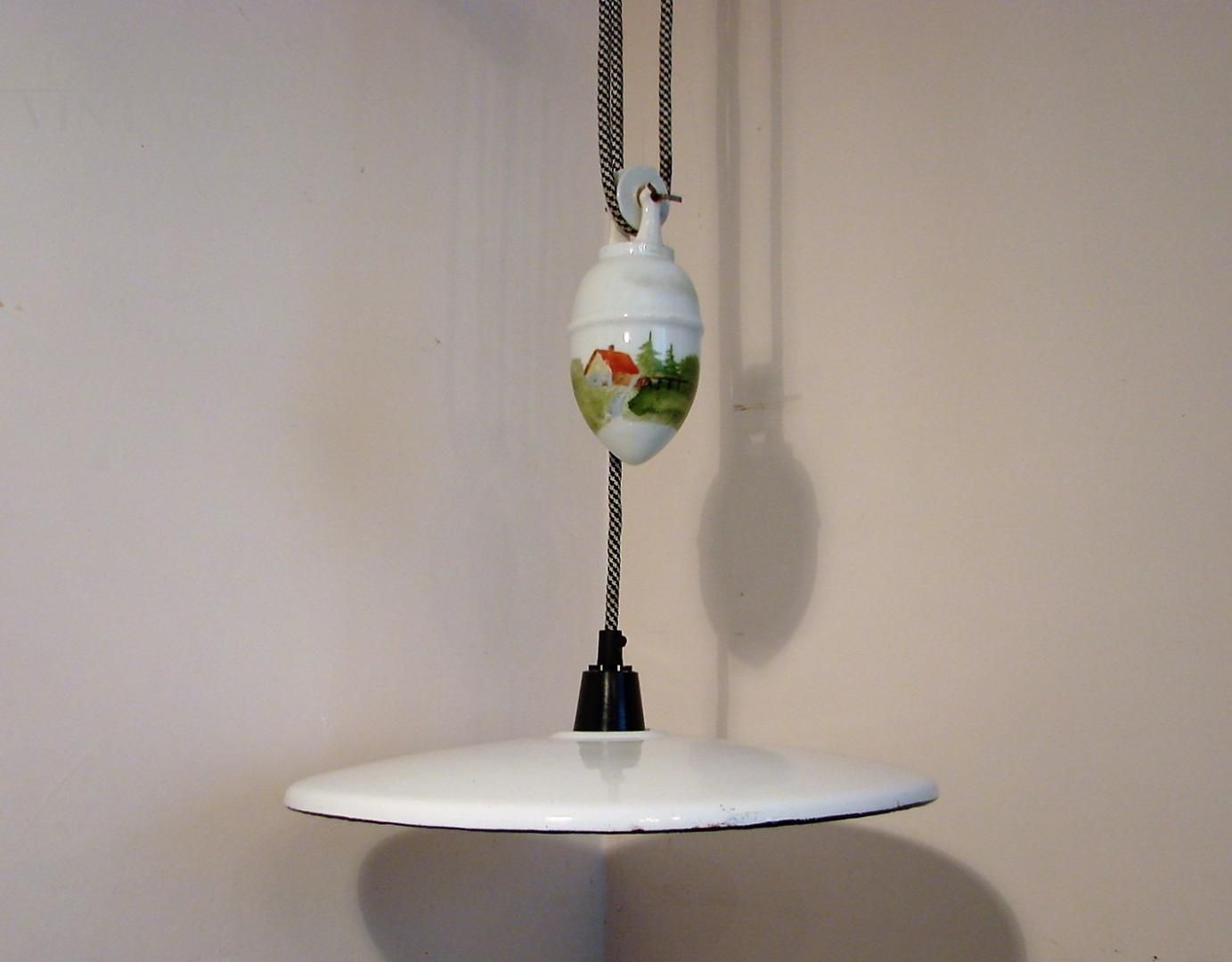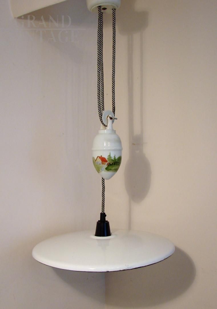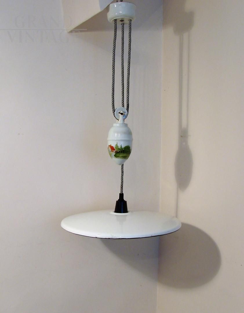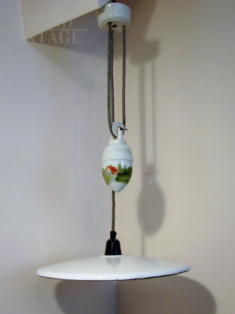 Vintage 1930s up and down pendant light in white enamelled metal and hand-painted ceramic with countryside landscape. The lamp is height adjustable thanks to the counterbalance mechanism.