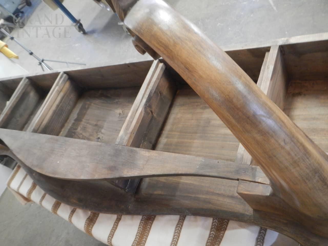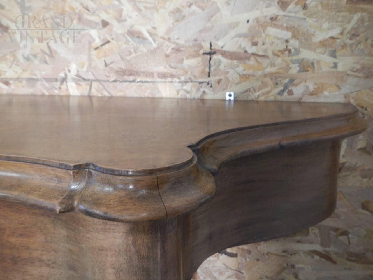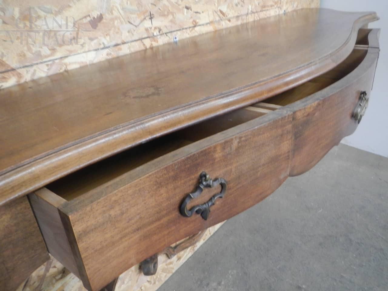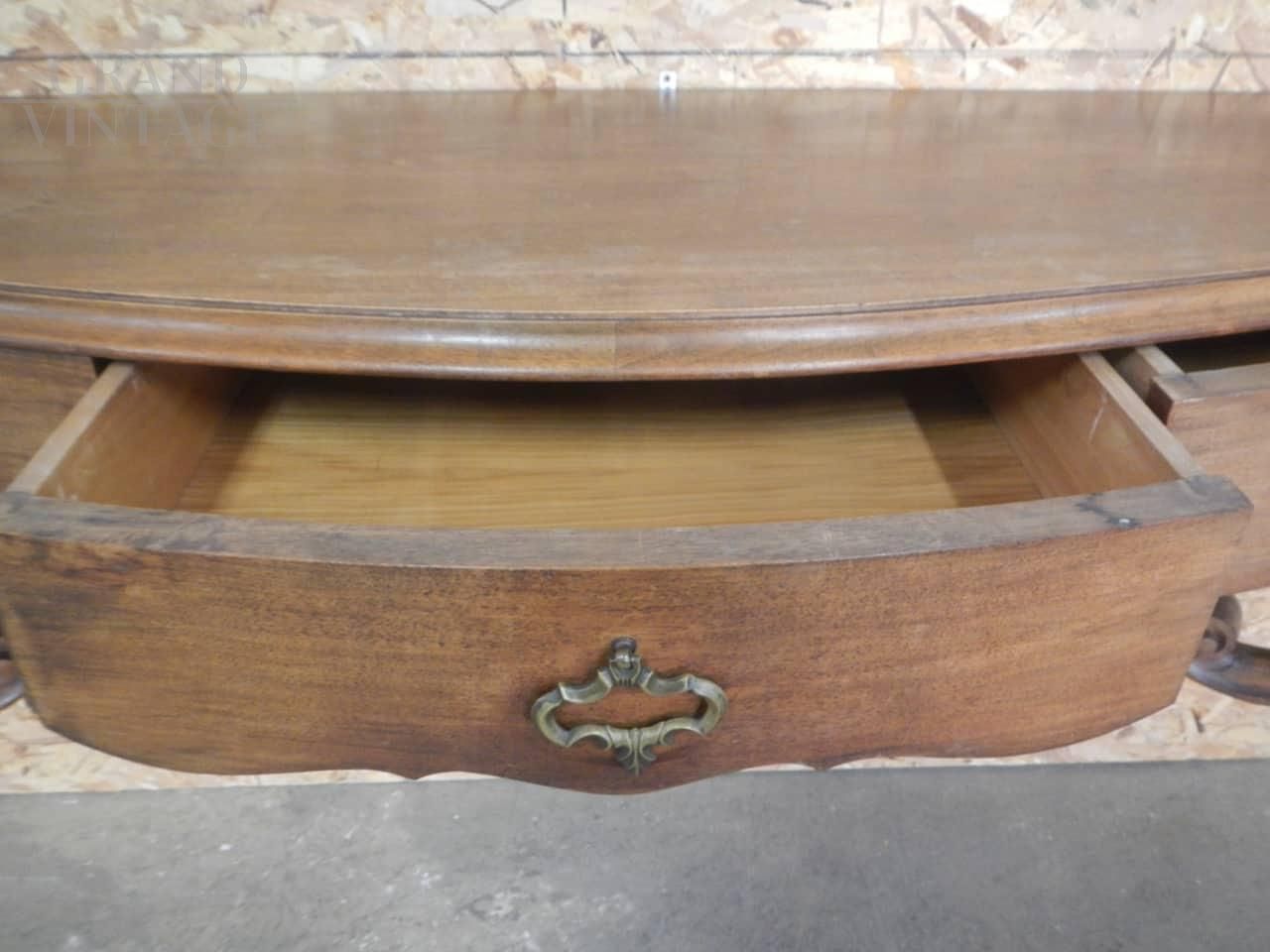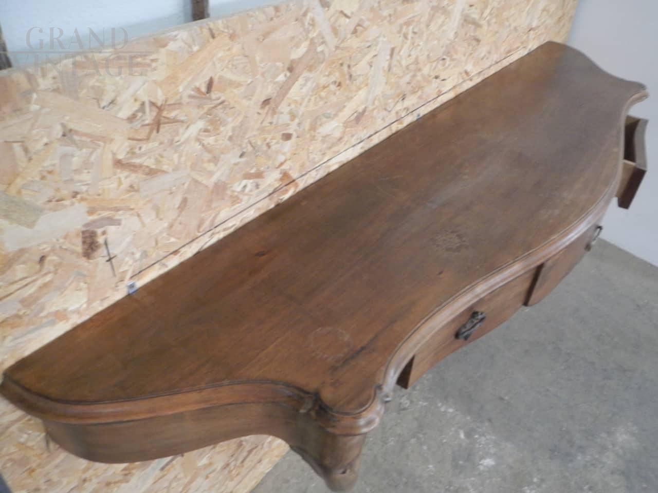 1940s hanging console table in inlaid walnut wood, baroque style, with 3 drawers and handles in decorated brass. In good condition, equipped with hooks to hang it.
