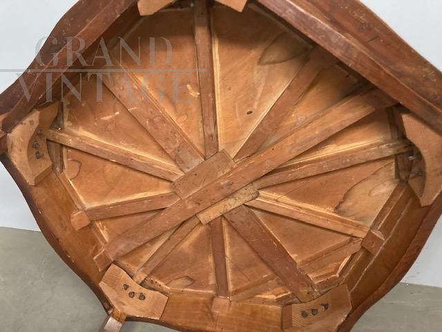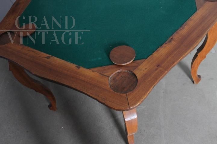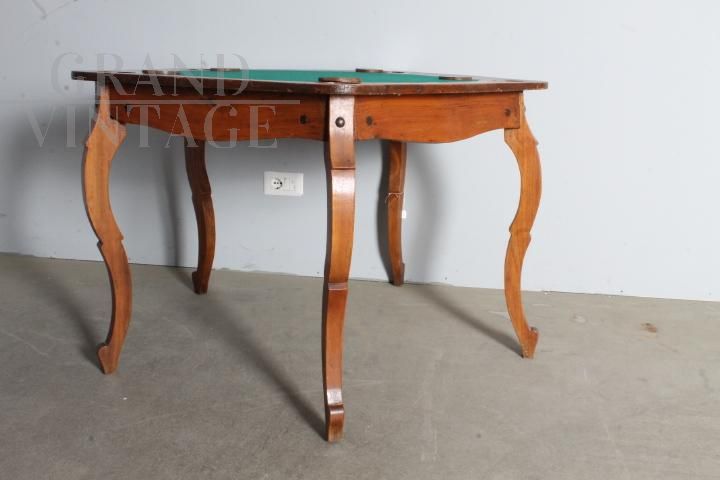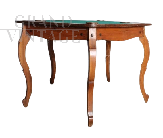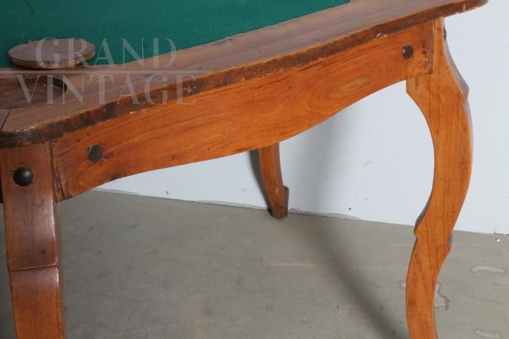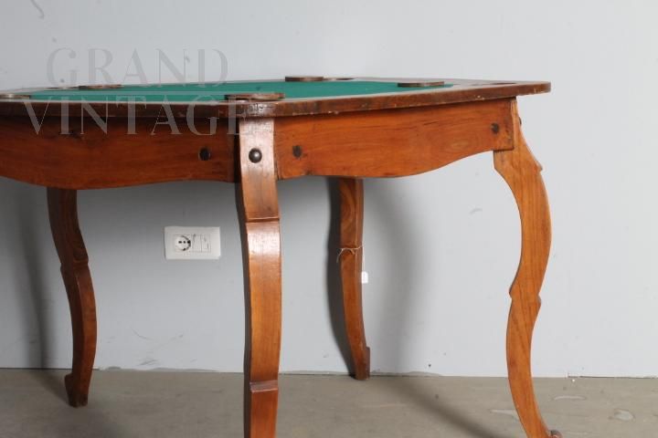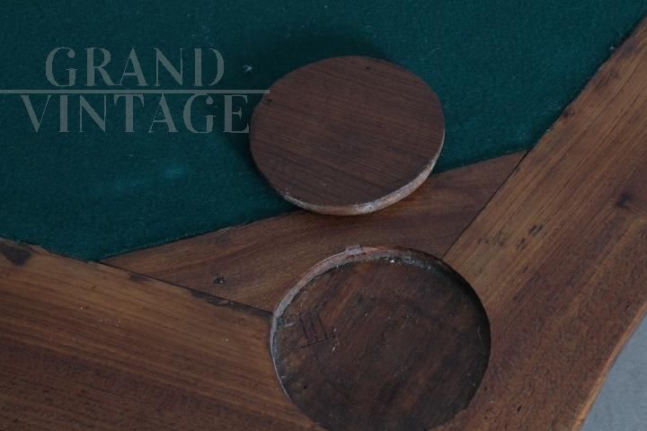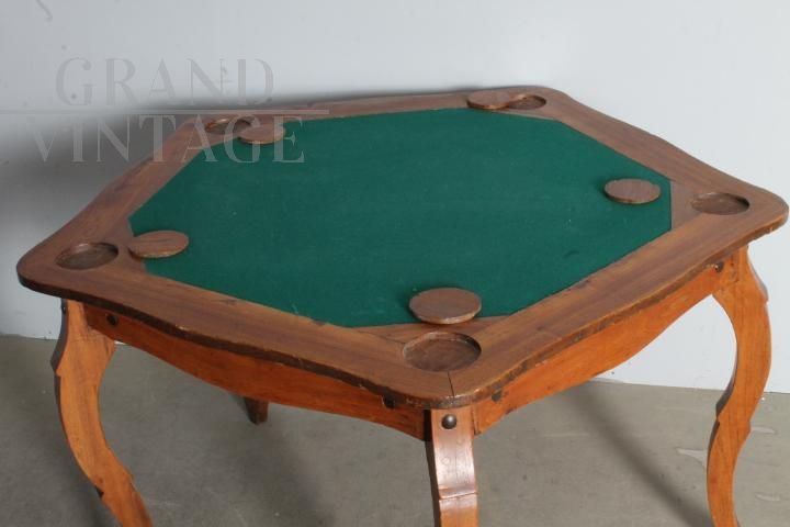 Antique art deco pentagonal poker gaming table from the 1940s, made of solid elm with five legs and top with green cloth and holes with wooden caps to hold the chips. The general condition is very good.