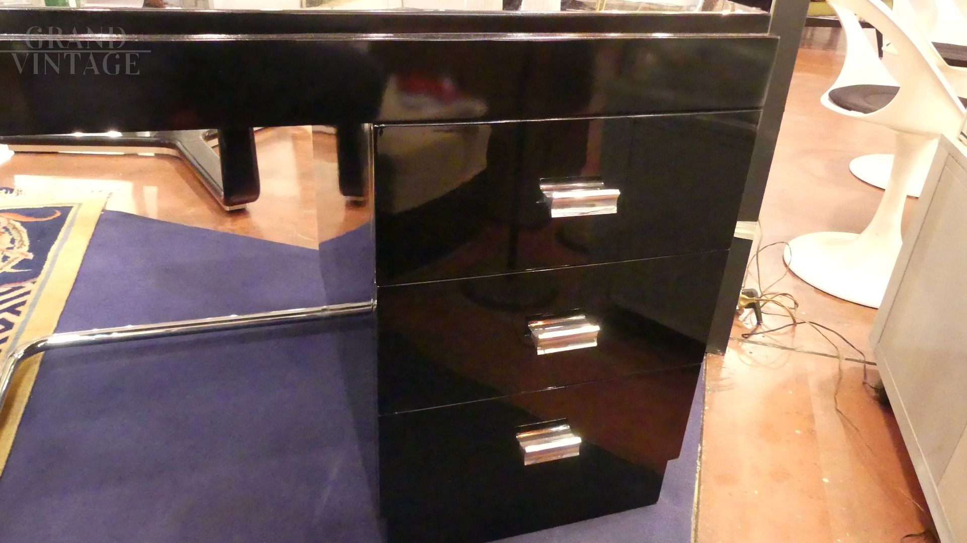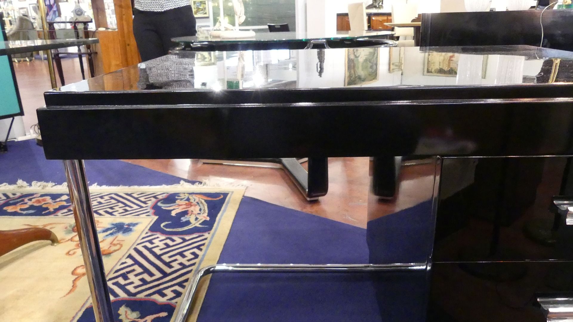 Mid century desk - 1940s art deco in black ebonized wood with steel base, in excellent condition, newly lacquered.