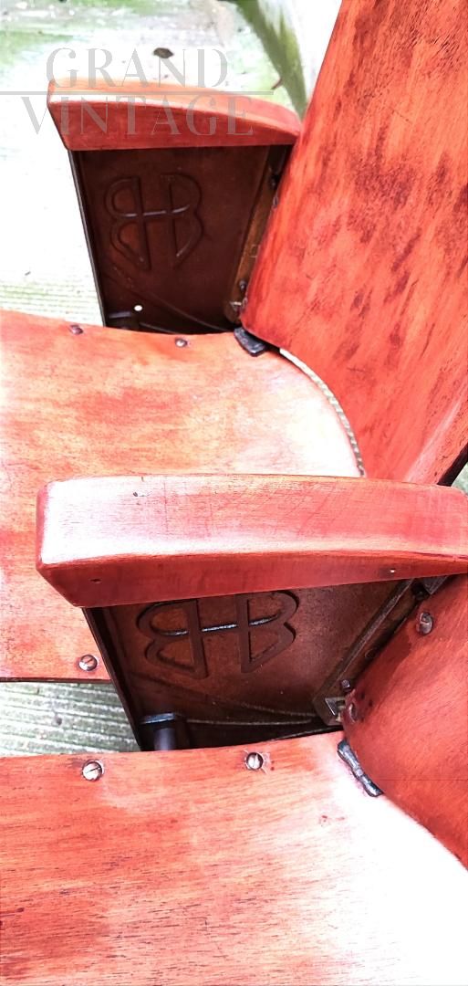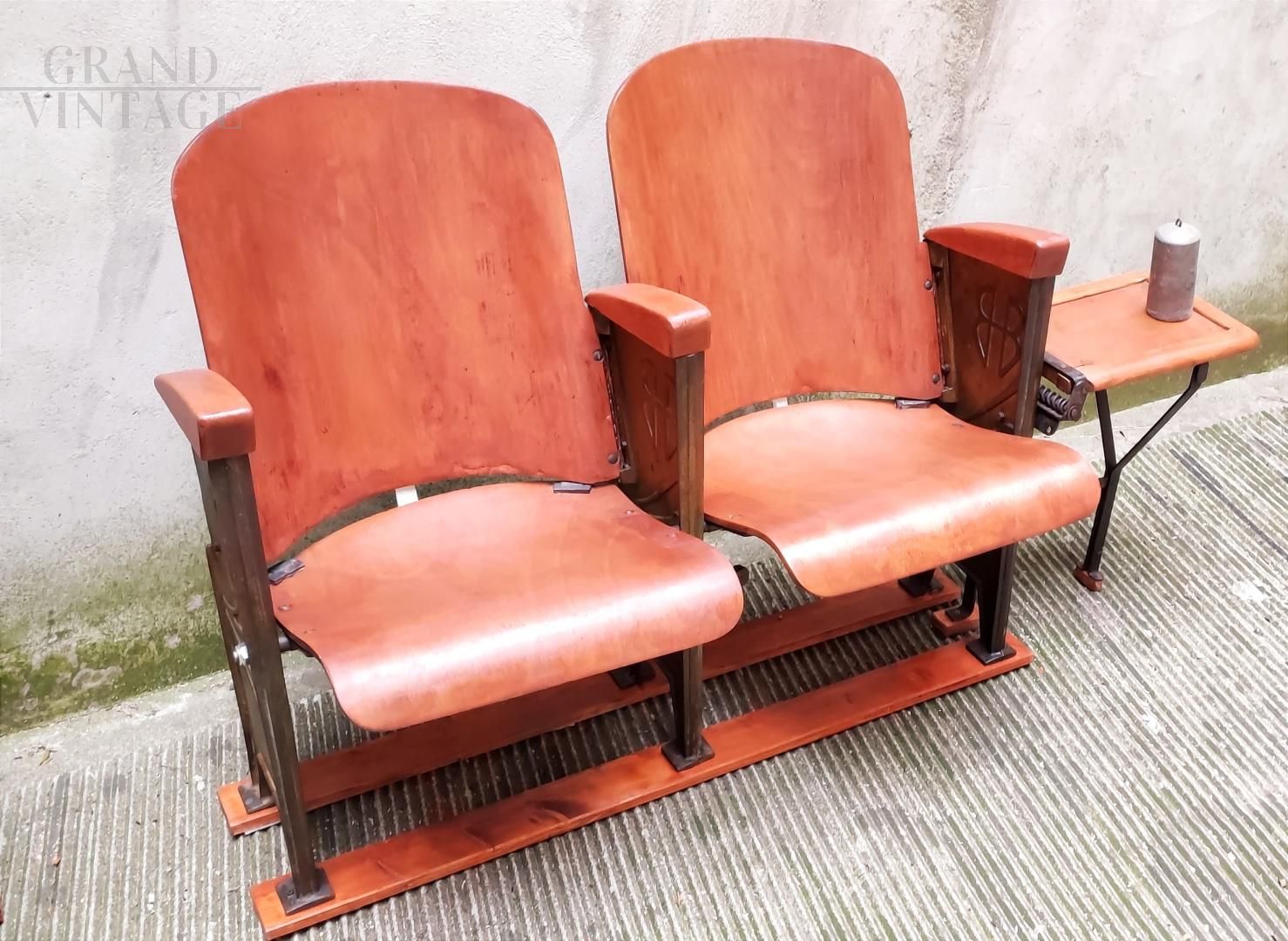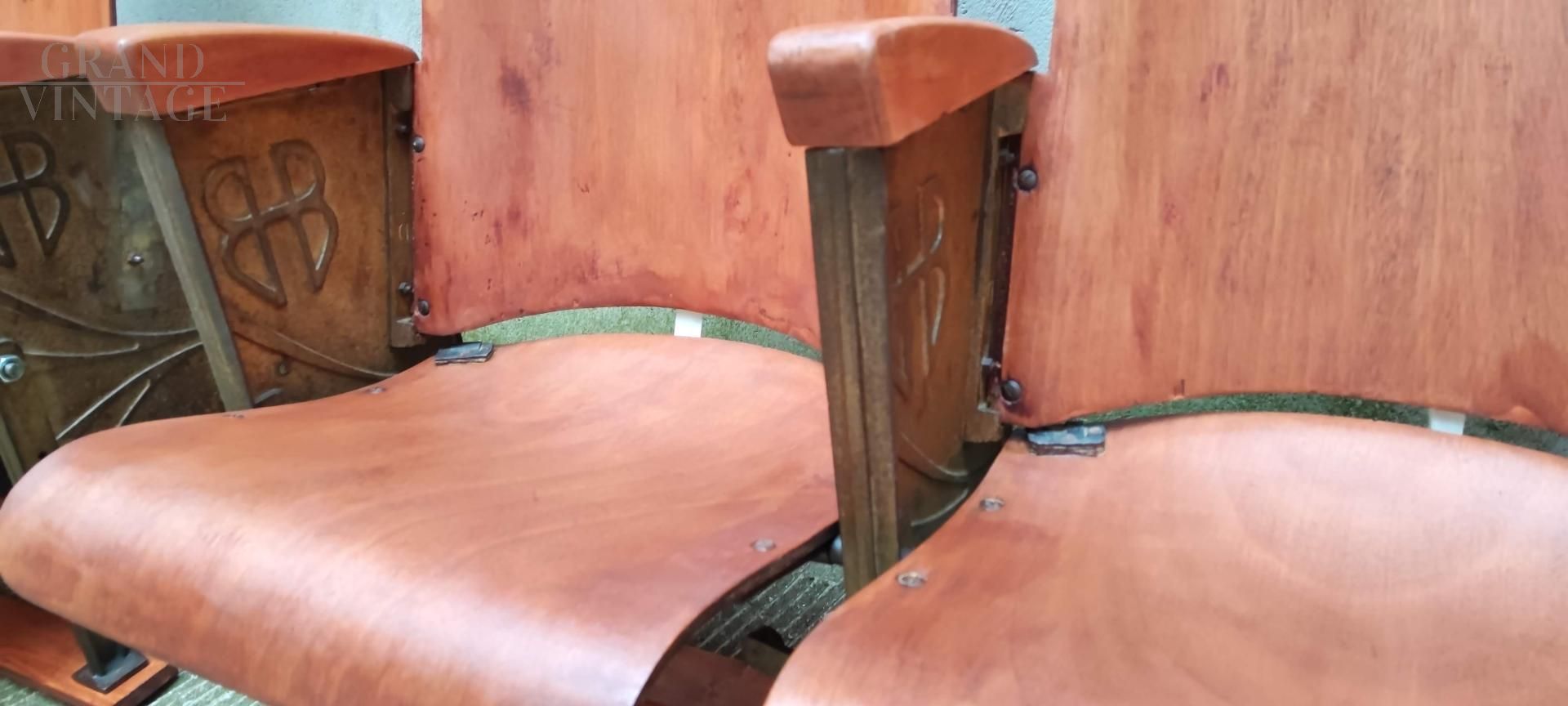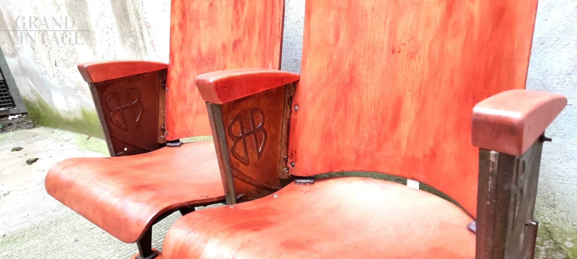These splendid armchairs come from a French theater and date from the 1940s. They have been perfectly restored and fixed on a wooden bar to give them greater stability. The chairs feature a wooden seat and backrest, and are enriched on the sides by cast iron supports. Another noteworthy detail is the presence of the folding seat, a distinctive and well-known element in the products of the time as, if necessary, it allowed to add an extra seat.