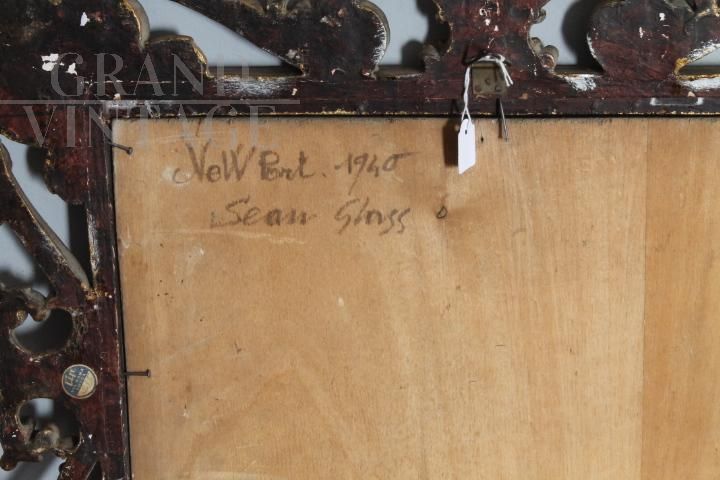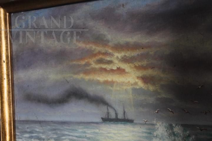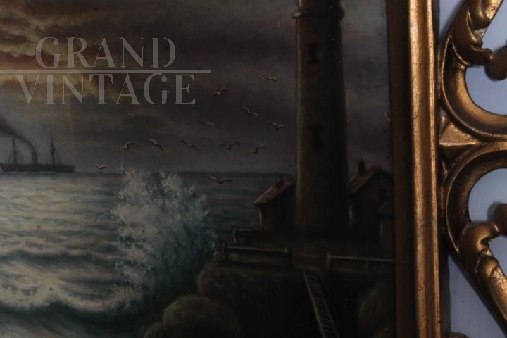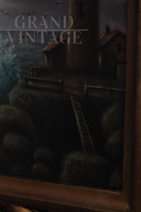 Oil on panel painting depicting a marina with a lighthouse and a ship on the horizon struck by a beam of light filtering through the clouds, titled, dated and signed on the back New Port 1940, Sean Glass, complete with finely carved golden frame. It does not require any intervention.