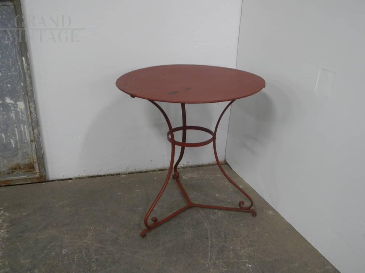 Vintage garden table in red lacquered iron with round top and flowerpot holder under the top, Italy, 1940s, treated with iron paint while maintaining the beautiful signs of use.