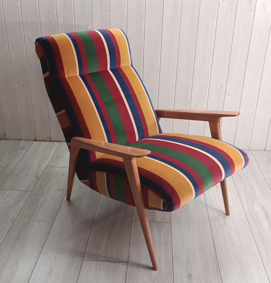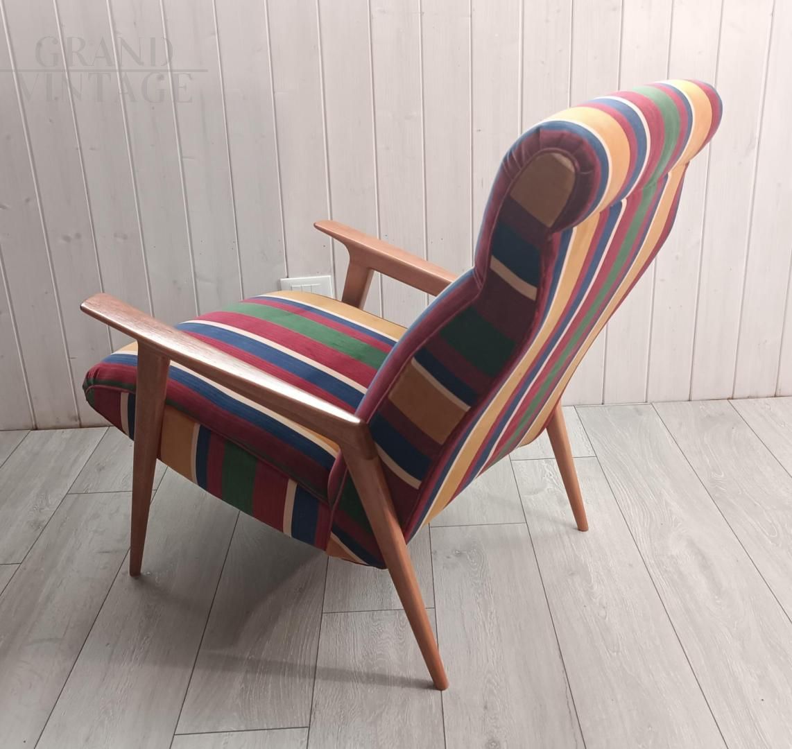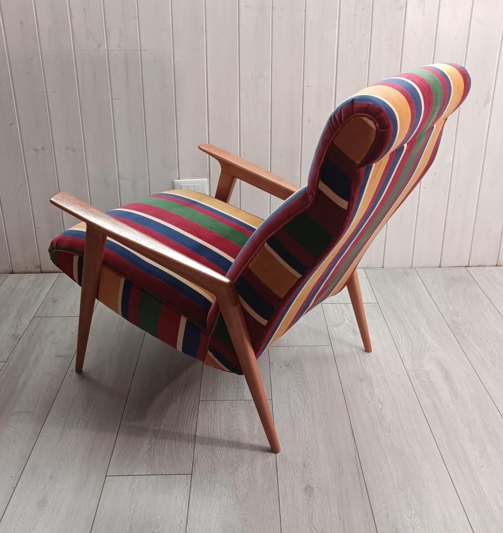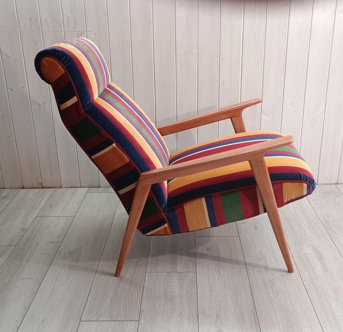 Vintage 1940s Scandinavian style armchair, completely restored, with new straps and padding, upholstered in multicolored striped cotton velvet. In excellent condition, a total restoration of the wooden part was carried out.