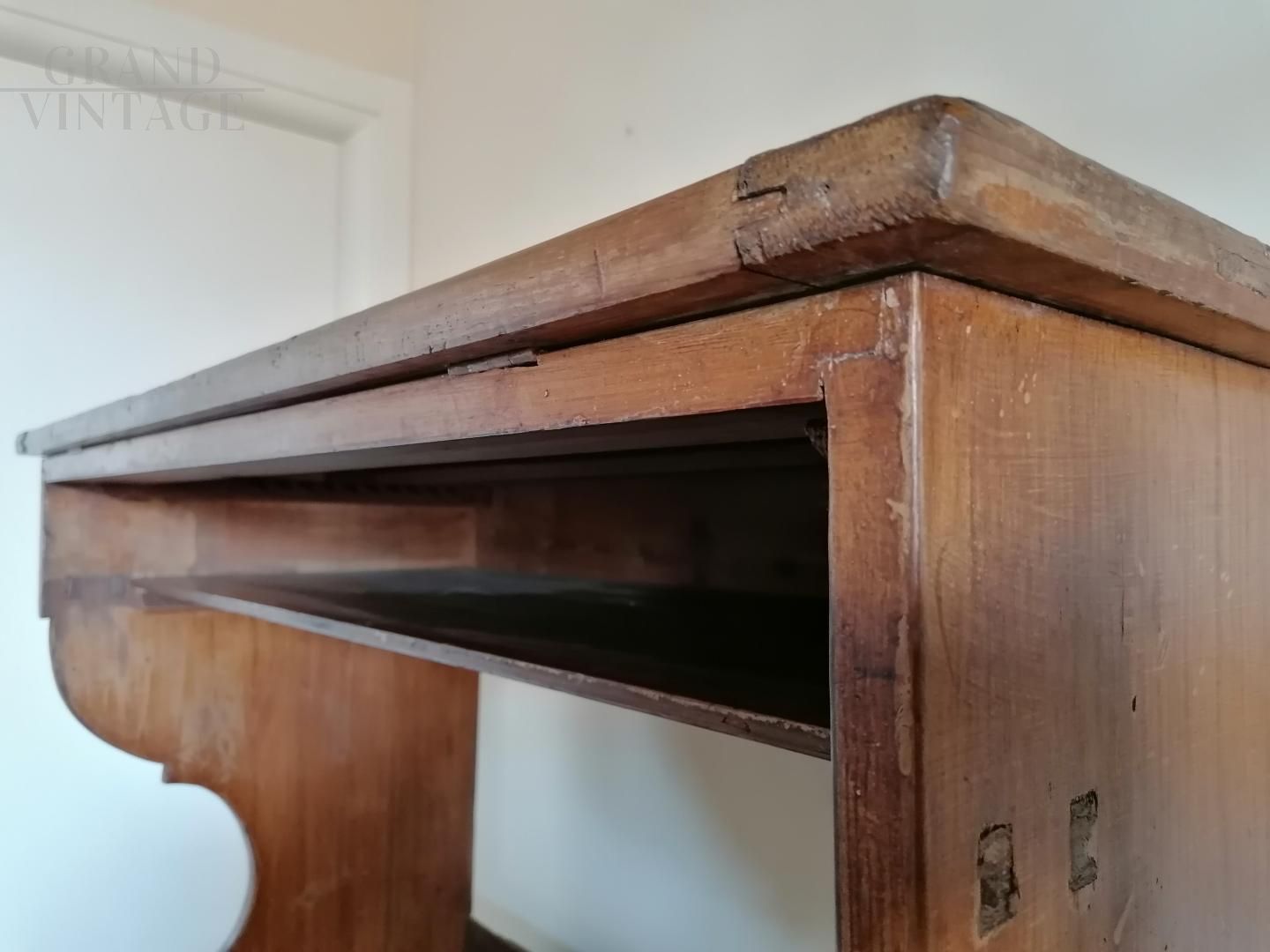 Vintage school desk from early 1940s, wooden structure of which the seat is missing.
