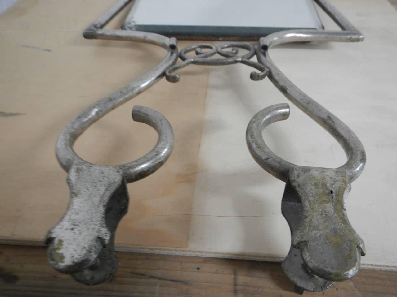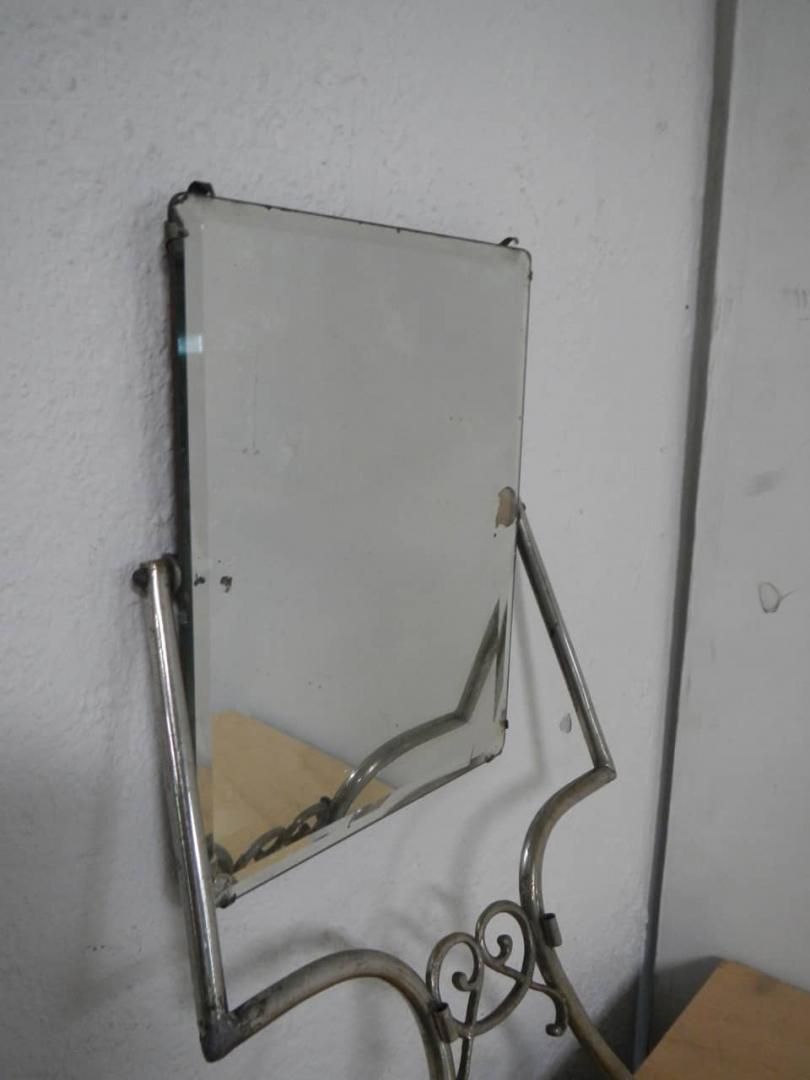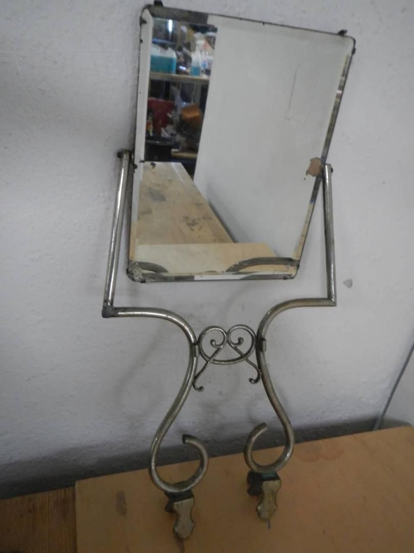 Vintage 1940s mirror with chromed metal support, complete with clamp hooks to fix it to a support. The mirror without structure measures 21 x1.5 cm, height 27 cm. With signs of use.