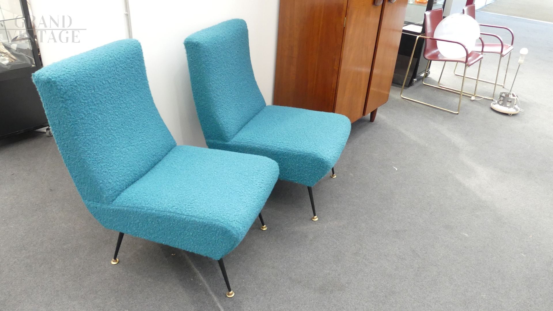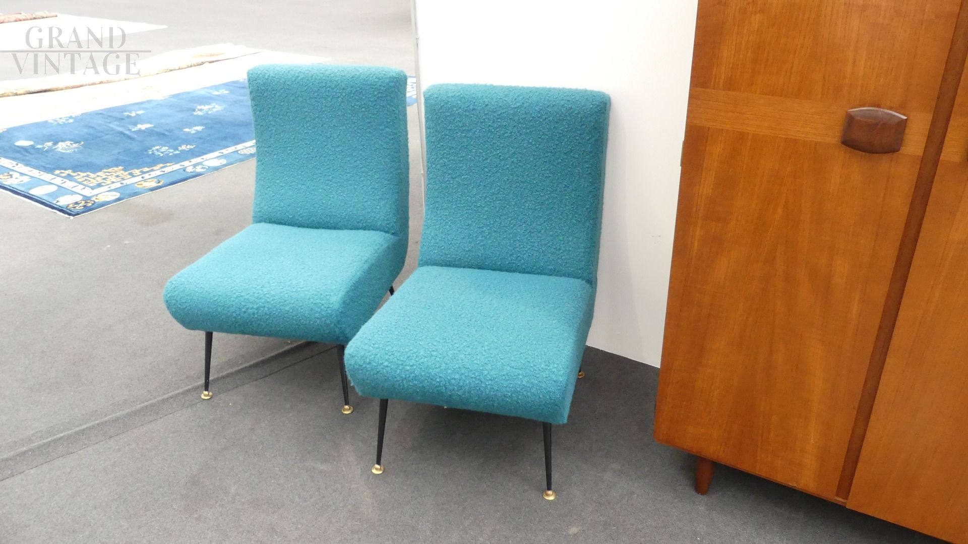 Pair of 50s armchairs without armrests. The armchairs are in teal-colored bouclé wool fabric. They have been restored.