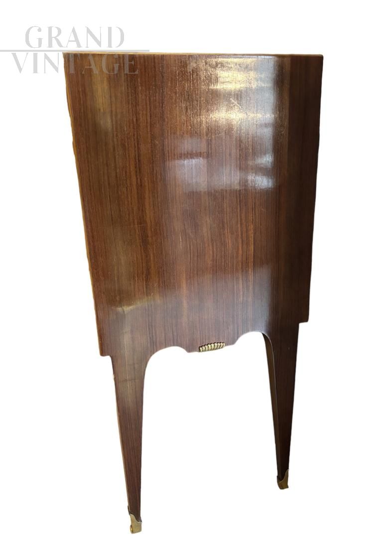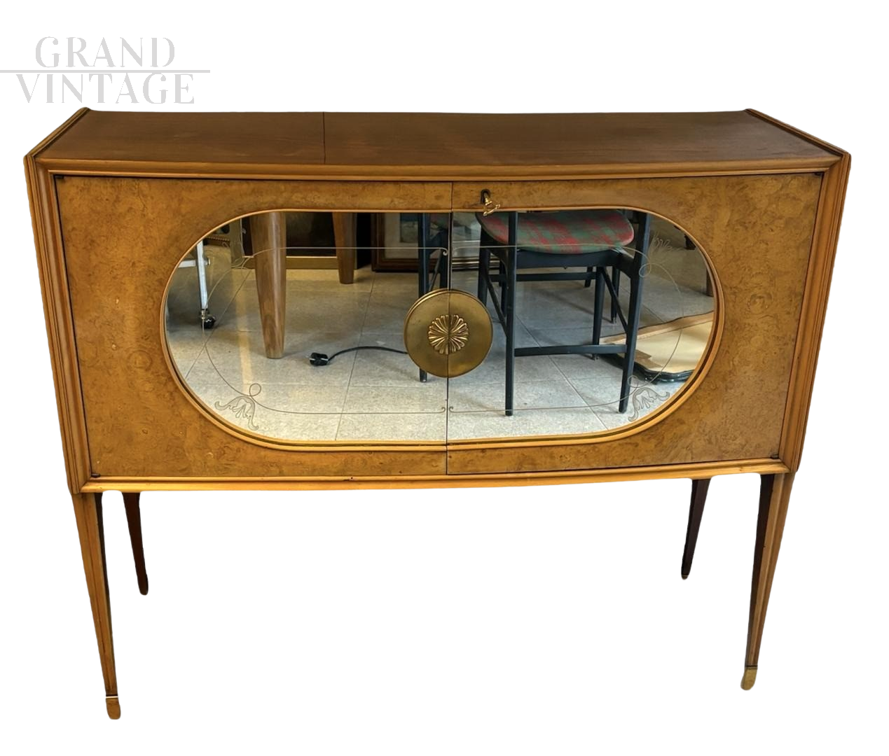 Very refined 1950s vintage bar cabinet in briarwood, with decorated glass and internal electrical system connected to the opening of the doors. Furniture restored and ready to be placed in the home.