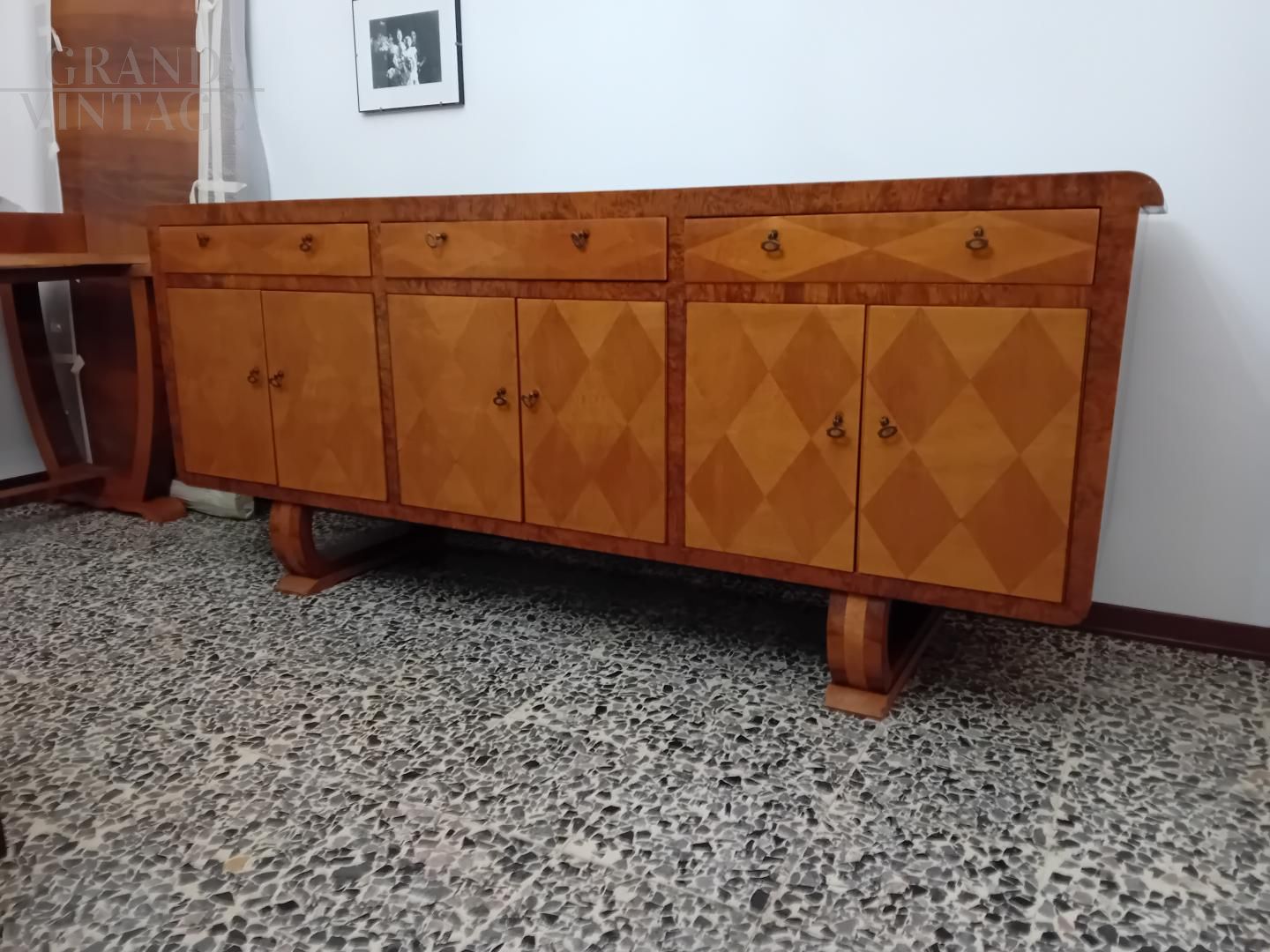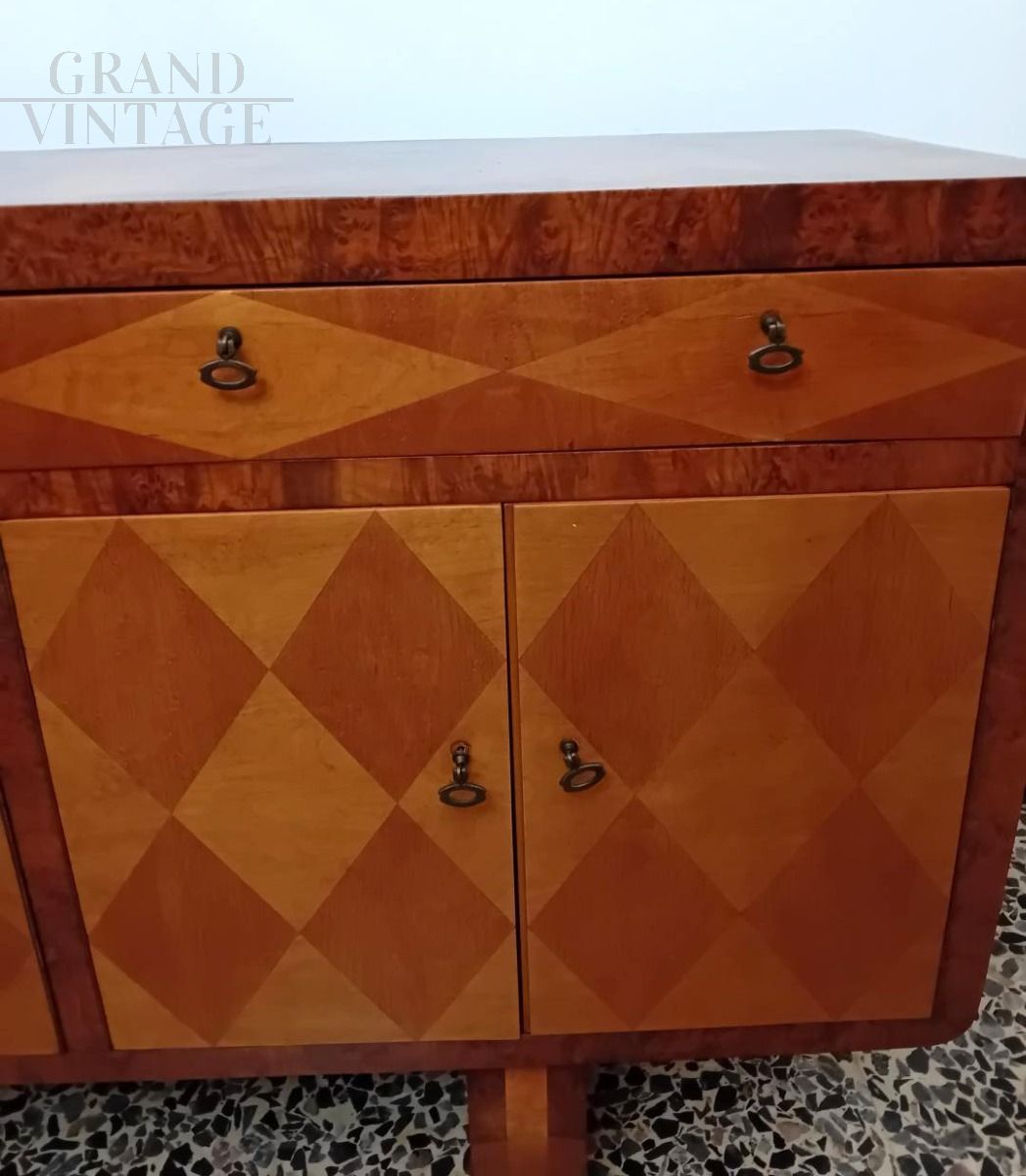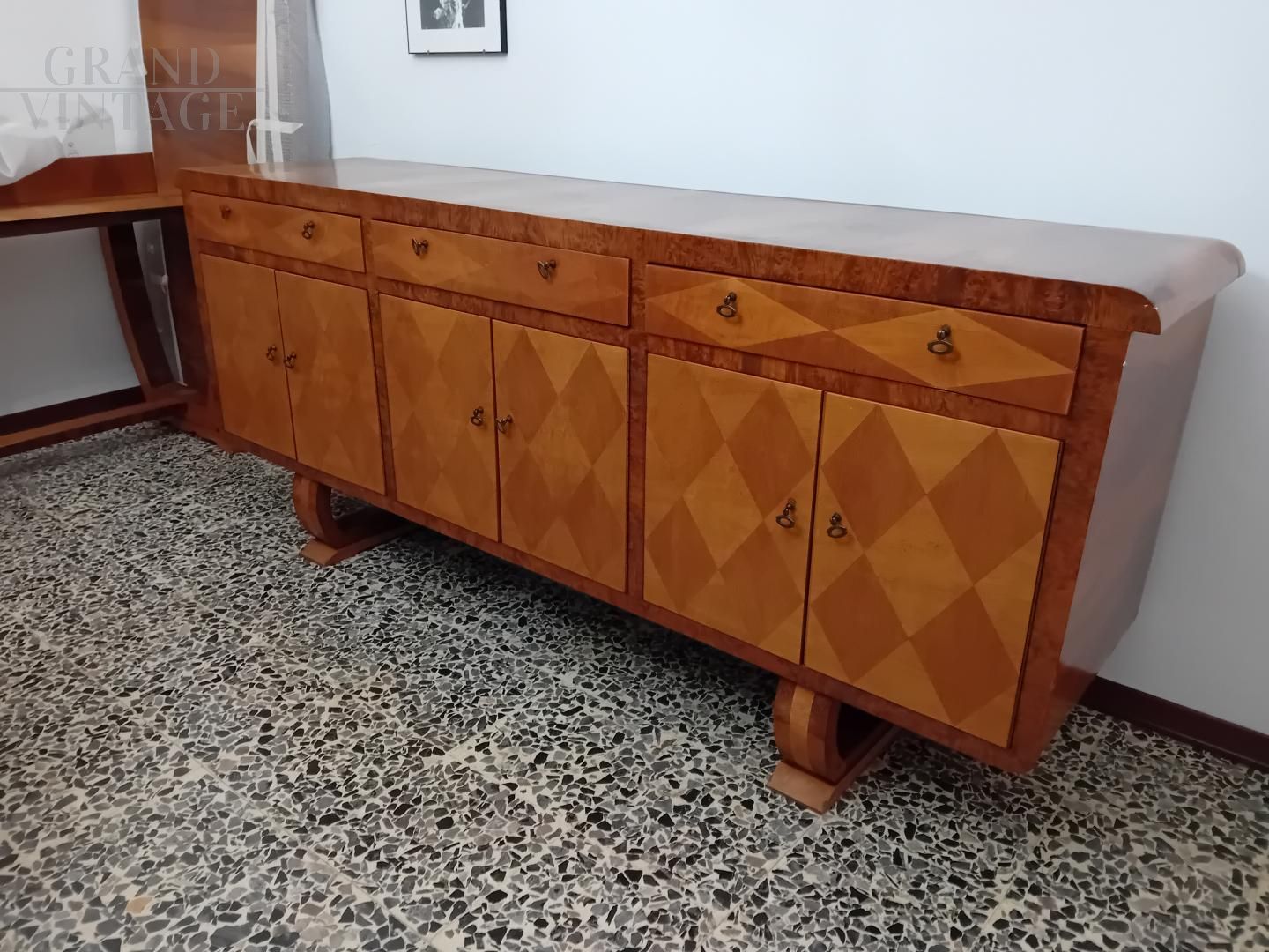 1950s art deco style sideboard in briar and walnut, a handcrafted carpentry product with quality materials and geometric diamond inlays on the 6 doors and 3 drawers.