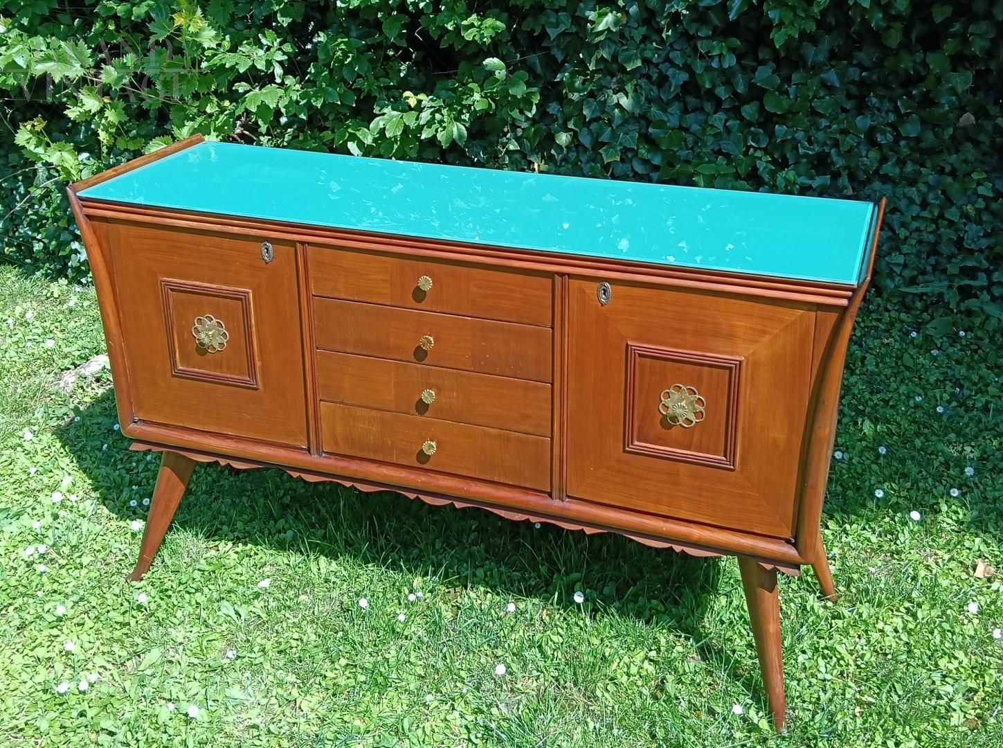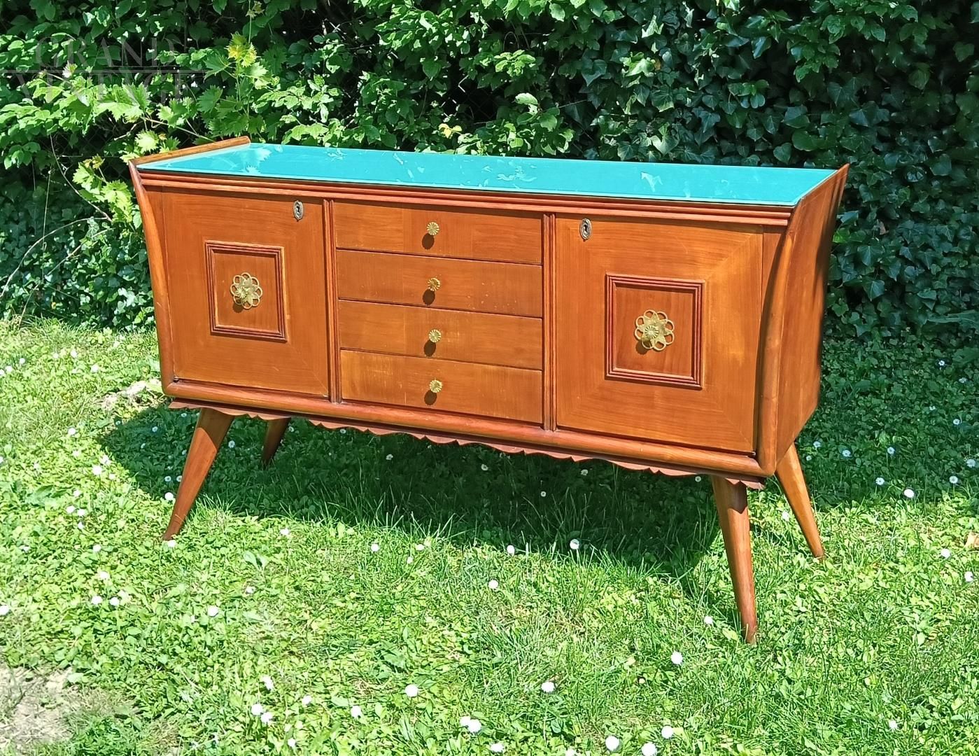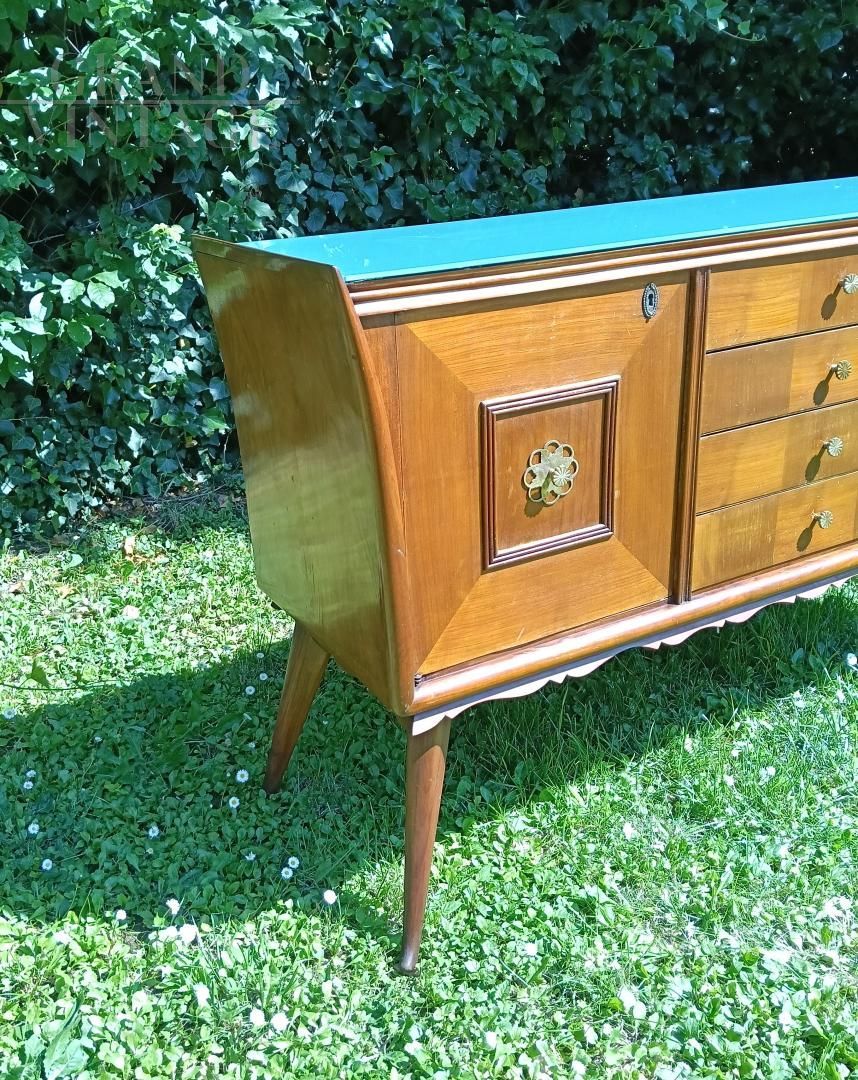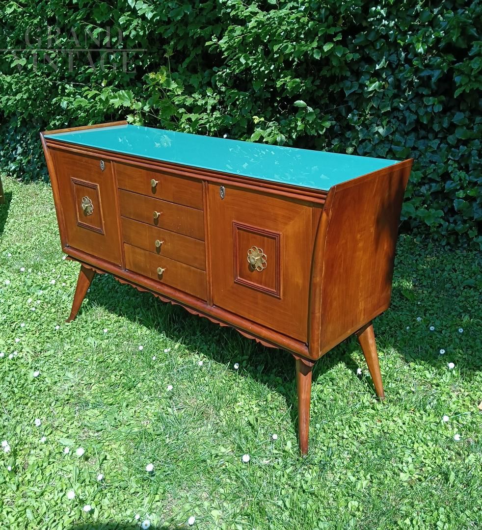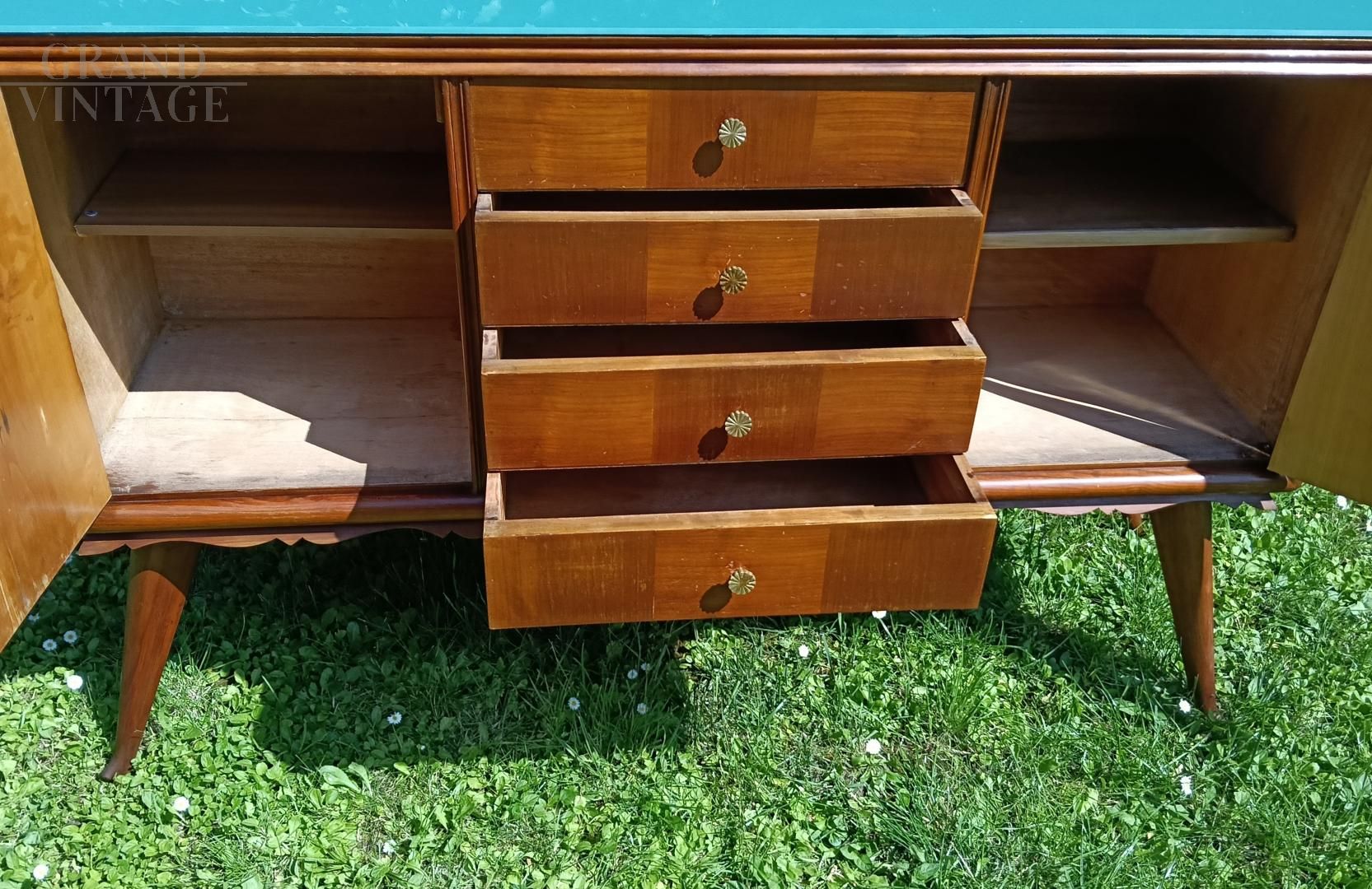 Italian sideboard from the 1950s with geometric design and very accurate and detailed carvings. The structure is in honeycomb elm wood, the top in blue-green back-lacquered glass. The feet are in solid wood, and are surmounted by decorative festoons under the base. The sides are finely flared. The sideboard is in excellent condition, it has been dismantled and restored, it has no obvious defects but shows some natural signs of use. Solid brass handles, the key is missing, the doors close with a magnet.