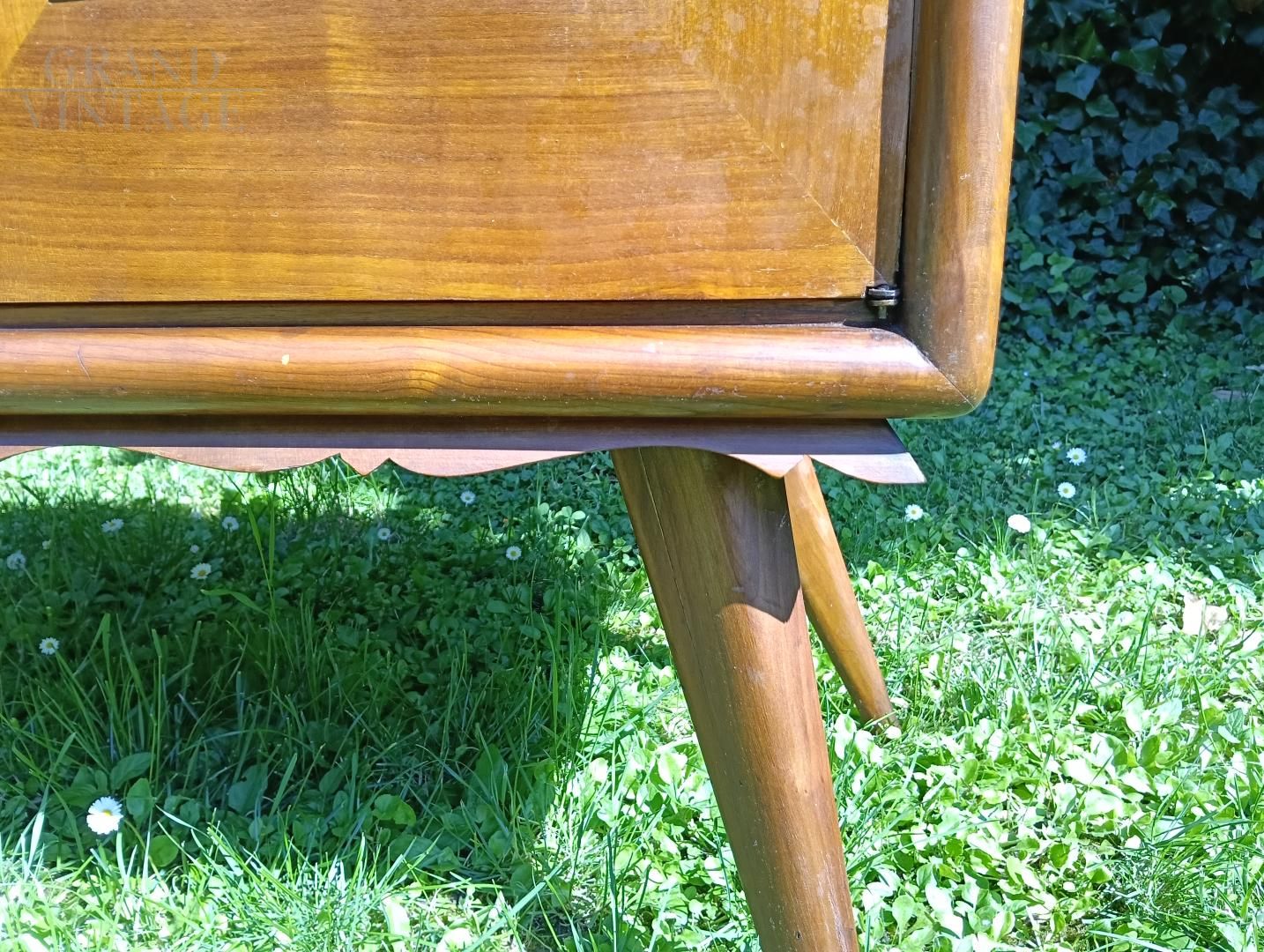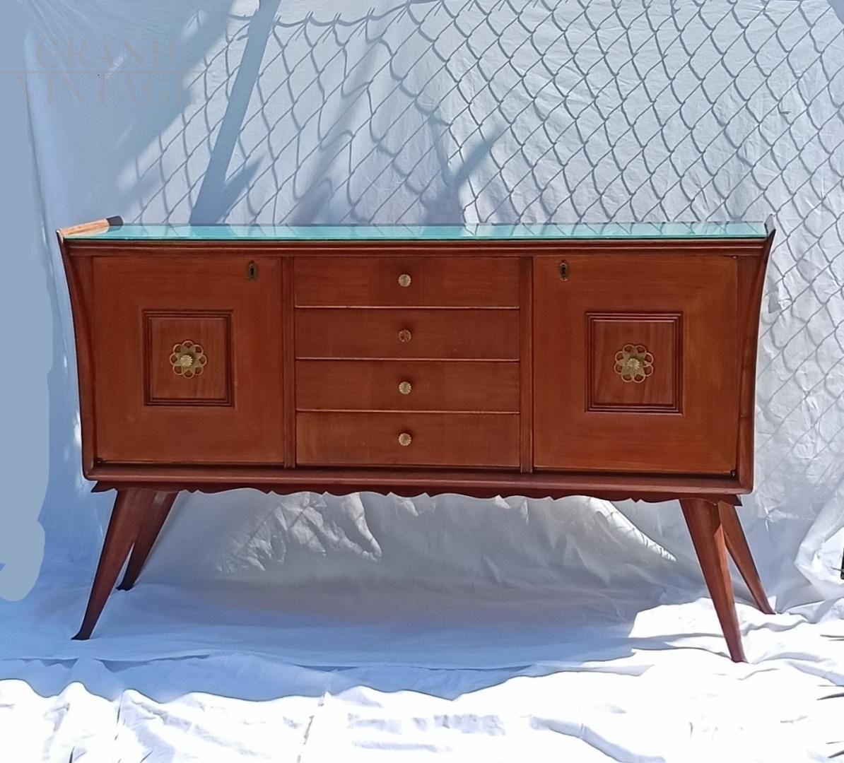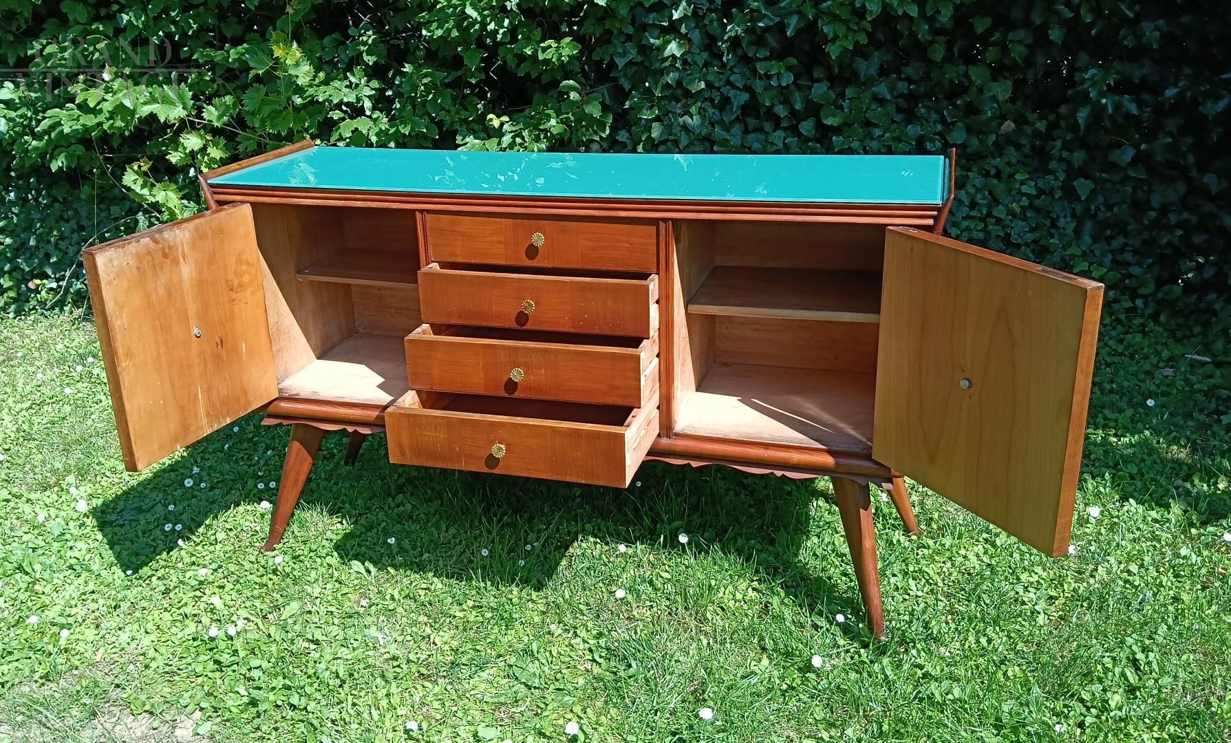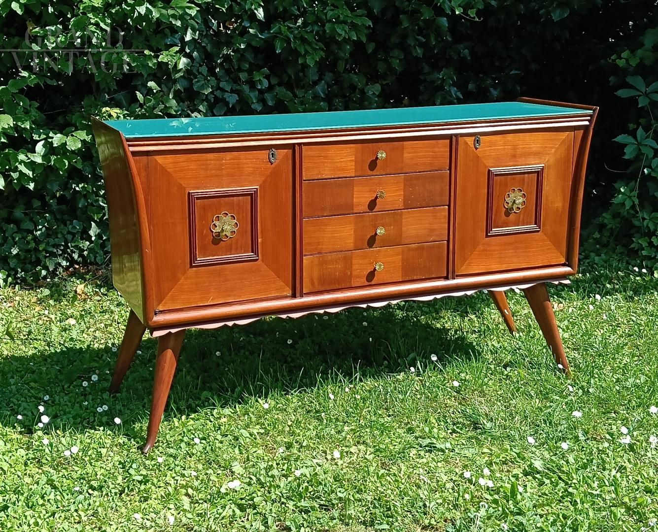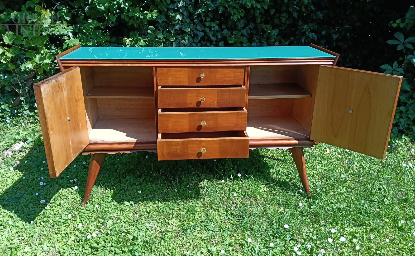 Italian sideboard from the 1950s with geometric design and very accurate and detailed carvings. The structure is in honeycomb elm wood, the top in blue-green back-lacquered glass. The feet are in solid wood, and are surmounted by decorative festoons under the base. The sides are finely flared. The sideboard is in excellent condition, it has been dismantled and restored, it has no obvious defects but shows some natural signs of use. Solid brass handles, the key is missing, the doors close with a magnet.