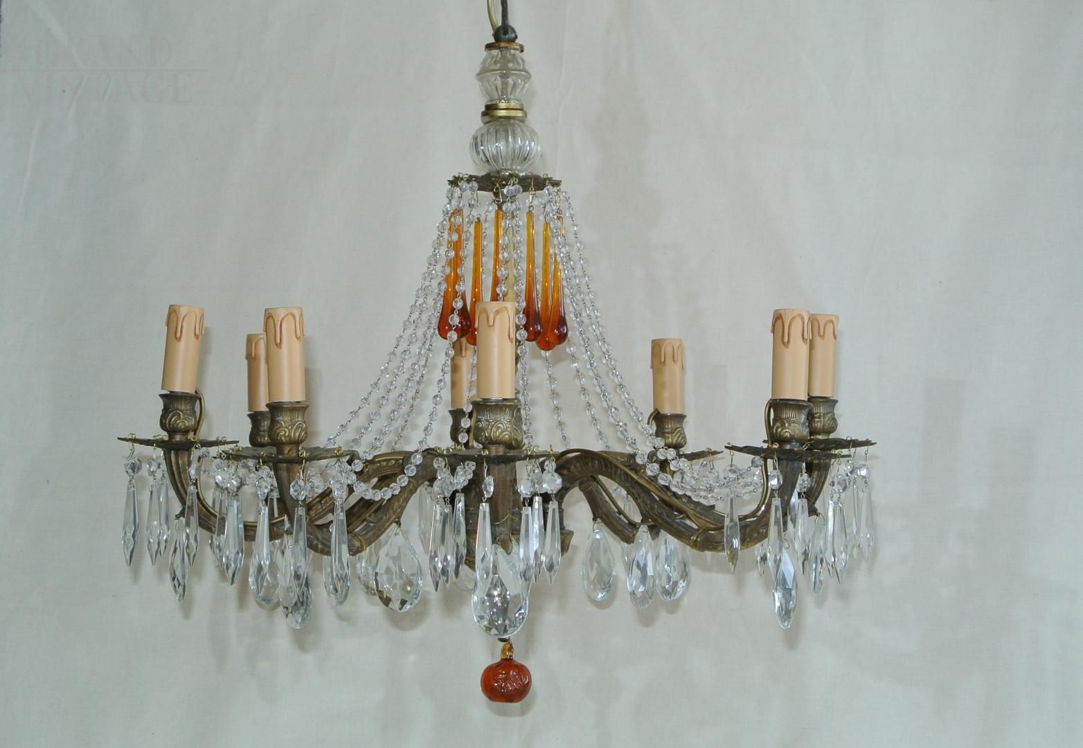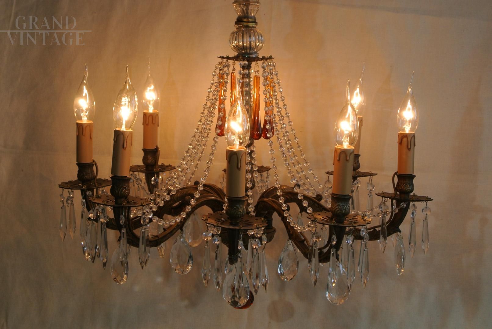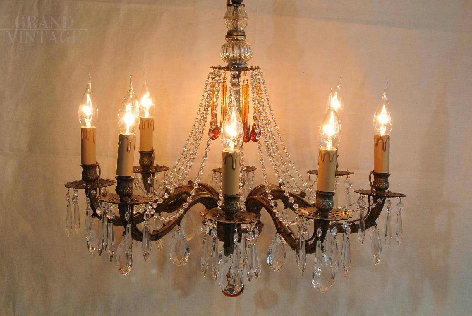 Wonderful and spectacular 8-light bronze chandelier with cascade of crystals that accentuates the beauty and will make any room stand out. Particularly noteworthy are the long drops in amber, like the final drop which has the shape of an apple. Dating back to the 1960s, bronze structure and crystal elements in good condition, complete with all crystals. In perfect working order and overhauled for E 14 bulbs, not included. The measures are 60 cm diameter and 60 cm height, with the 55 cm chain you can extend the chandelier. The chandelier is very heavy, 8,400 kg.