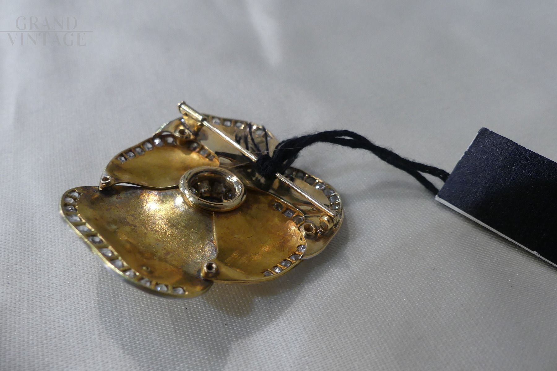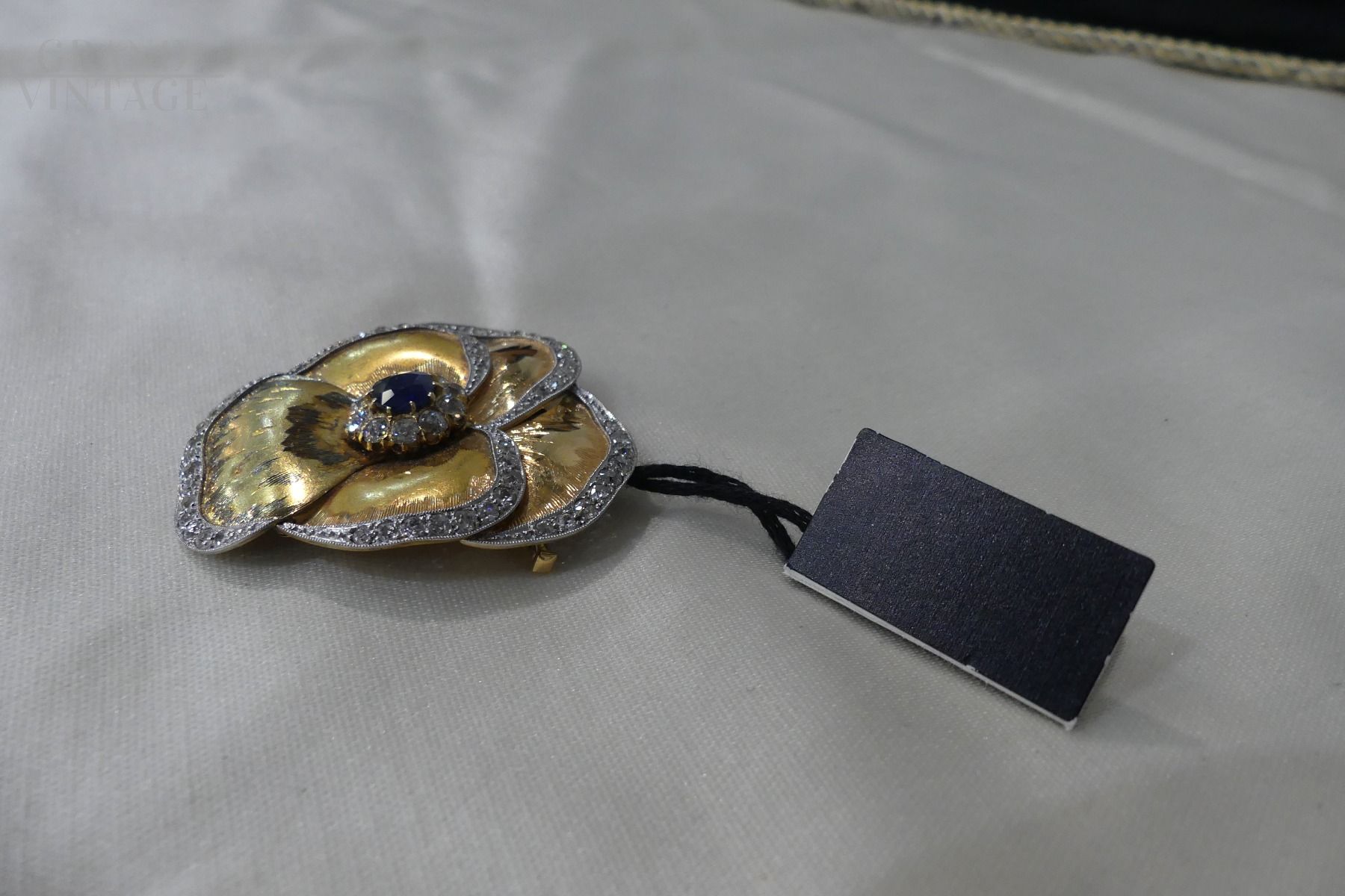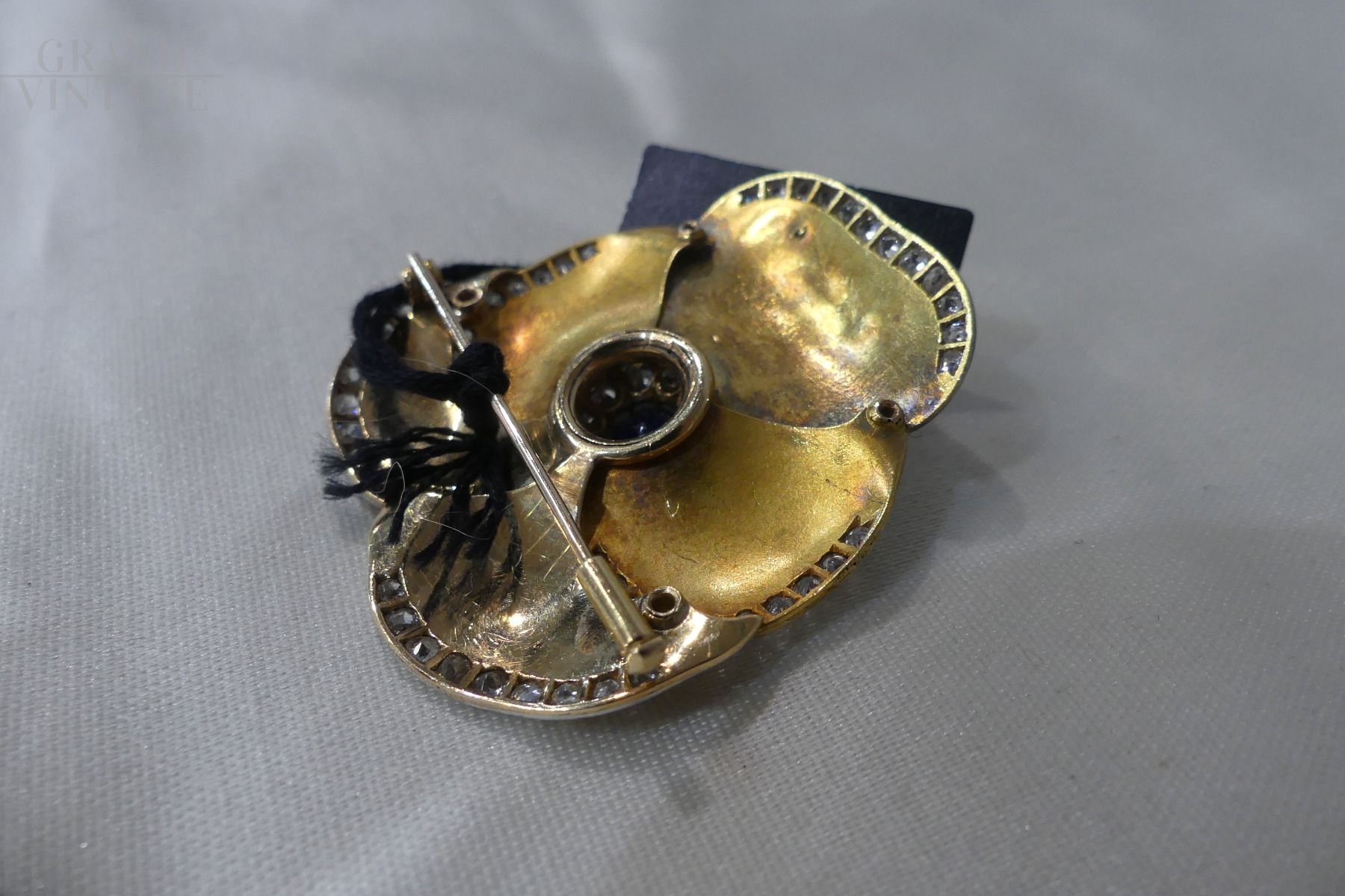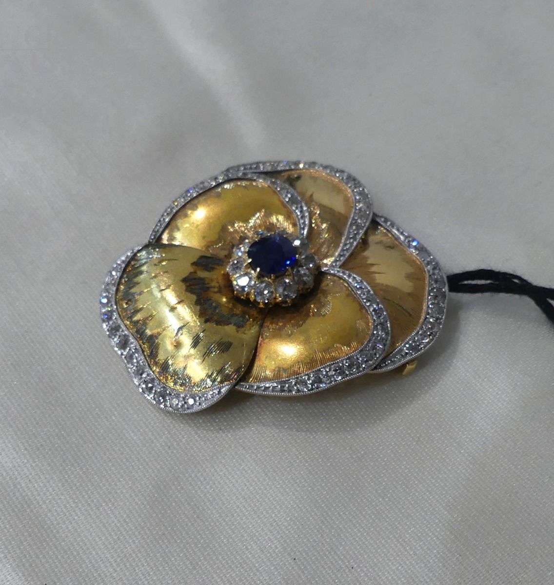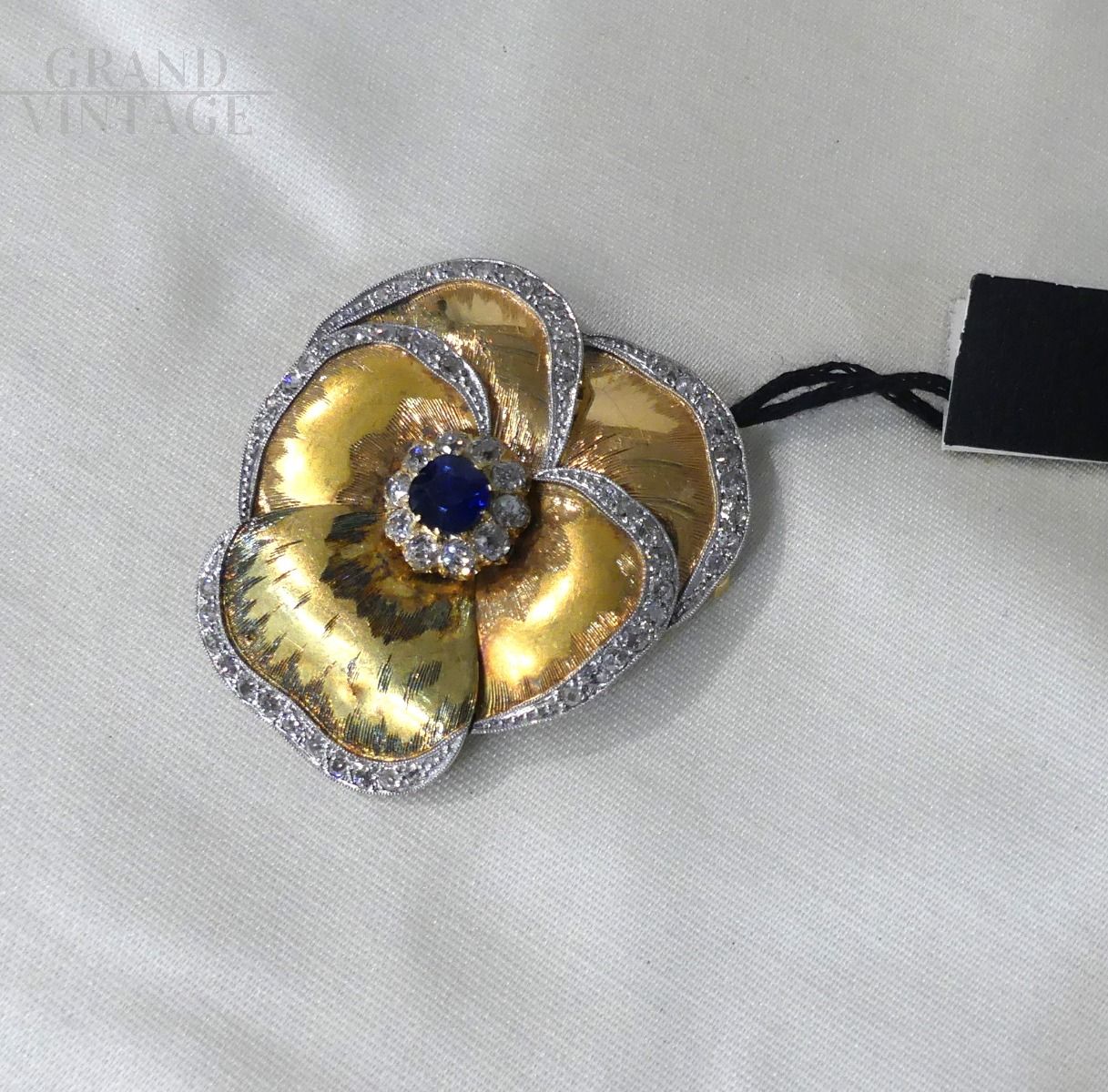 Precious vintage gold brooch in the shape of a violet with central sapphire of approximately 1.5 carats and diamonds of 2 carats, gold grams: 14.50. Original from the 60s.