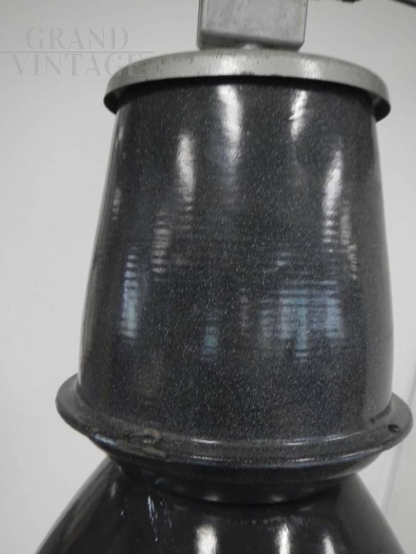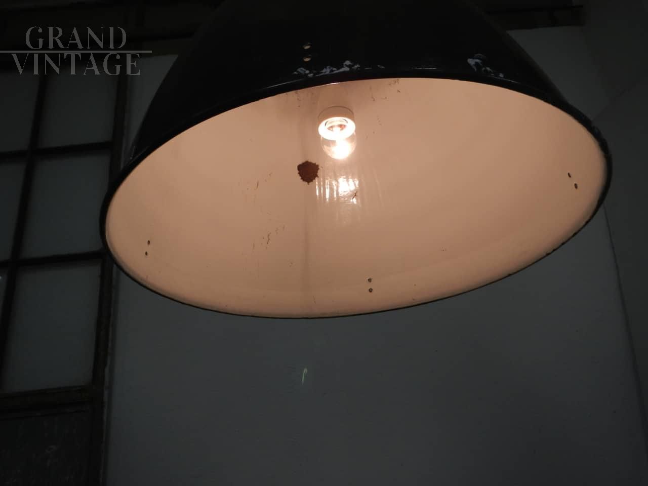 Czechoslovakian industrial lamp from the 1960s with black enamel exterior and white enamel interior, rewired and functional.