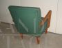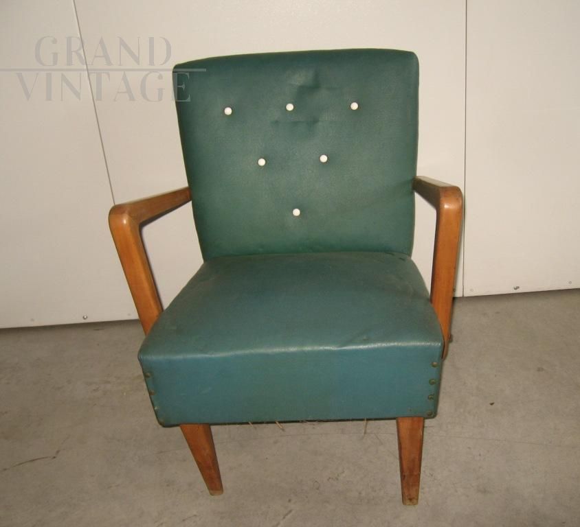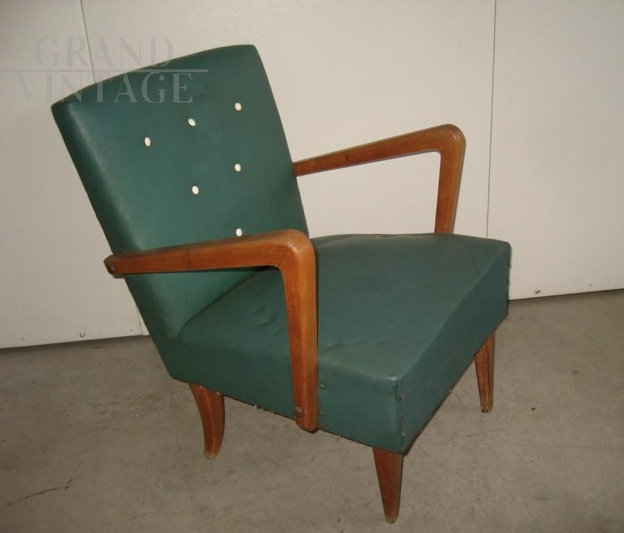 1960s armchair, Italian modern antiques, small size upholstered in green skai. Armrests and feet in fruit wood, typical 60s model. Structure in excellent condition: it does not need restoration. Original paint with small signs of age.The green skai upholstery has no breaks, the seat is in excellent condition.