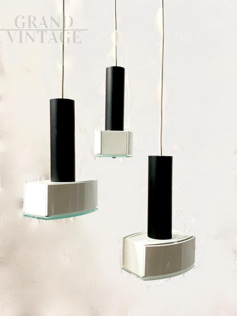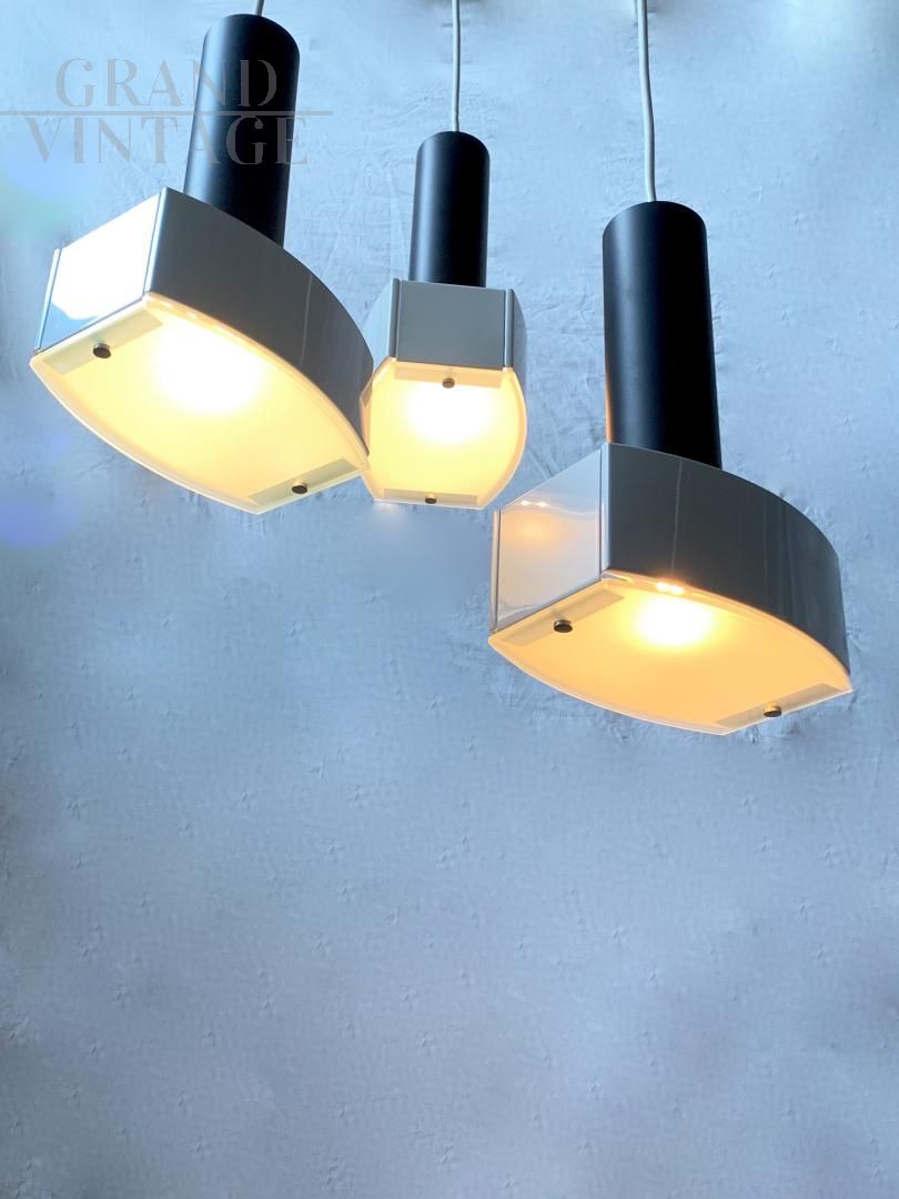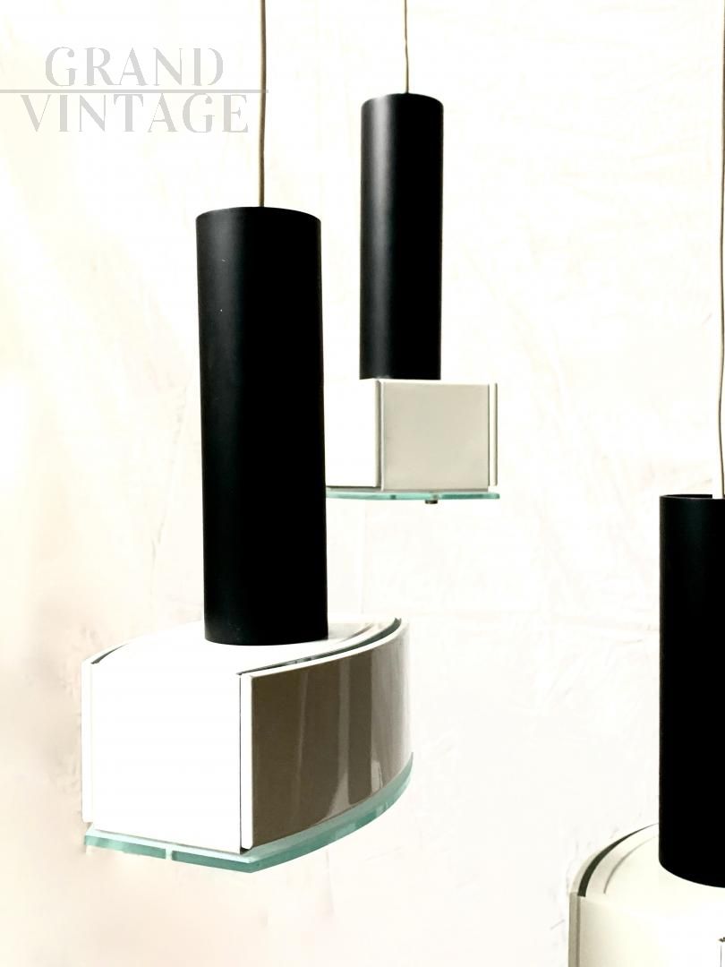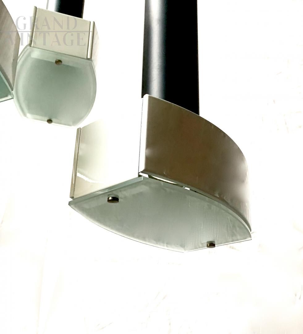 1970s chandelier from the Luci company, in excellent condition; working electrical system, each light has an E14 bulb attachment. The structure of each lampshade is in black and white lacquered metal, original colors, and the glasses can be removed. The glasses are original and beautiful, not cracked or chipped. The chandelier has been completely cleaned and revised, and fits well as a lighting on a table or in a passage area.