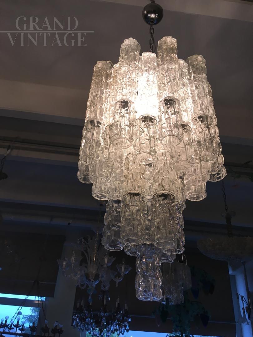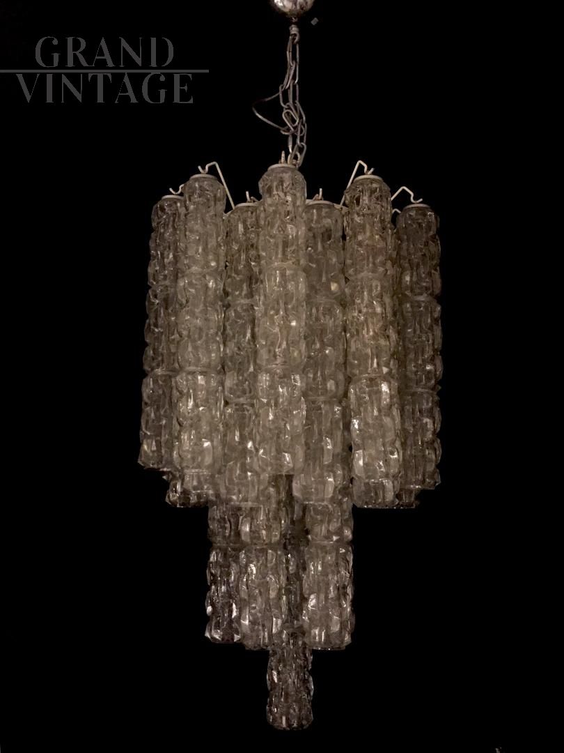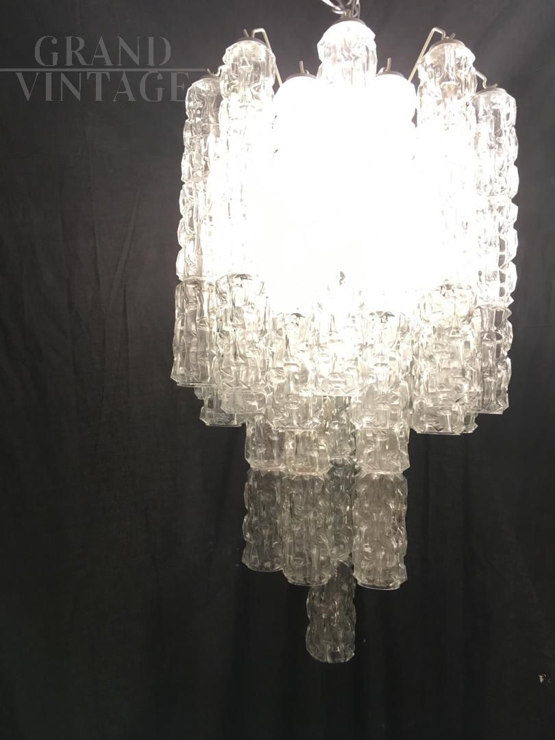Fantastic Murano glass tube chandelier, circa 1970s, all original and with electrical system redone. Attributed to the Venini company, uncracked glass. Note the beautiful and famous tubes inserted in this elegant chandelier. Transparent crystal color. Of course it has the signs of aging.