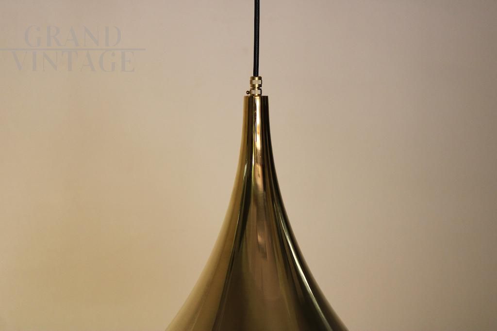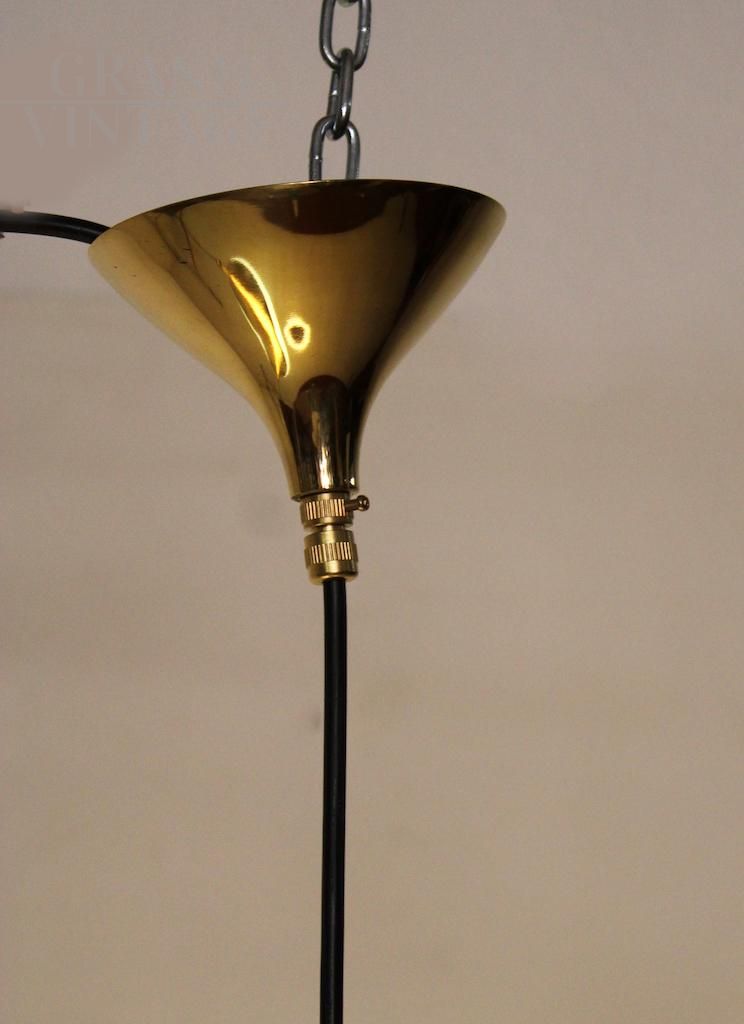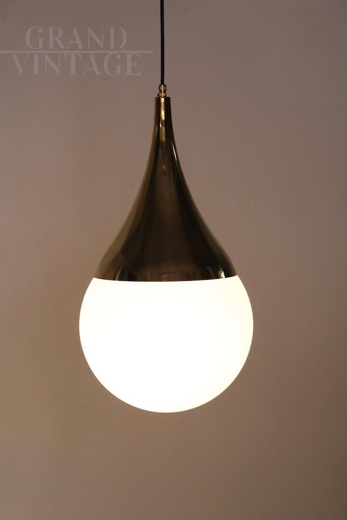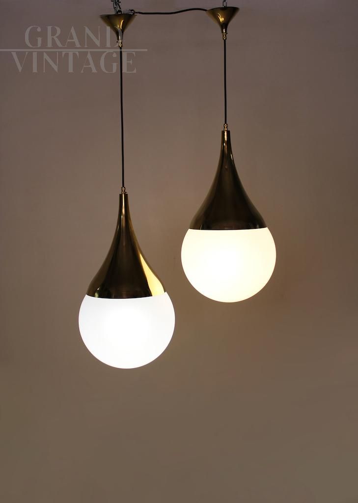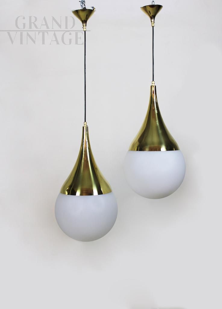 Elegant vintage Stilnovo style chandelier in brass and white opaline sphere glass, Italy 1970s. Pairs available, price refers to the single piece.