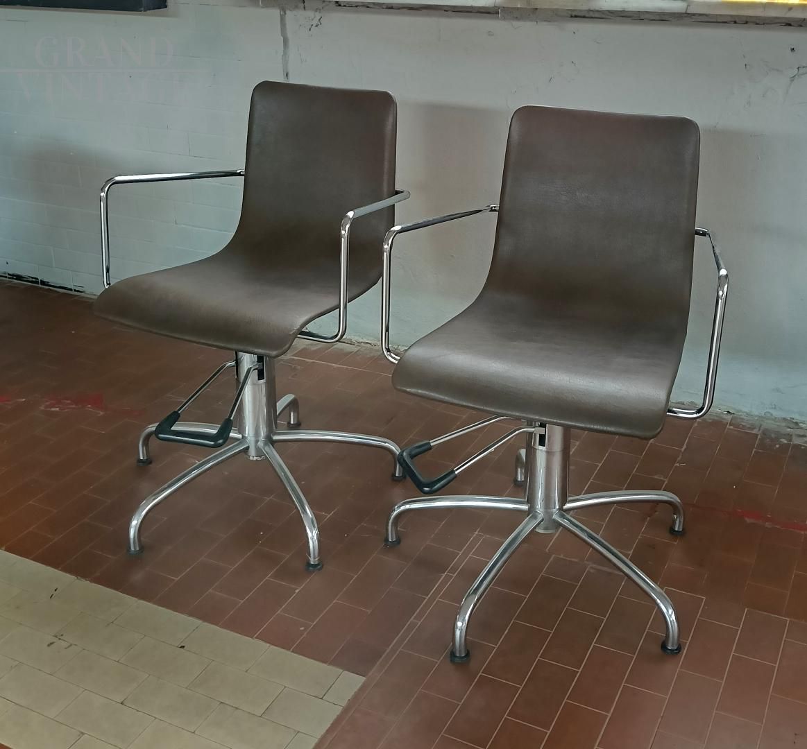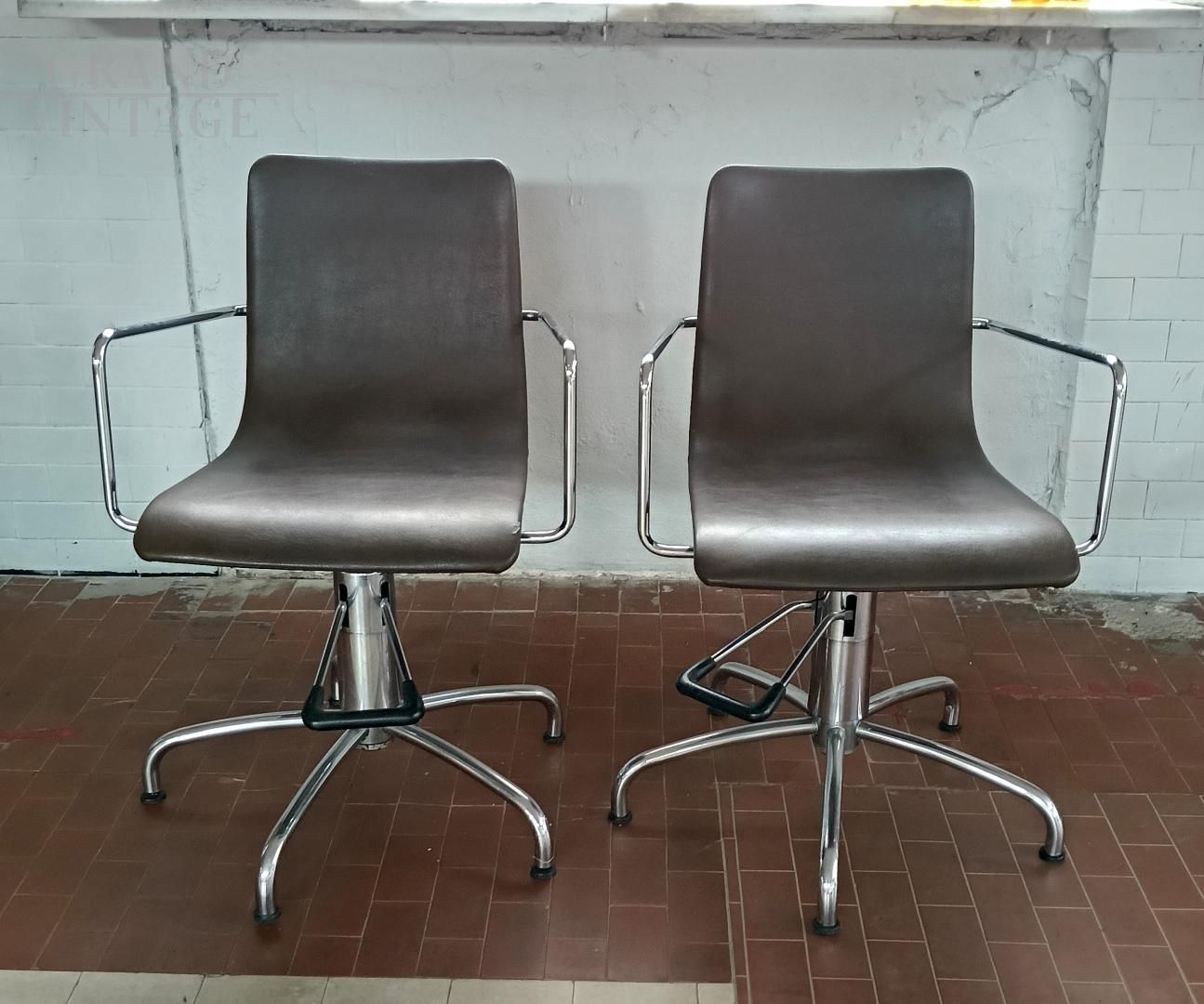 Vintage 1980s hairdressing chair with a steel frame and high-quality soft resin seat. The chairs are in good condition, but the height adjustment pumps could use an overhaul. They can also be used as multipurpose chairs. Four available, priced per chair.
