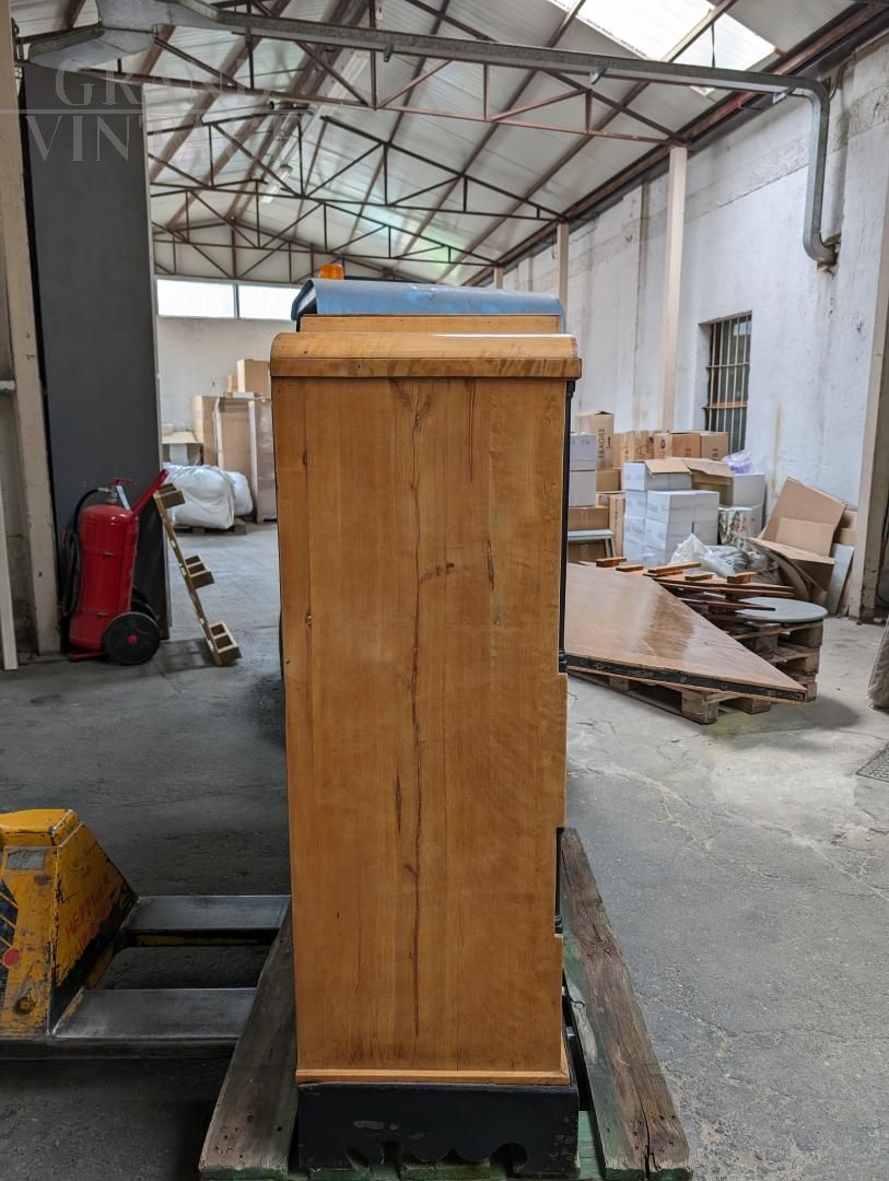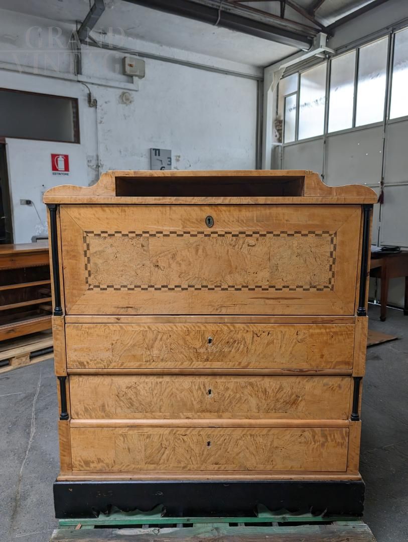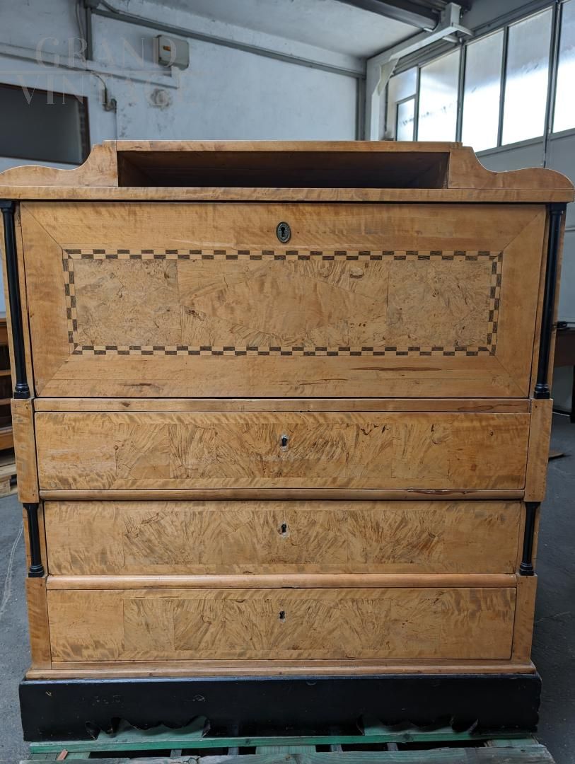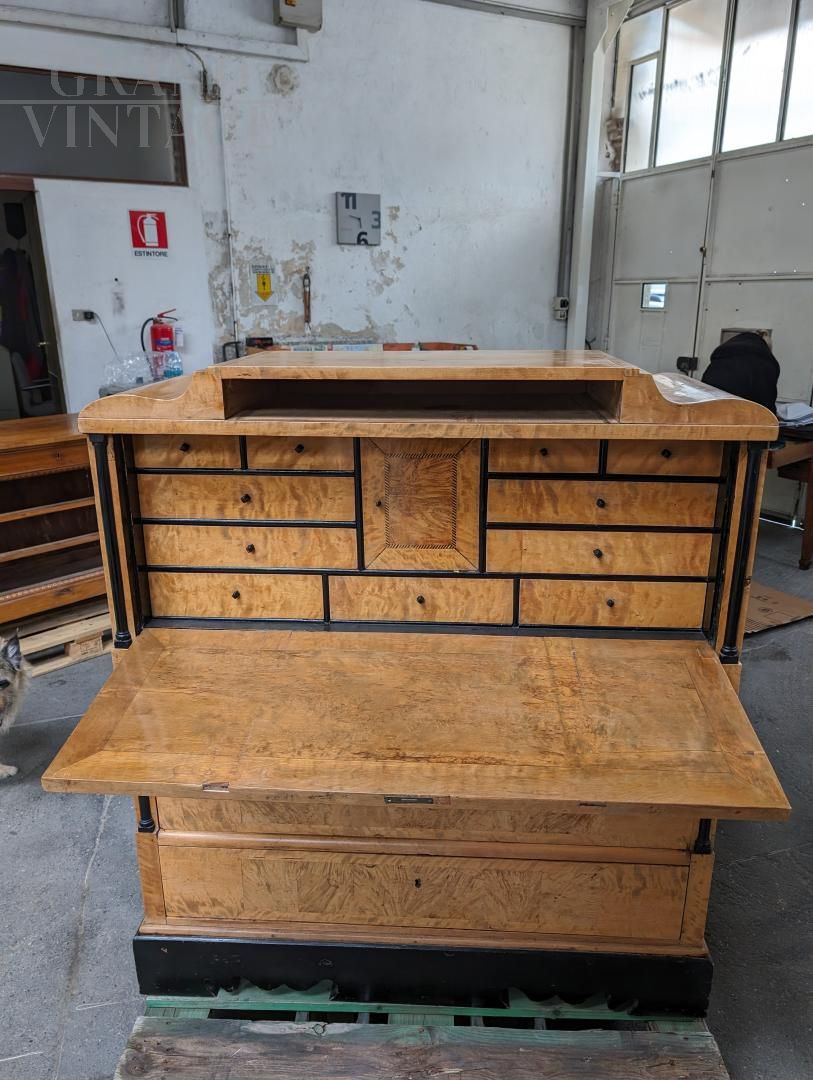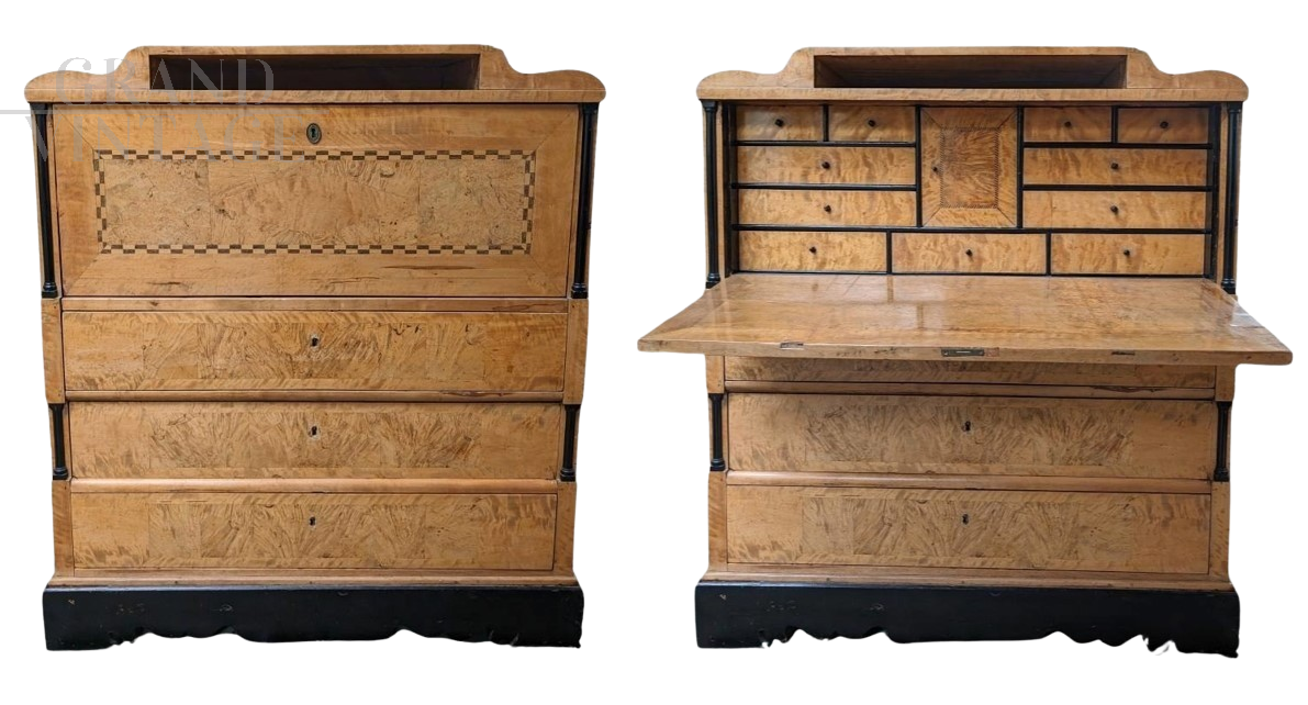 Antique secretaire from the Biedermeier era from the 19th century in beautiful birch briar with ebonized details, 3 front drawers and characteristic folding door that hides further drawers.