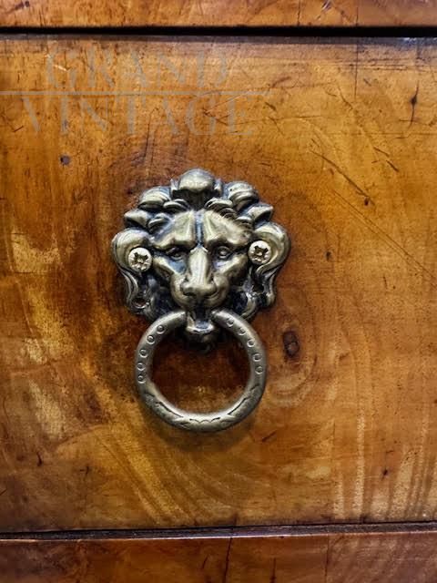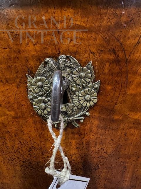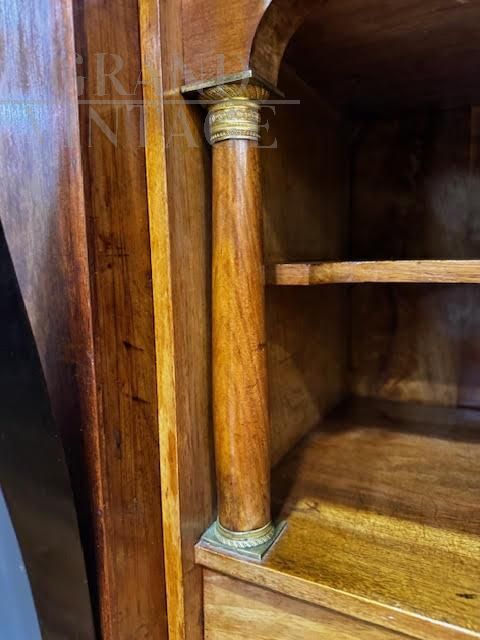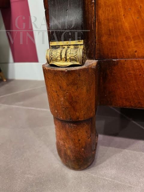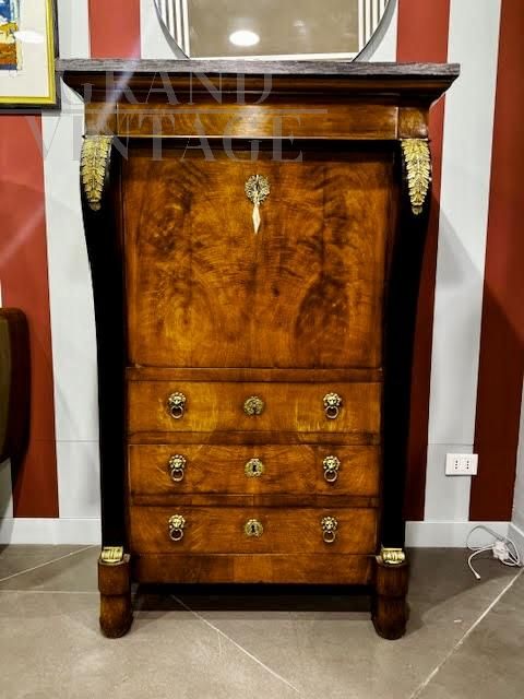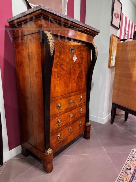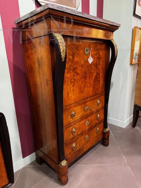 Italian secretary mid 19th century in walnut and walnut crotch, front with three drawers plus one under the lid, drop-leaf door concealing small drawers with open compartment delineated by small lateral columns embellished with chiseled brass fittings. The front also has ebonized tie lateral pilasters and decorated with gilded bronze elements. The upper surface has the original marble. Size 97 x 51 x h 152 cm The secretary is in good condition with slight signs of wear due to time and use.