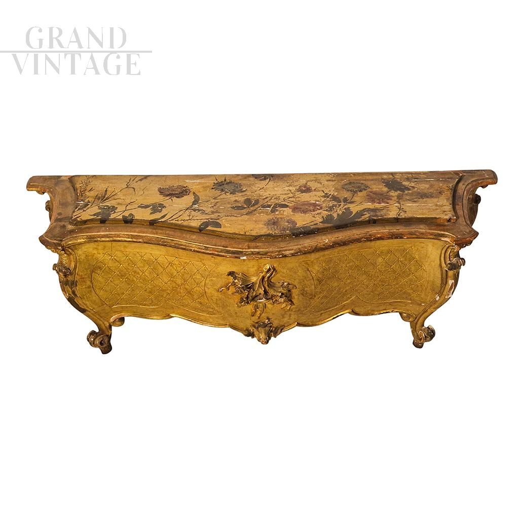 Elegant low console in antique French style made of gilded wood with wavy front and sides, parts carved with floral motifs and comma-shaped legs ending in a curl. The console top is finely decorated with various hand-painted polychrome flowers and leaves.