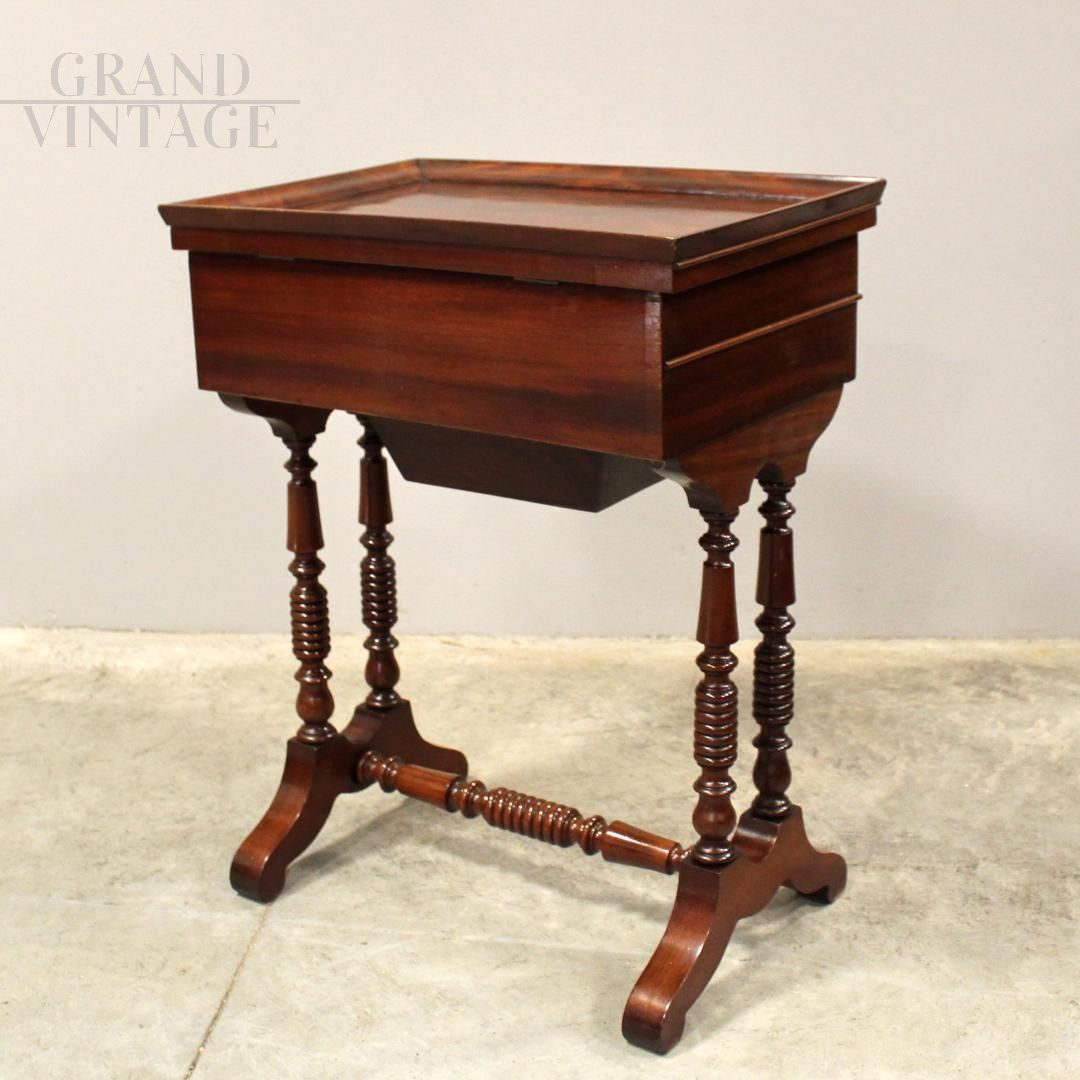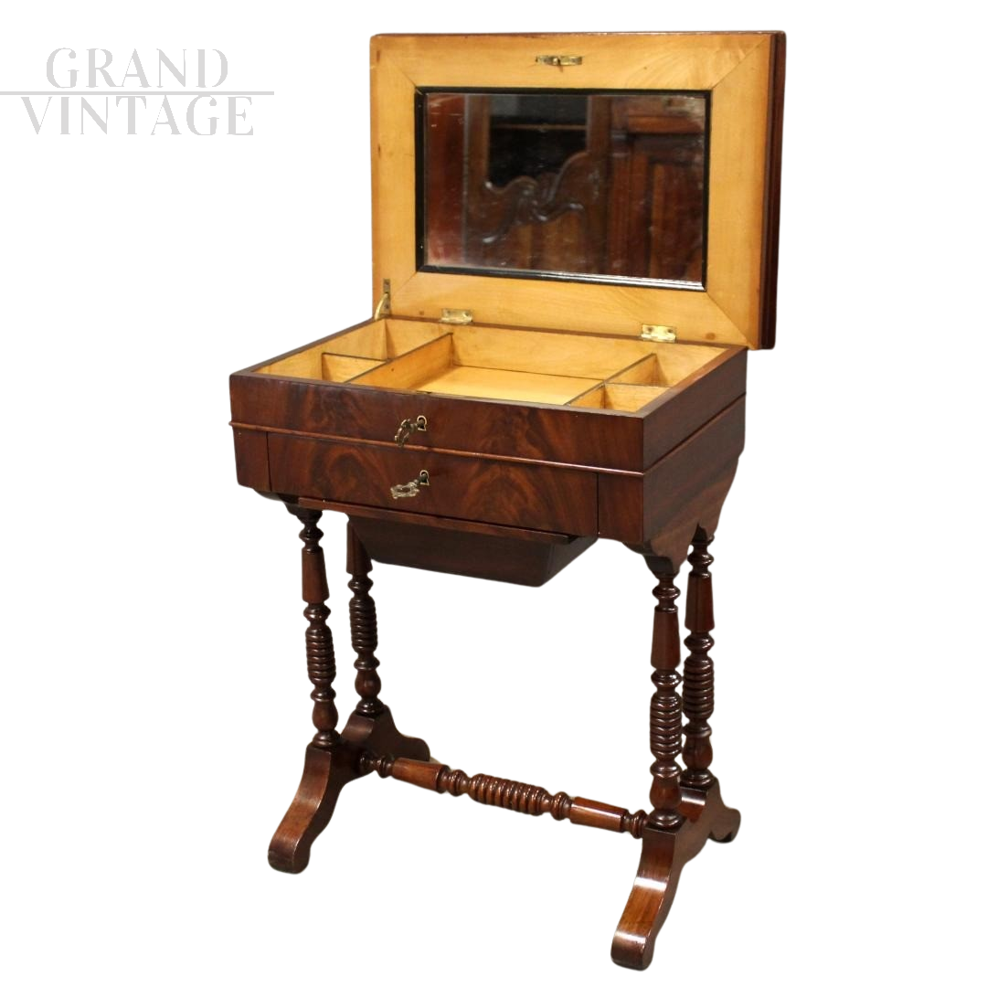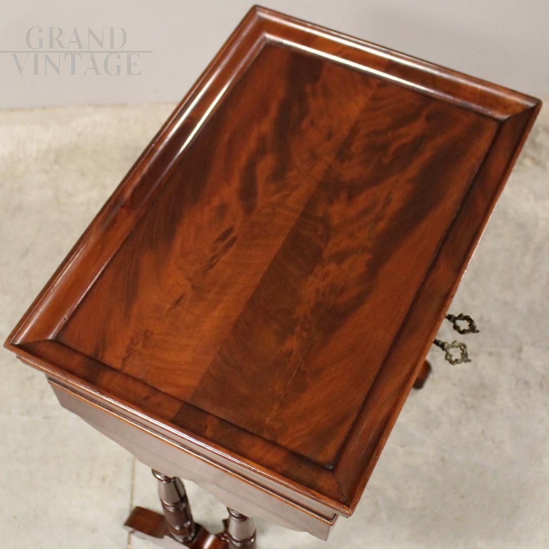 Antique sewing table in dark mahogany wood and mahogany feather, with mirror and spool-turned legs, period: second half of the 19th century, restored.