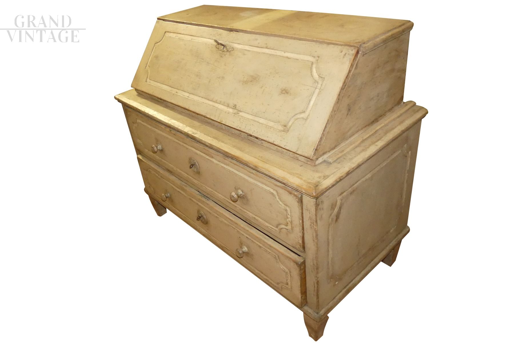 Beautiful chest of drawers with drop-down desk from the early 19th century of Italian origin, in white paint. Made of fir wood, it has an opening top and two internal drawers.