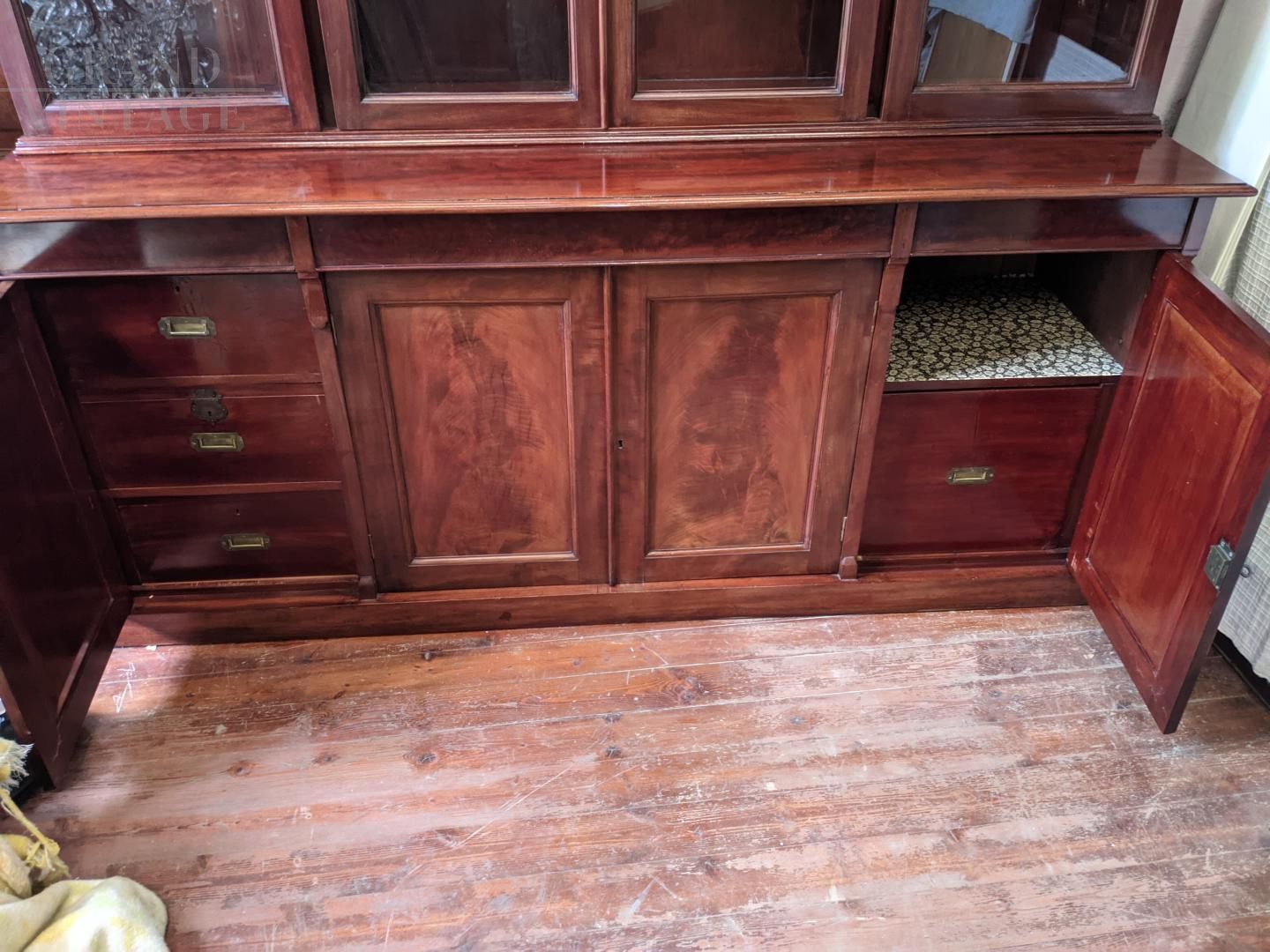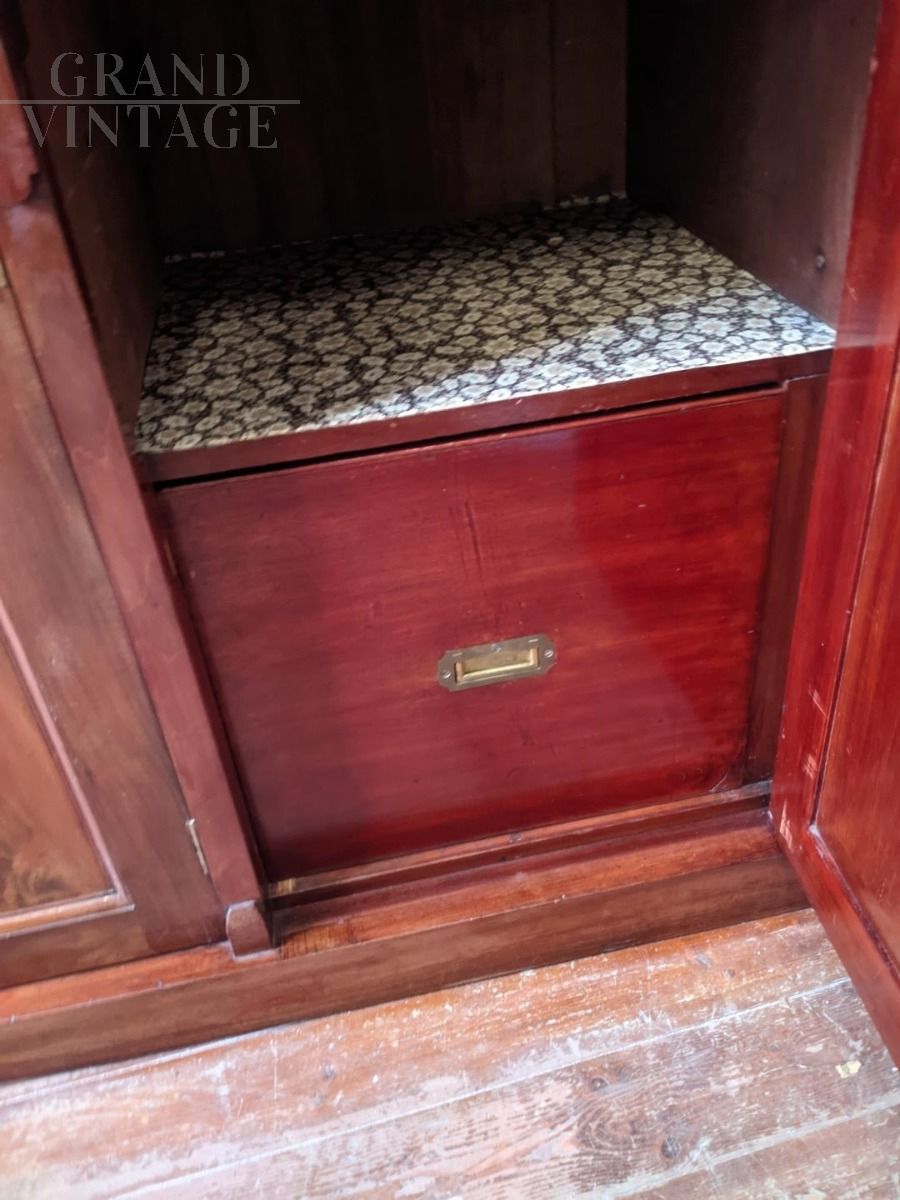 Antique English Victorian period bookcase in mahogany wood, 19th century, consisting of an upper part with 4 glass doors and internal shelves, and a lower part with compartments and removable drawers. Elegant and large piece of furniture, it matches any style of furniture.