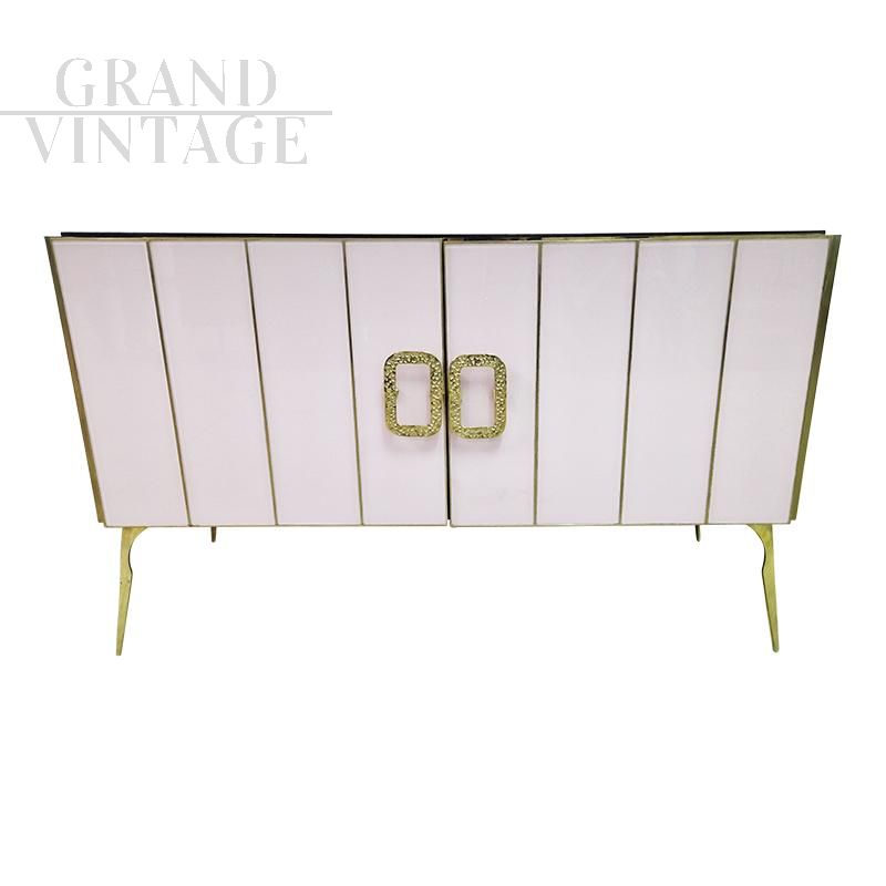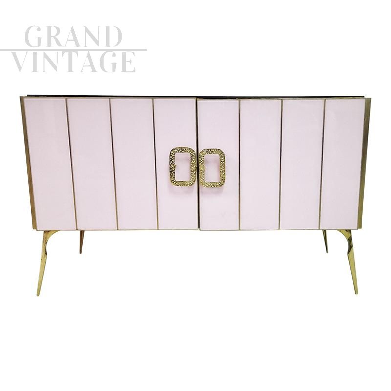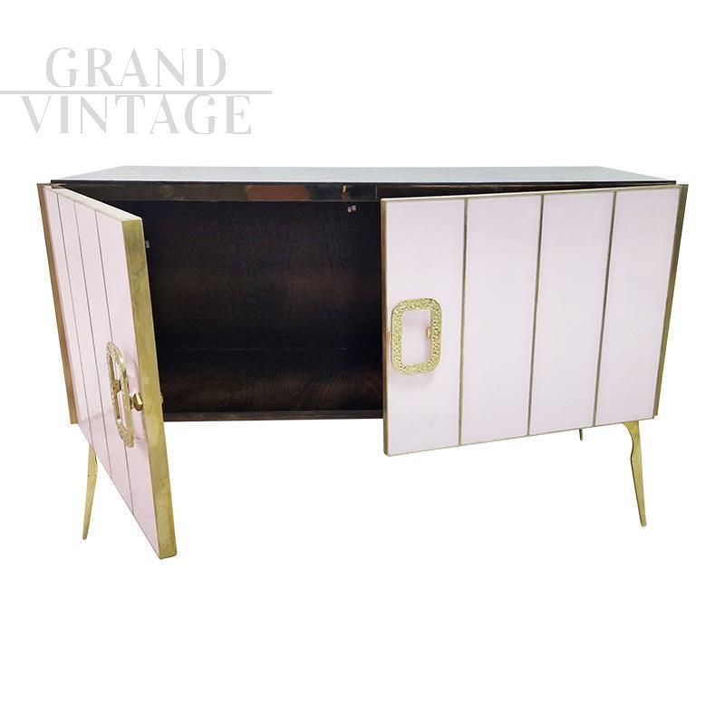 Two-door sideboard entirely handmade, with wooden structure covered in pink and black glass; profiles, handles and feet in golden brass.