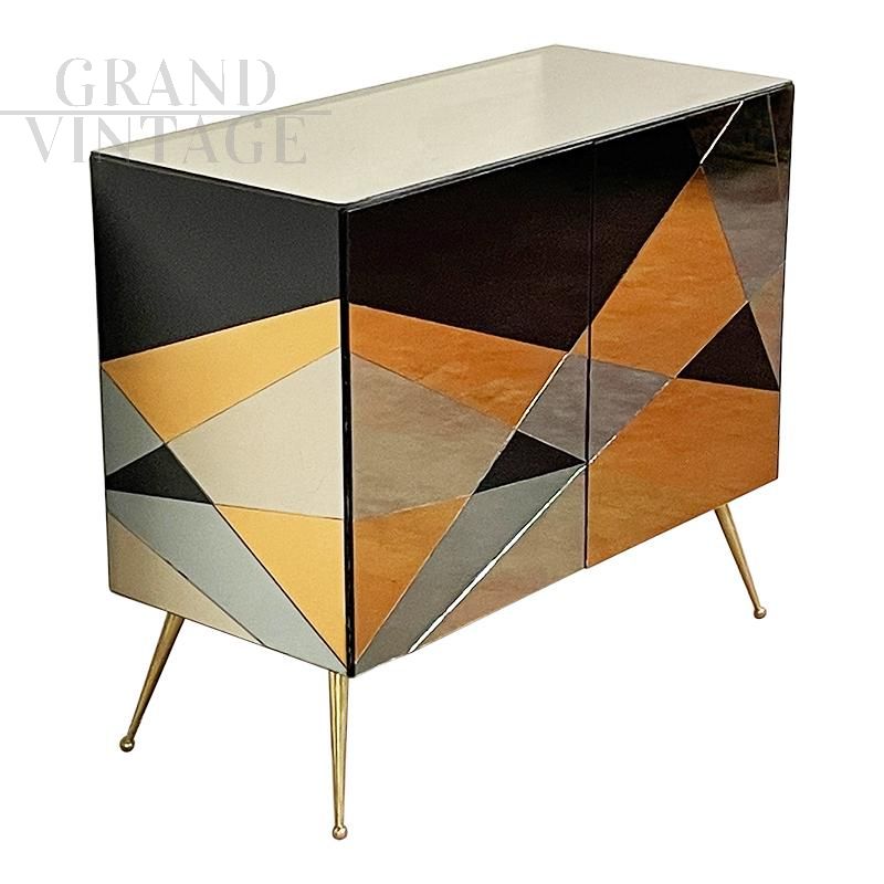 Design sideboard with two push-pull doors entirely handmade, with wooden structure covered in mirrored glass; profiles, handles and feet finishes in golden brass, equipped with internal shelf.