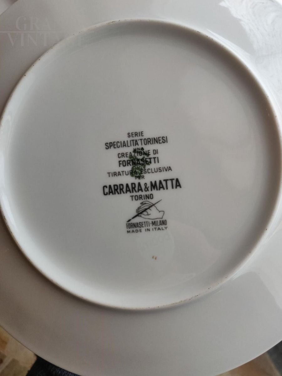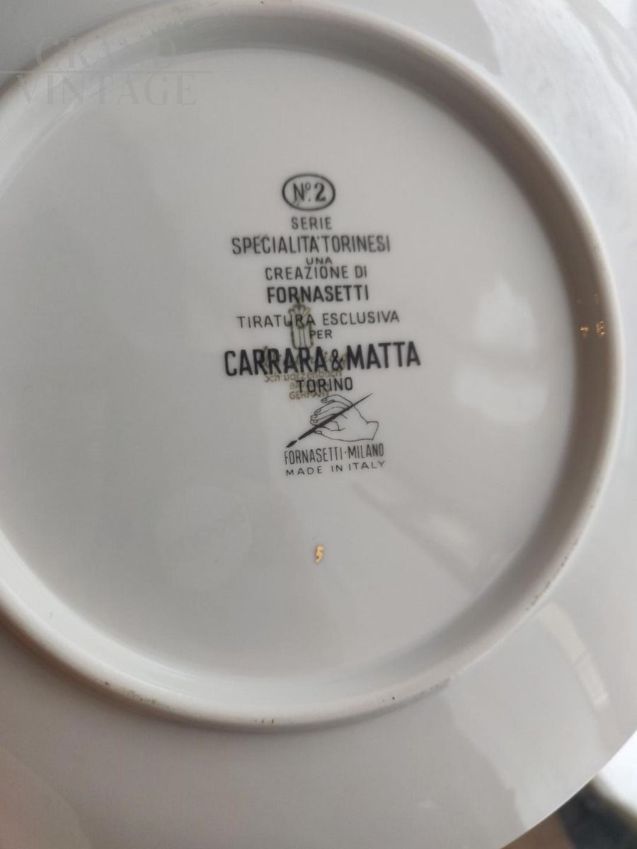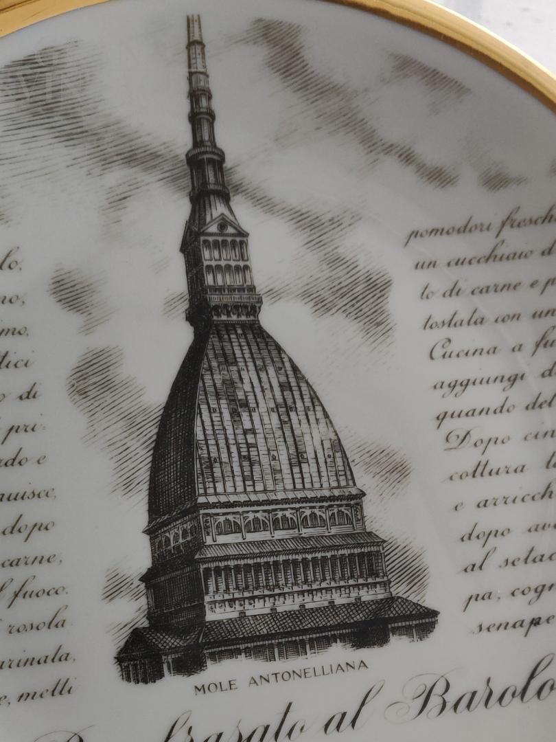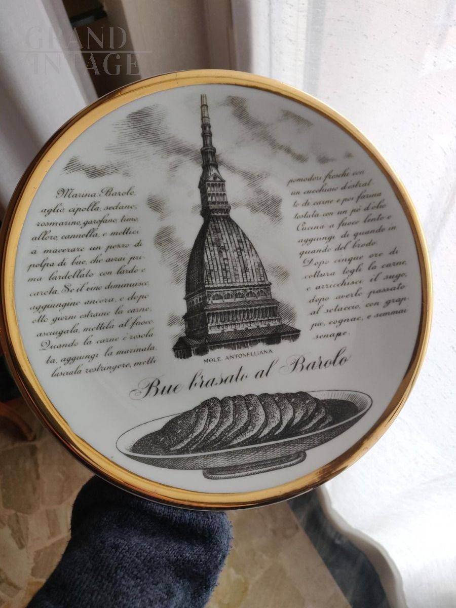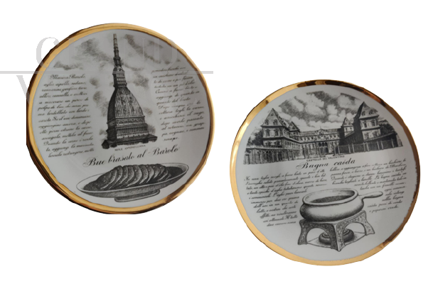 2 original Fornasetti plates with golden edge, Specialità Torinesi series, created by Fornasetti, exclusive edition for Carrara & Matta Torino.