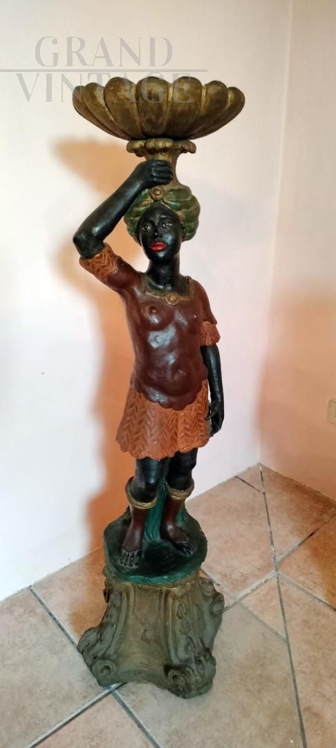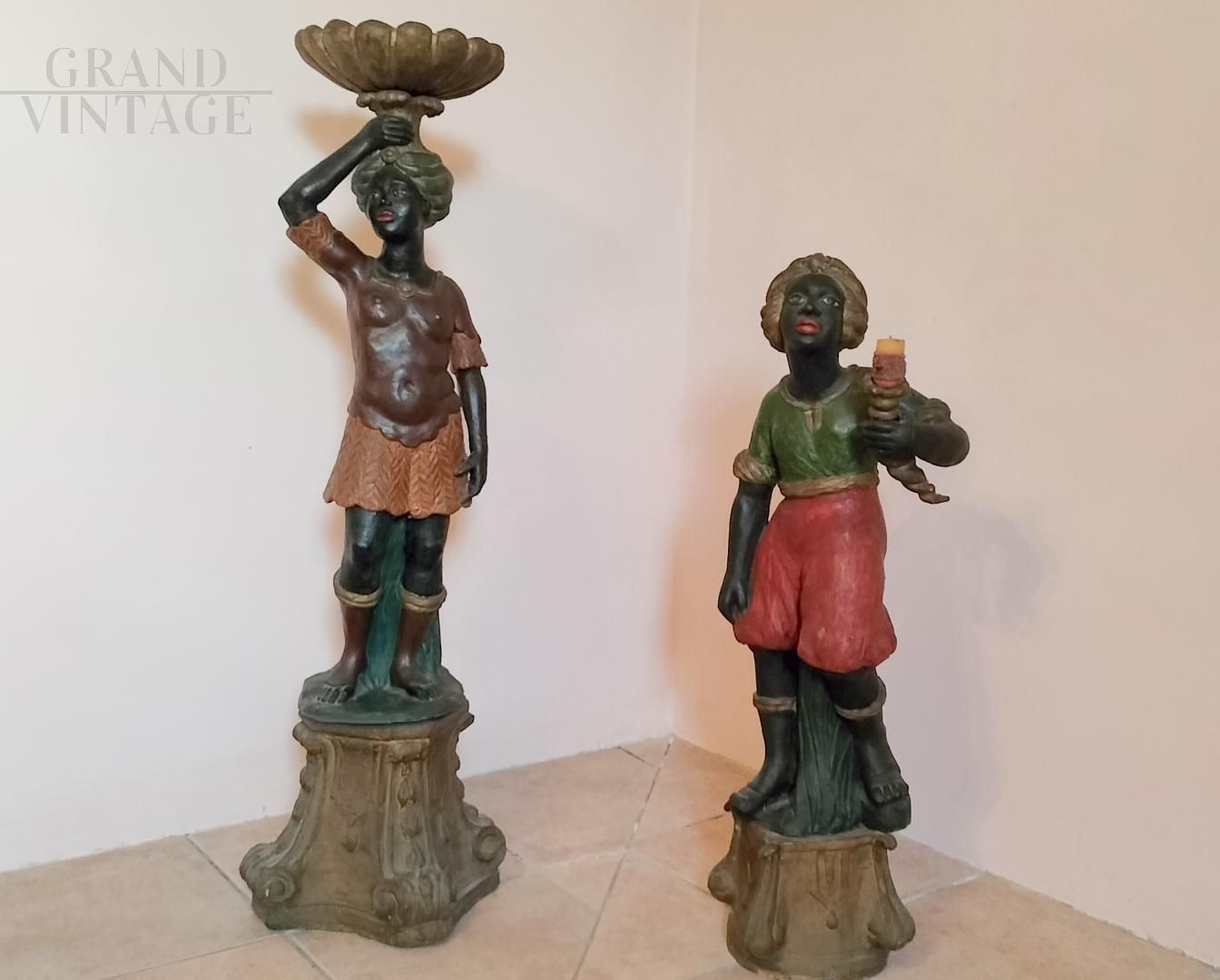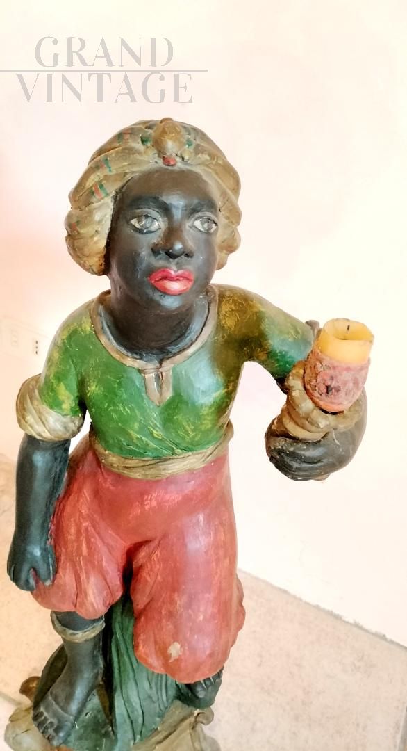 Pair of rare ancient sculptures of Venetian Moors in polychrome terracotta from the 17th century, one figure wears a turban and a fruit or flower vase, the other smaller one holds a candle holder, both on a shaped support with a tree trunk, leaning on the relative supports . Excellent state of preservation, without defects or firing defects, unrestored.